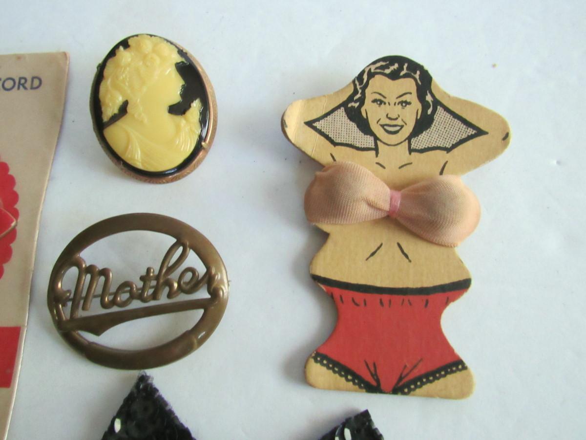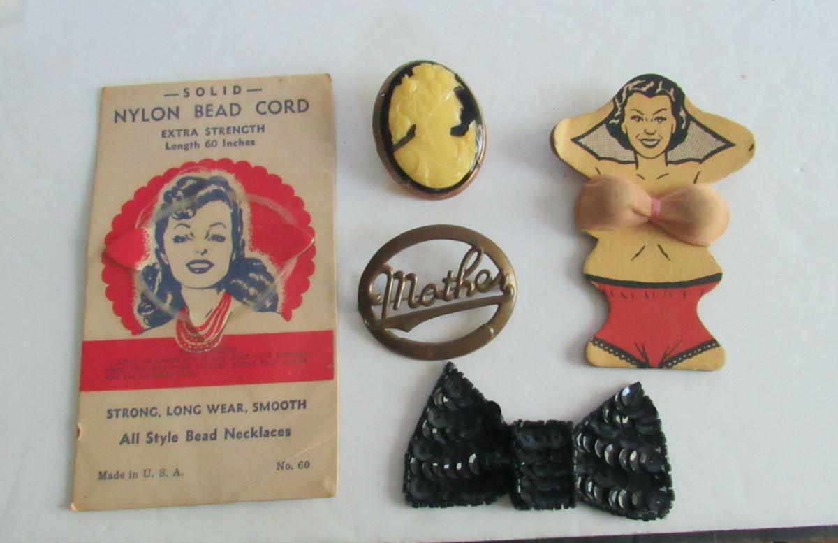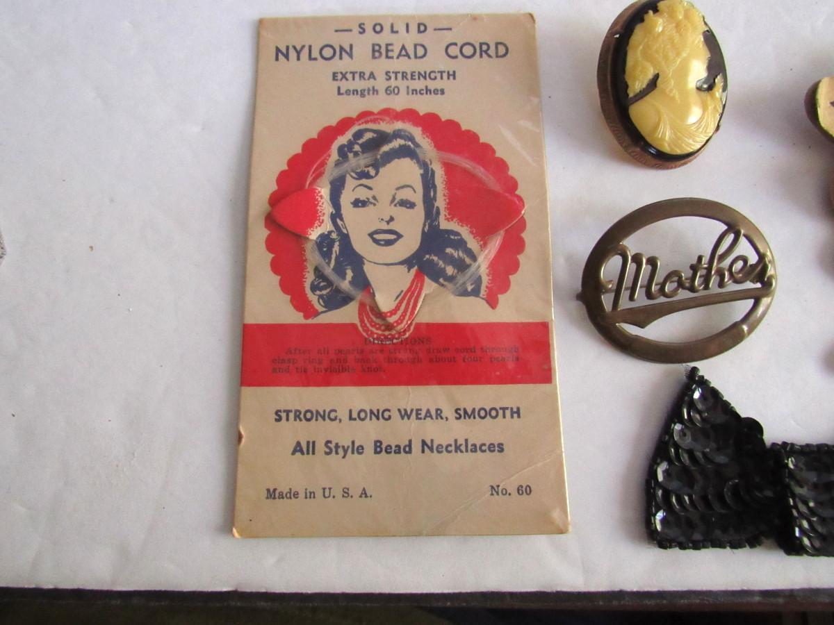 Sequin embellishment for dress or shoe? Bead cord. I think the cameo is plastic. Interesting lot. Shipping is available at actual shipping cost plus $5.00 handling fee per box for supplies/labor. See our terms for details. All sales are final. Condition notes may not be all inclusive, we may miss some issues as most vintage items are not in mint condition and have some degree of wear, paint loss, etc, but we always try to note obvious damage.
