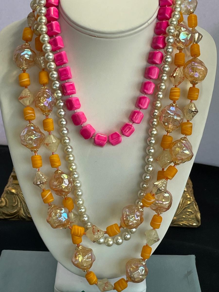 6 necklaces and 2 pierced earrings. Faux pearls measure over 7 feet long!
