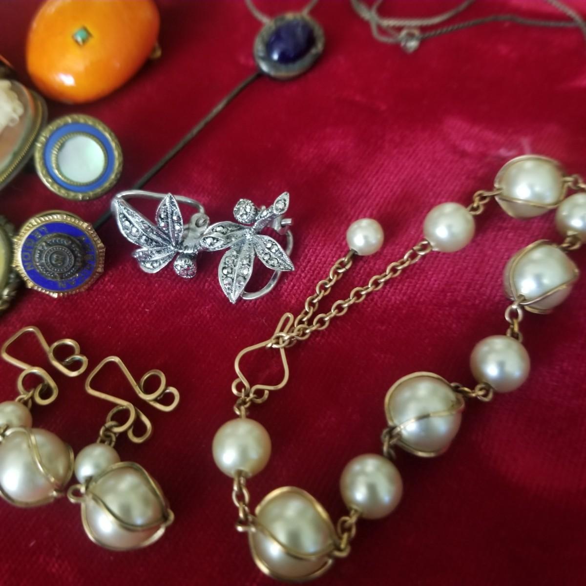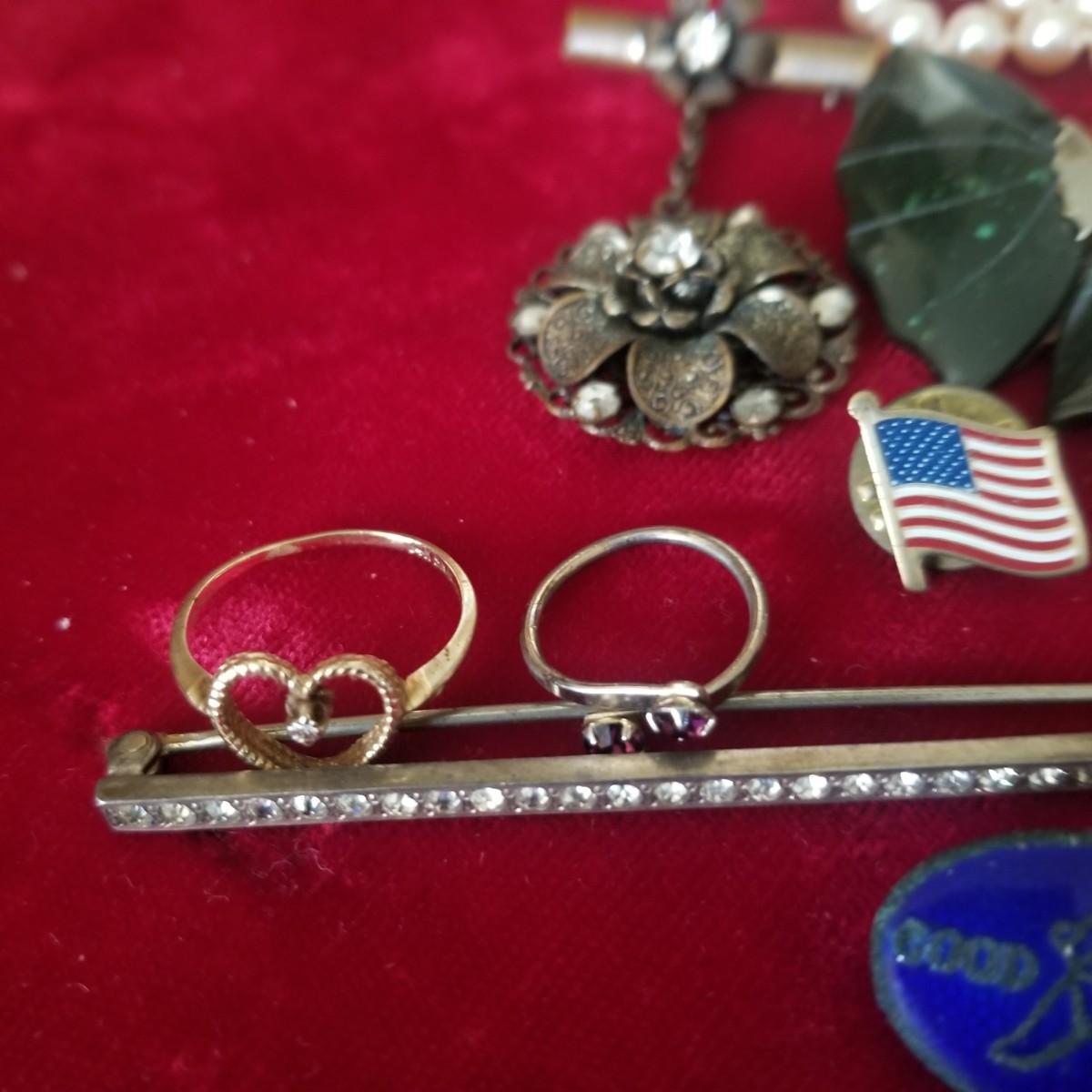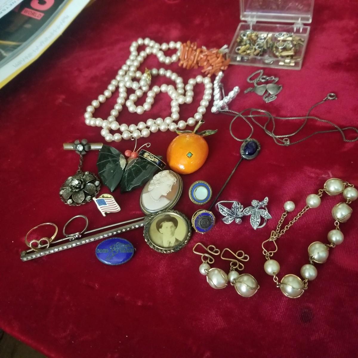 Assorted pins, some sterling, some costume, and more