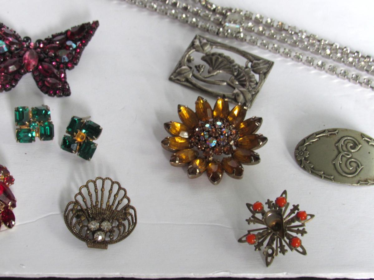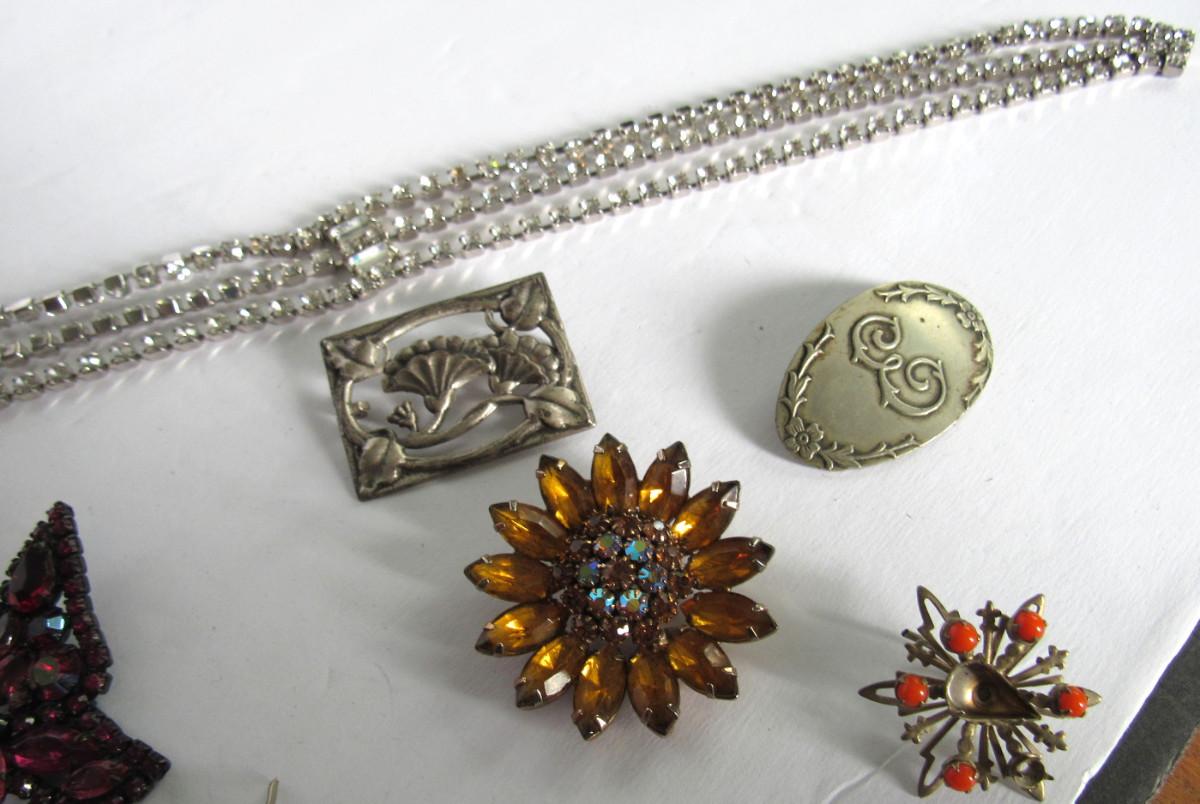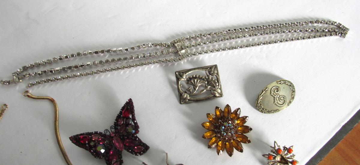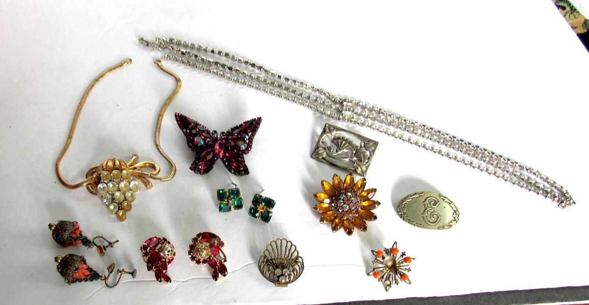 These pieces need repair of some kind, needing either a pin back, earring back, stones, etc. The little brass colored coral earrings that look like baskets need no repair but a good cleaning. The silver floral brooch is sterling but needs a back pin. The German Silver oval brooch needs a back pin. Earrings need backs. I have no idea what the piece is with orange cabachons, has a strange back, needs stones. Sunflower pin needs a back pin, very nice otherwise. Bow shaped necklace needs a good cleaning and a clasp. Marked Trifari. The rhinestone choker needs to be attached on one end and need a clasp. The rhinestone butterfly brooch is so pretty, just needs a pin repair on back and will be beautiful again! Shipping is available at actual shipping cost plus $5.00 handling fee per box for supplies/labor. See our terms for details. All sales are final. Condition notes may not be all inclusive, we may miss some issues as most vintage items are not in mint condition and have some degree of wear, paint loss, etc, but we always try to note obvious damage.