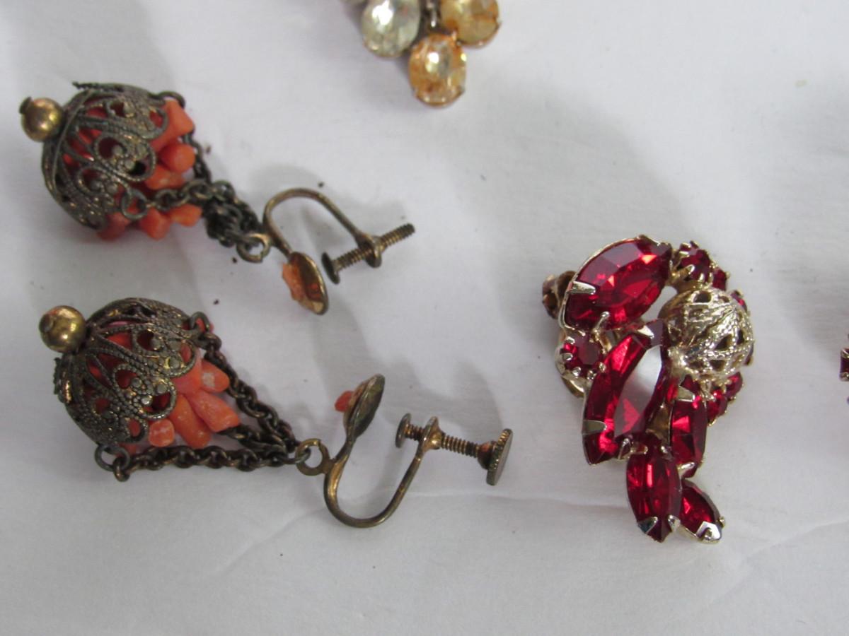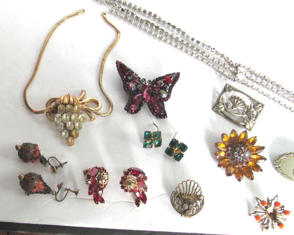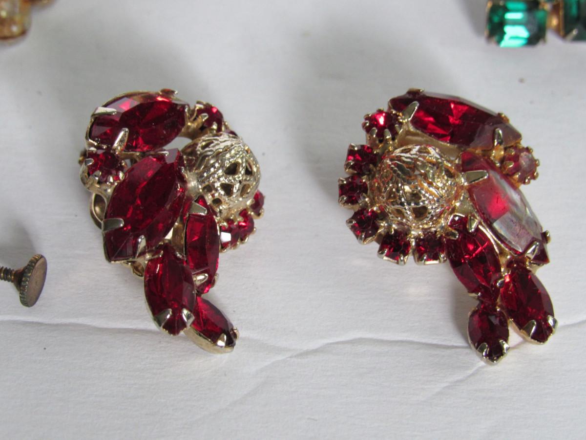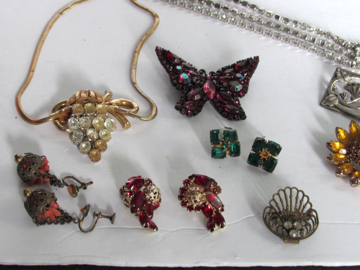 These pieces need repair of some kind, needing either a pin back, earring back, stones, etc. The little brass colored coral earrings that look like baskets need no repair but a good cleaning. The silver floral brooch is sterling but needs a back pin. The German Silver oval brooch needs a back pin. Earrings need backs. I have no idea what the piece is with orange cabachons, has a strange back, needs stones. Sunflower pin needs a back pin, very nice otherwise. Bow shaped necklace needs a good cleaning and a clasp. Marked Trifari. The rhinestone choker needs to be attached on one end and need a clasp. The rhinestone butterfly brooch is so pretty, just needs a pin repair on back and will be beautiful again! Shipping is available at actual shipping cost plus $5.00 handling fee per box for supplies/labor. See our terms for details. All sales are final. Condition notes may not be all inclusive, we may miss some issues as most vintage items are not in mint condition and have some degree of wear, paint loss, etc, but we always try to note obvious damage.