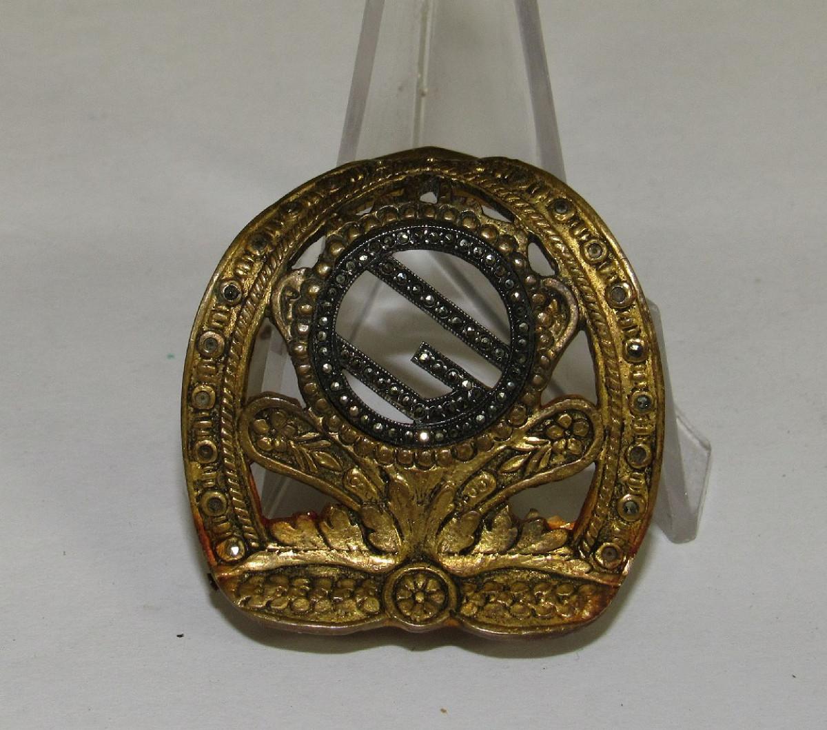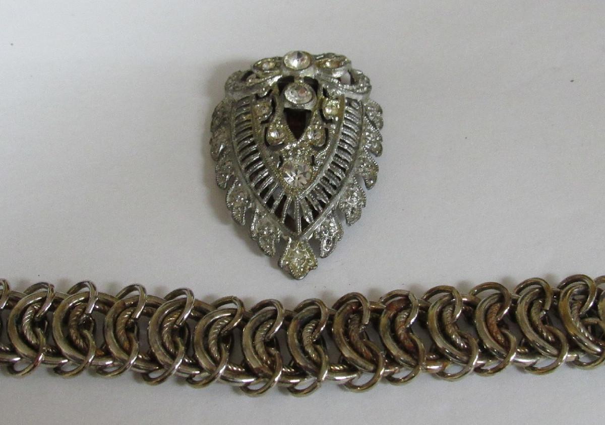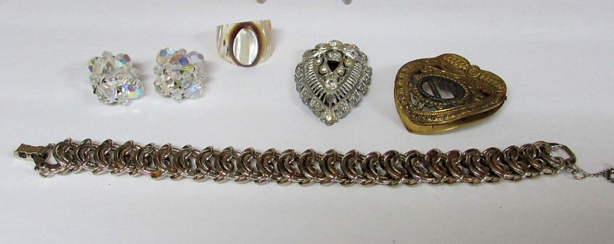 I think the brass clip has tiny marcasite stones, the rhinestone clip some stones are turning yellowish. The bracelet is tarnishing and needs a good cleaning. The shell ring is very unusual but fits a very small finger. Shipping is available at shipping cost plus $5.00 handling fee on one box, $10.00 handling fee on two boxes, $15.00 handling fee on 3 boxes. Helps cover shipping materials and labor cost.