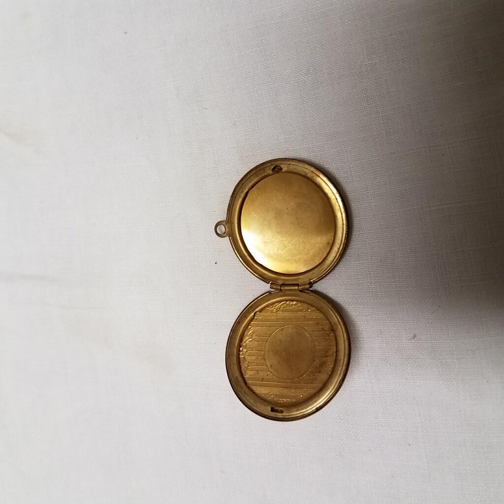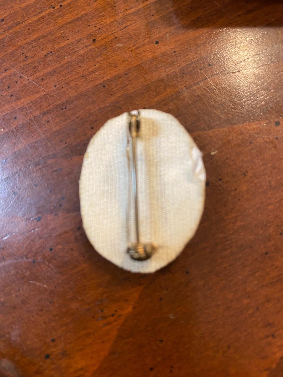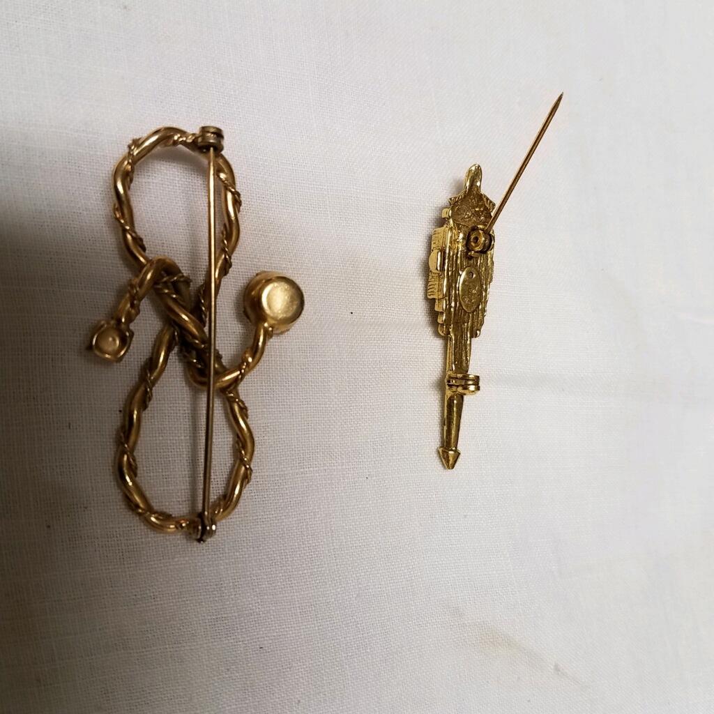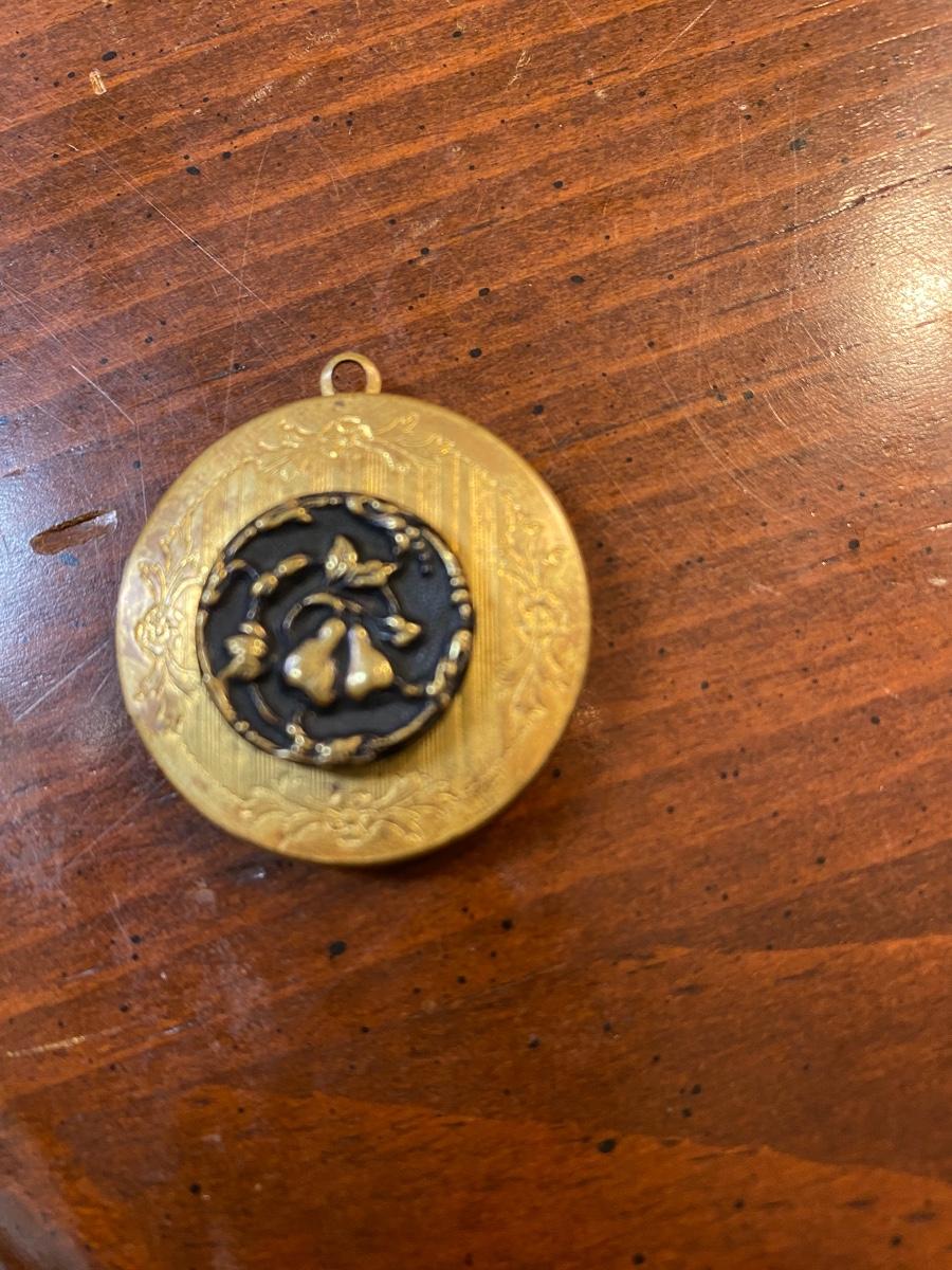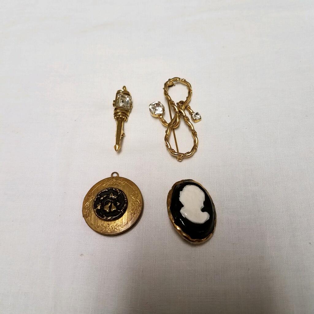 Vintage Jewelry Lot P: 1 brass locket w/floral etching, 1 Lamp post pin marked Goldette, 1 Ceramic Cameo brooch