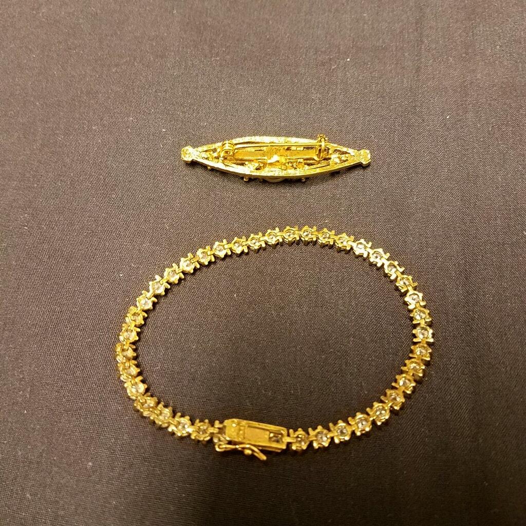 Vintage Jewelry Lot Q, CZ bracelet marked 925. It is gold colored. Pin is marked RS, Enamel MOP