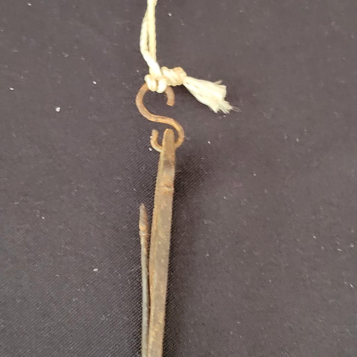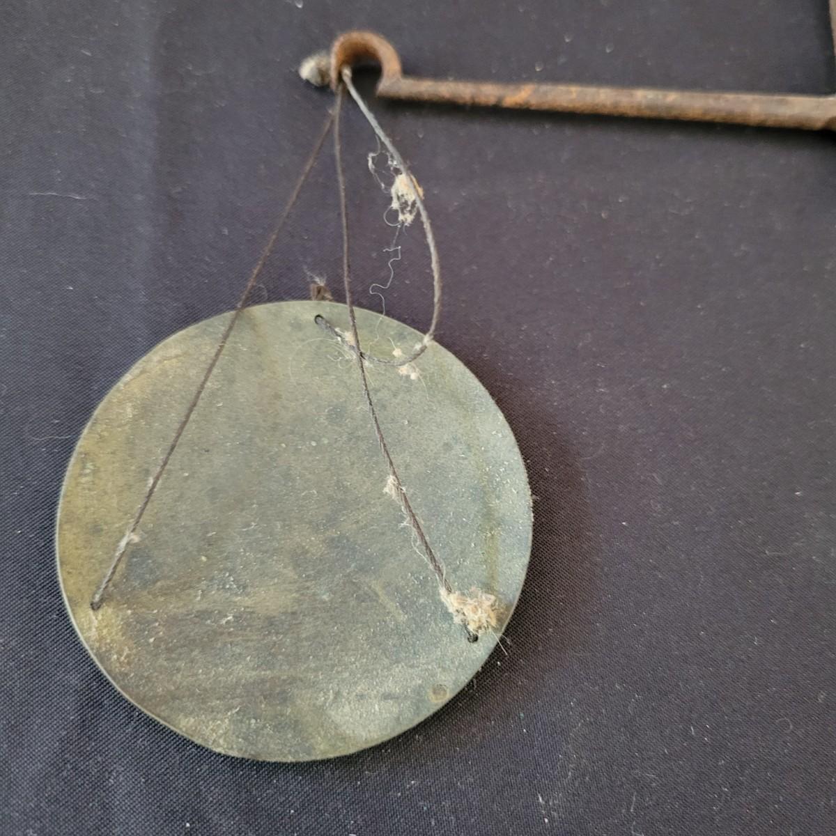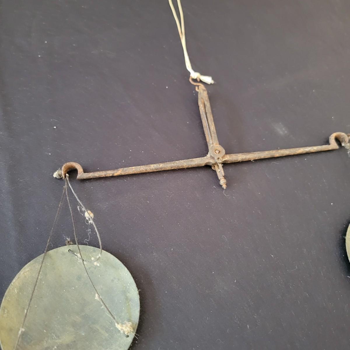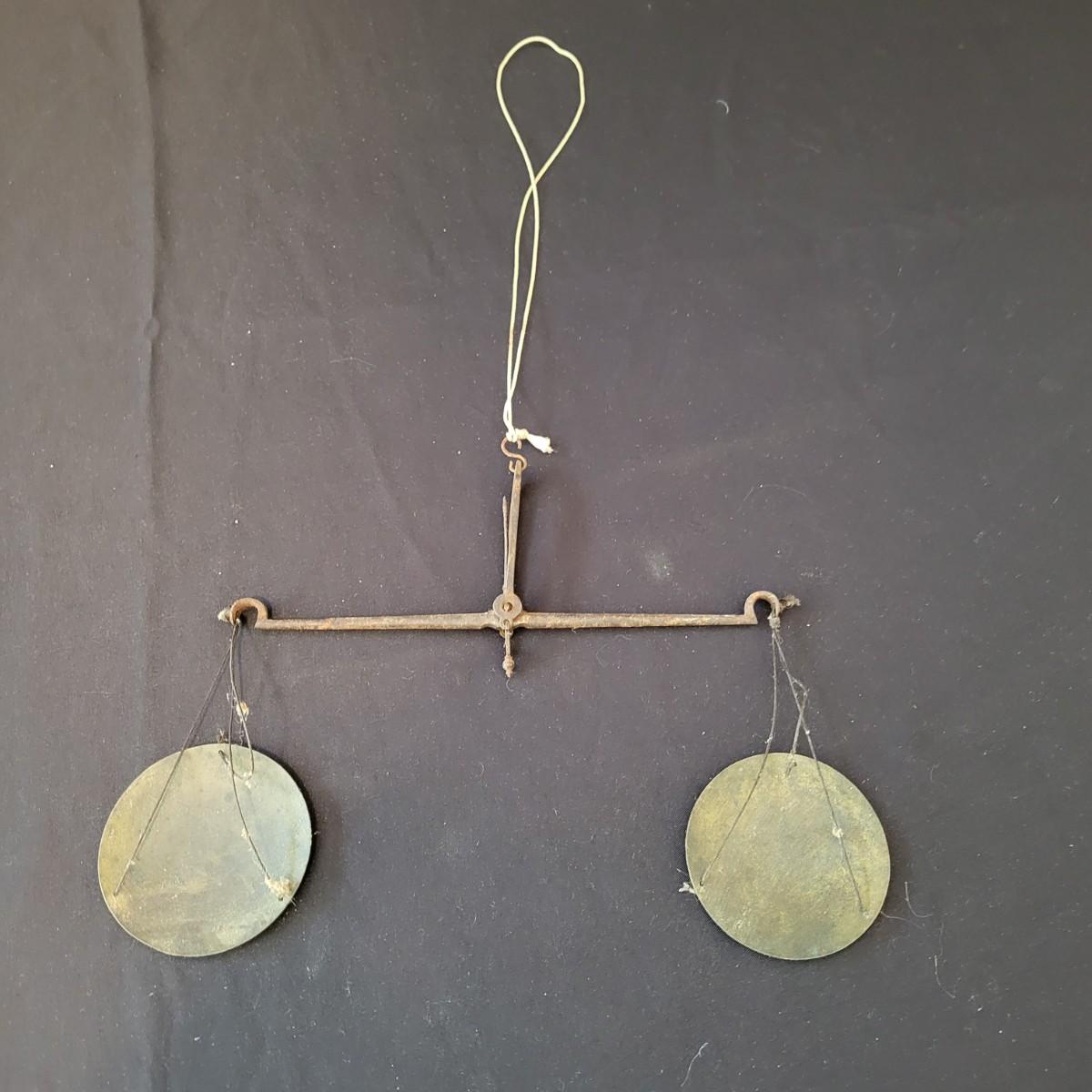 Vintage hand held jeweler's balance scale. Appear to be brass bowls attached to what appears to be iron balance. Some patina, but in usable condition. Measures approximately 7" x 6" Shipping available