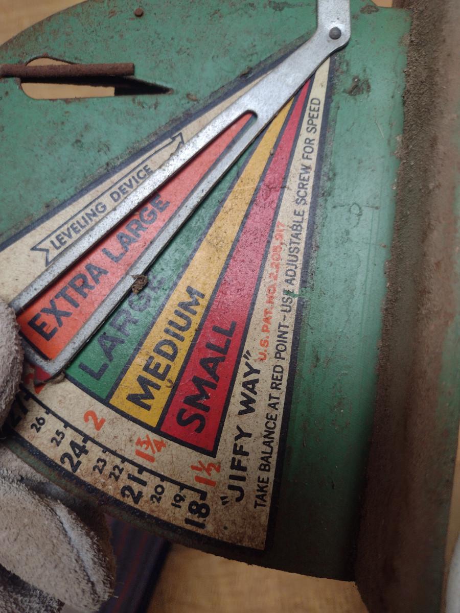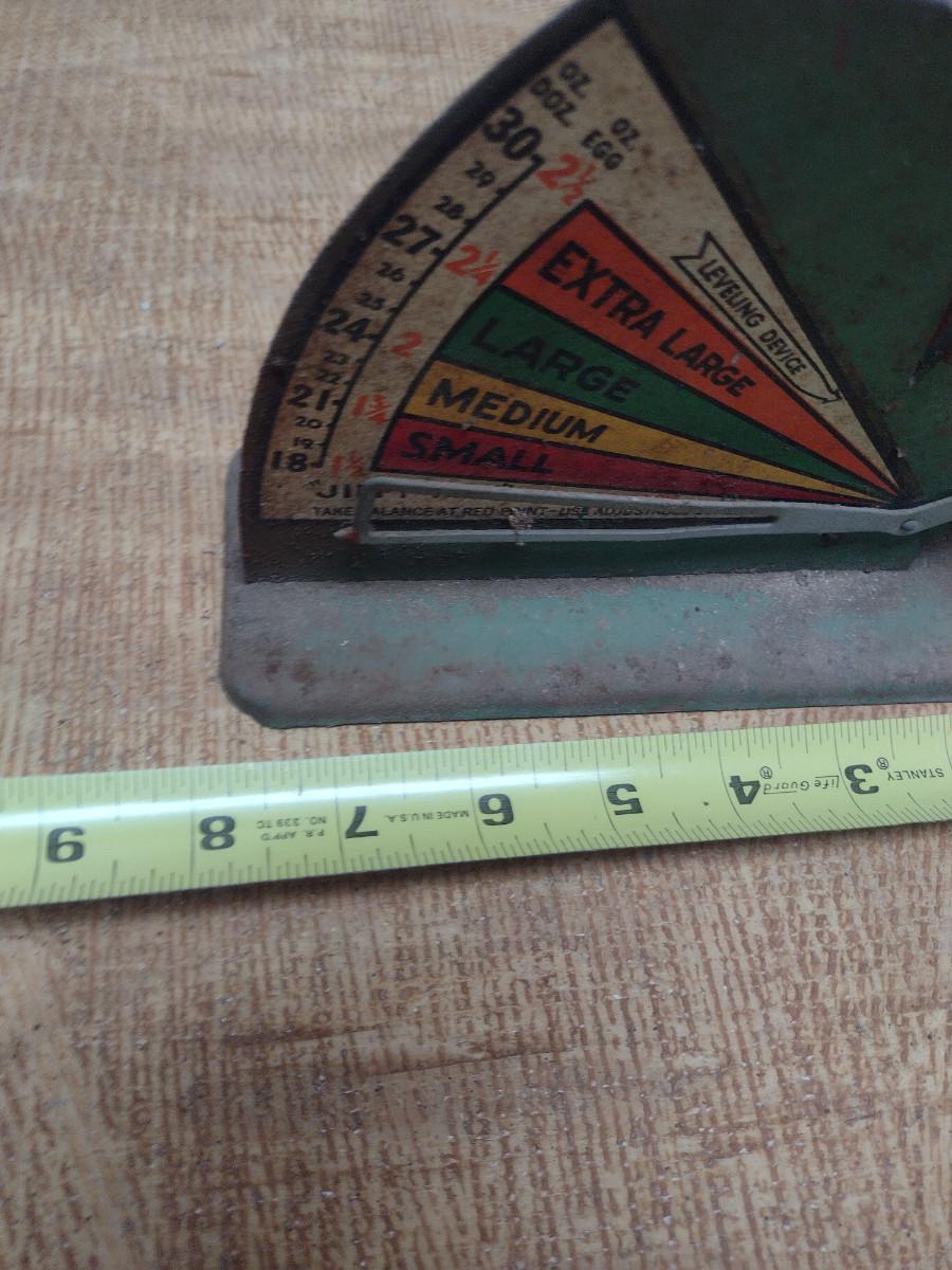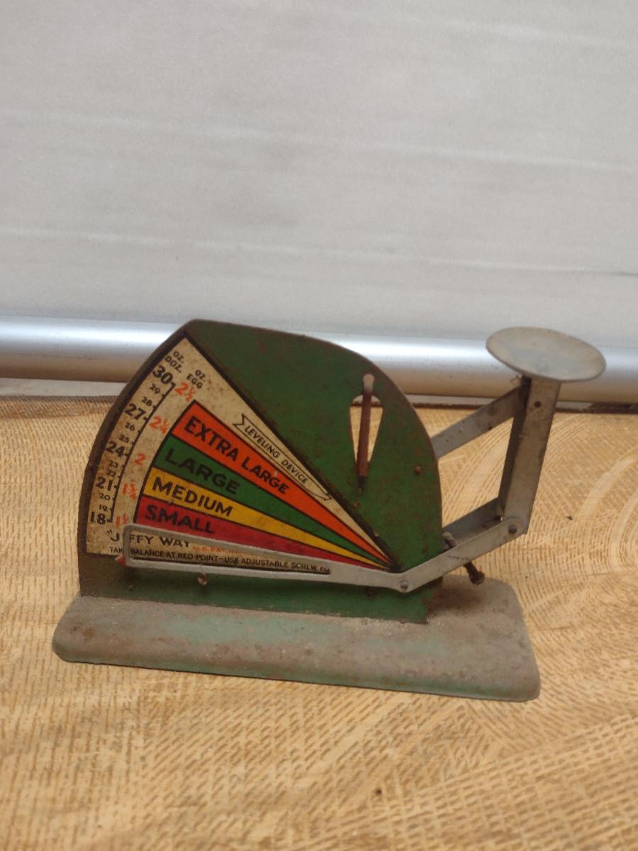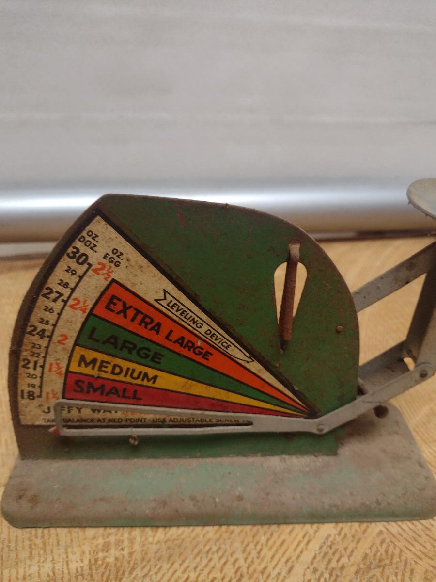 Vintage 'Jiffy Way' Egg Scale. Stored in non-climatized basement so expect item may need to be cleaned from dust, insects, etc. Shipped in as is condition