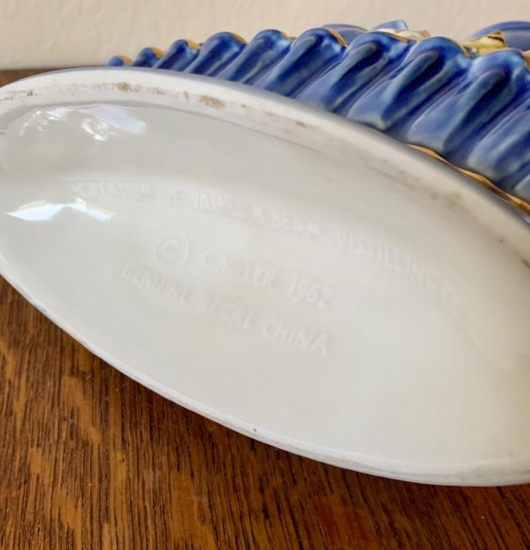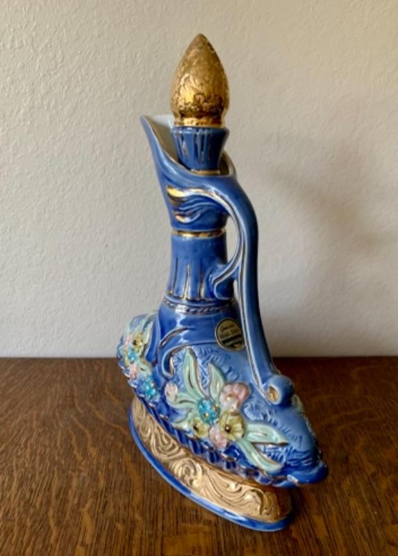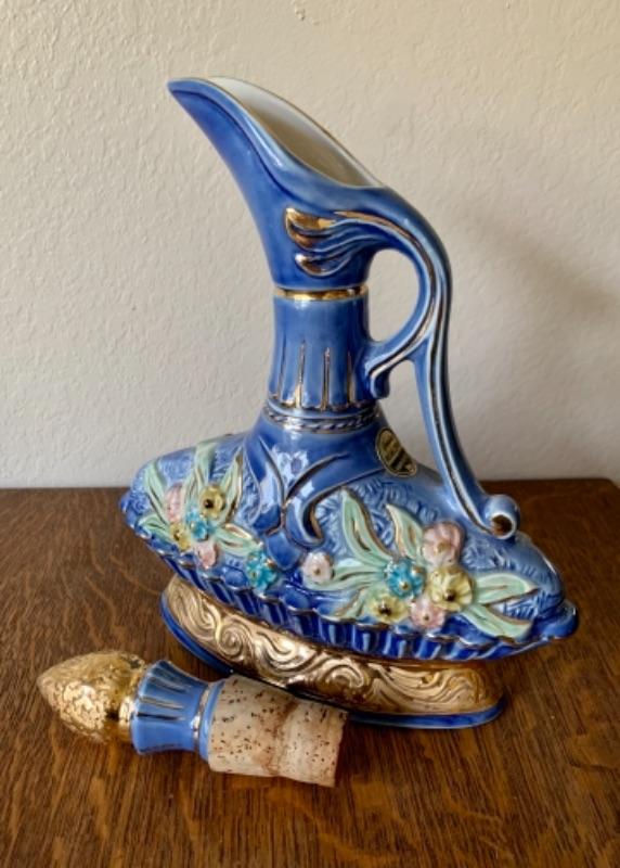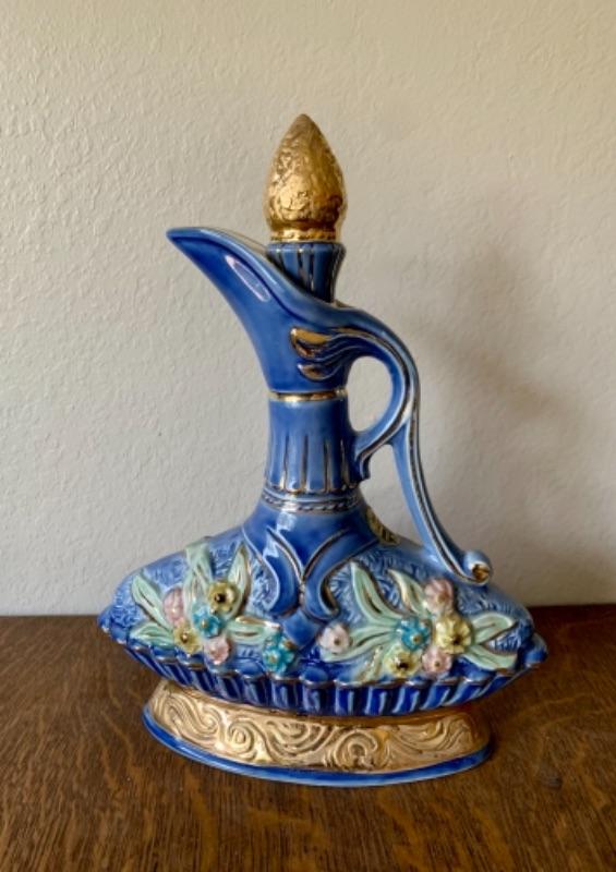 1962 Purple /blue with raised floral design. Beautiful colors, accented with gold. Genuine Regal China. No cracks, chips or repairs noted. Excellent vintage condition. Measures 12 1/8" with stopper.