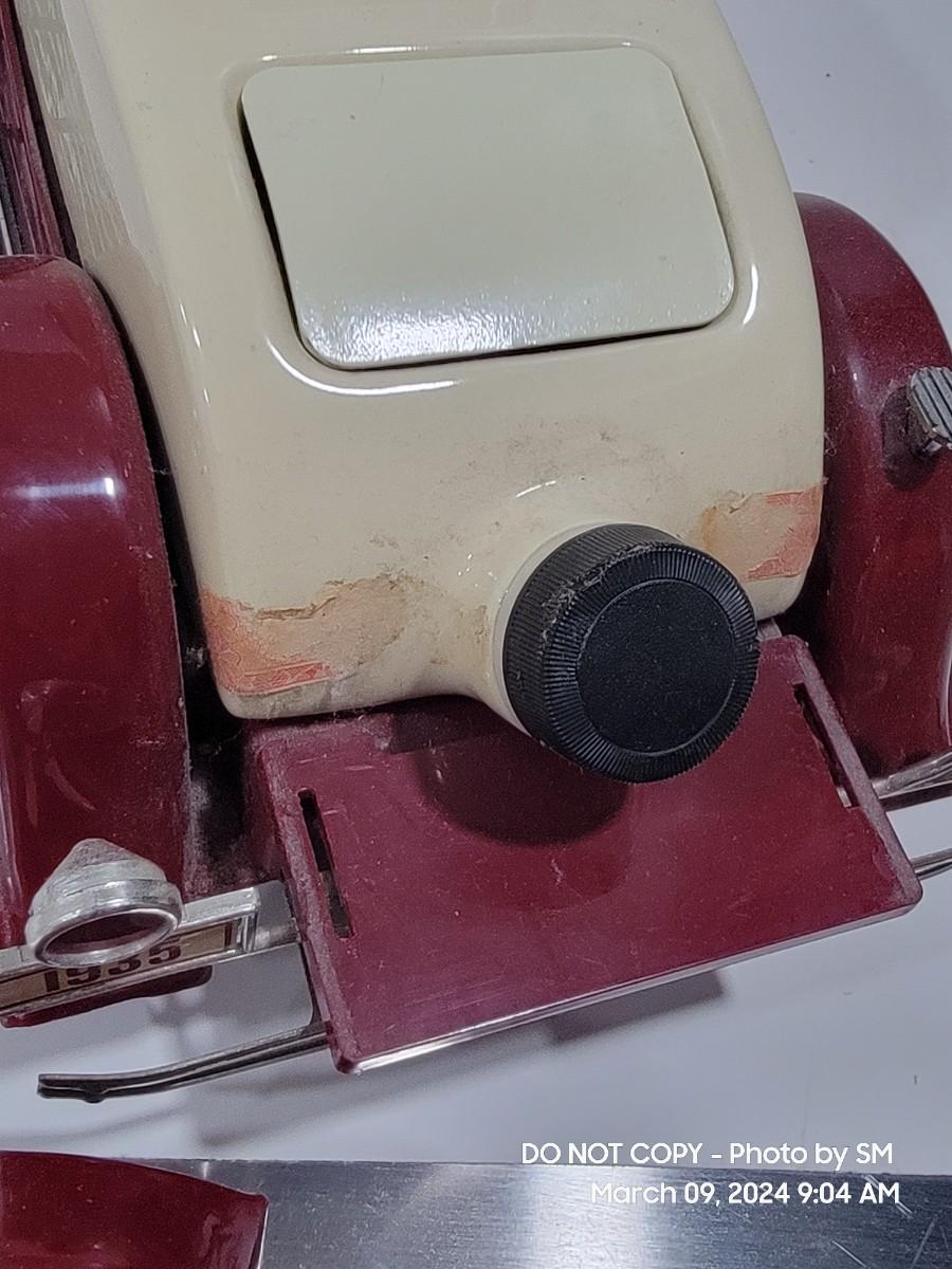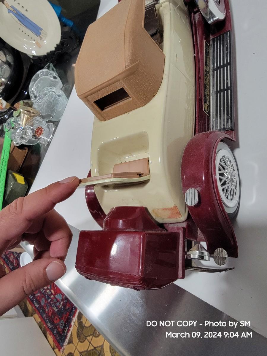 The body of the car feels metal, ut I thinknit is cermaic. The brown parts are plastic. Vintage JIM BEAM Decanter 1935 Duesenberg Convertible Coupe - bottle was prob made in the Mid Century. Collectible, needs a cleaning. Two loose parts that broke, one is the headlight shown in photo me holding it, and the other piece I have no clue - it may not even belong to this car. I am not able to open the rear to empty the liquid- so winning bidder will have to empty it before taking it. :-). Overall super nice.