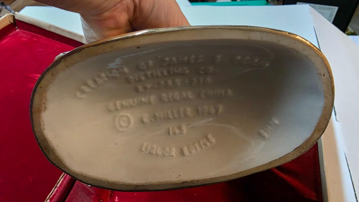 The underside is clearly marked “Genuine Regal China,” with a 1967 copyright stamp, which aligns with known production timelines for this model. The decanter itself is in very good vintage condition, presenting cleanly with consistent age-related crazing, light wear to the gold trim, and no visible cracks, chips, or repairs. It displays exceptionally well and remains a strong example of this widely collected Jim Beam series.