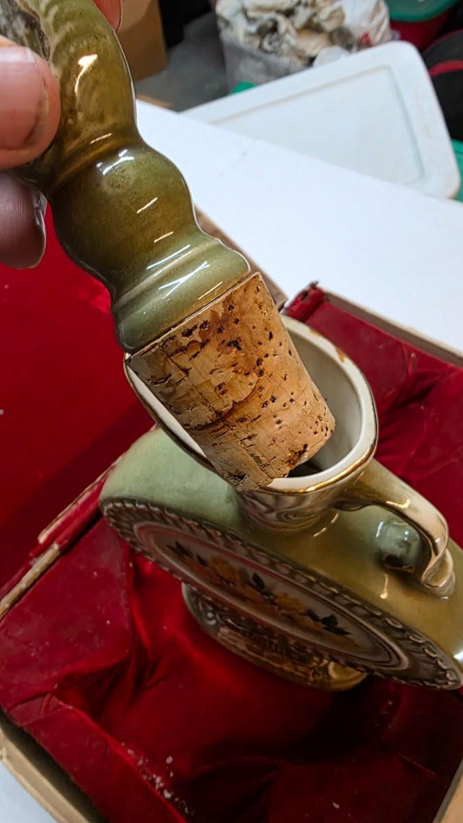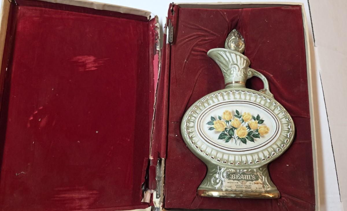 Jim Beam decanters from this era are collected primarily as decorative Americana rather than rare ceramics, with value driven by visual appeal, completeness, and condition of the bottle itself. This example stands out due to the strong condition of the decanter and the presence of the original case, despite its hinge separation.