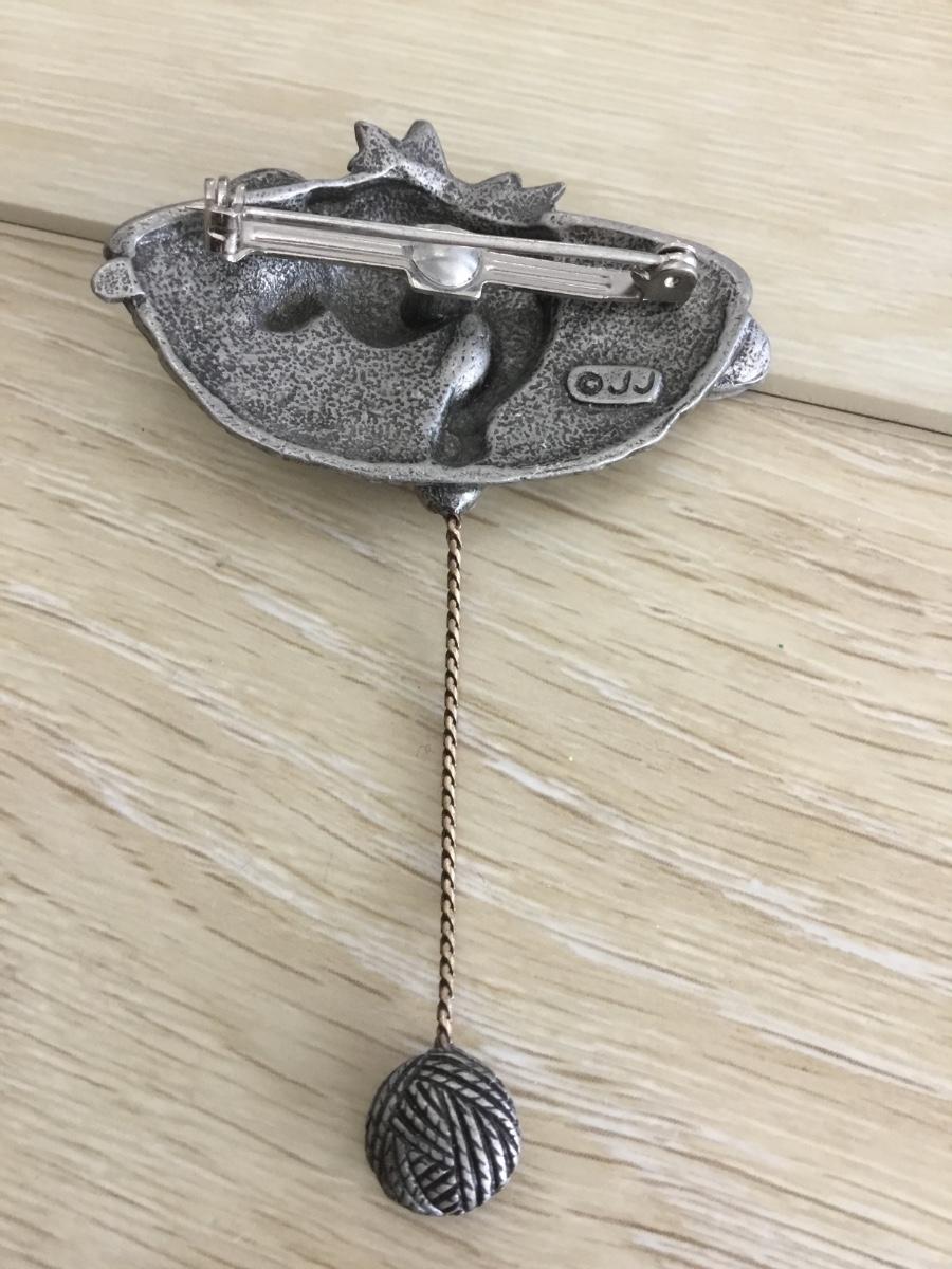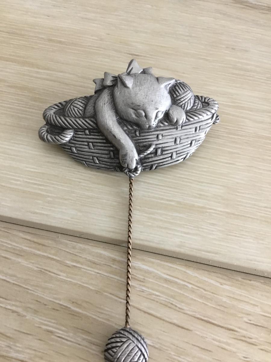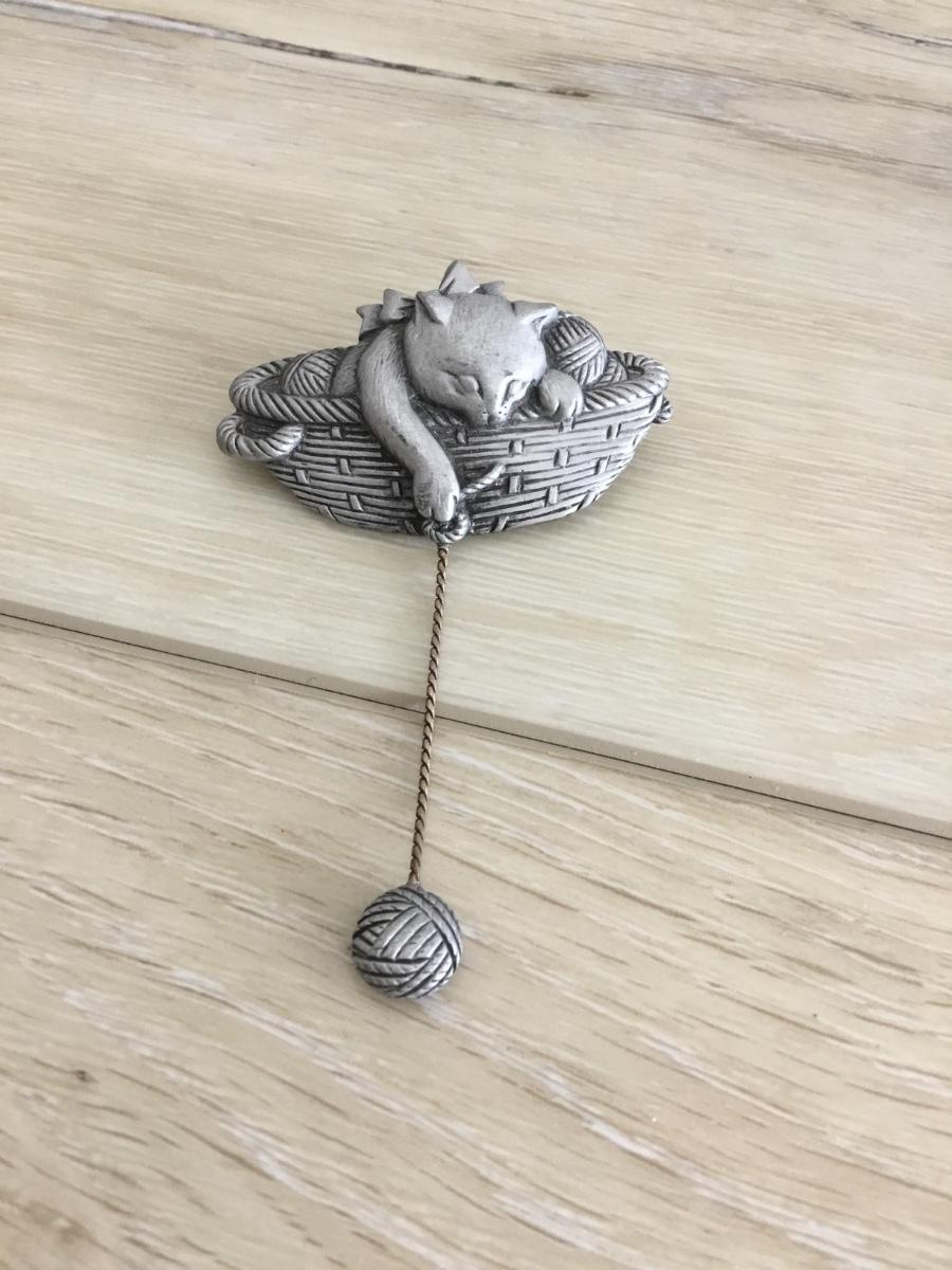 Vintage JJ pewter cat in a basket brooch