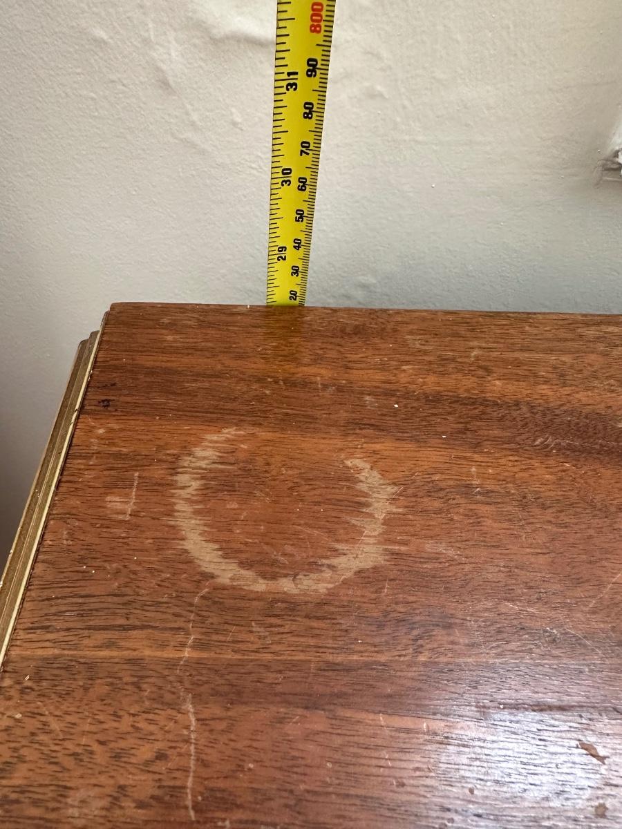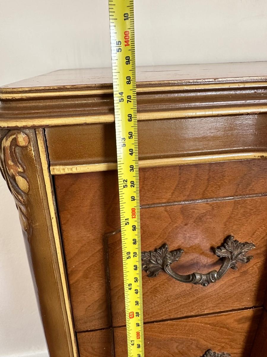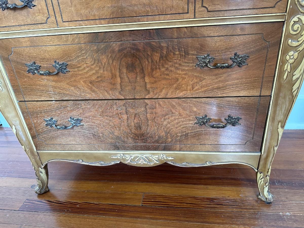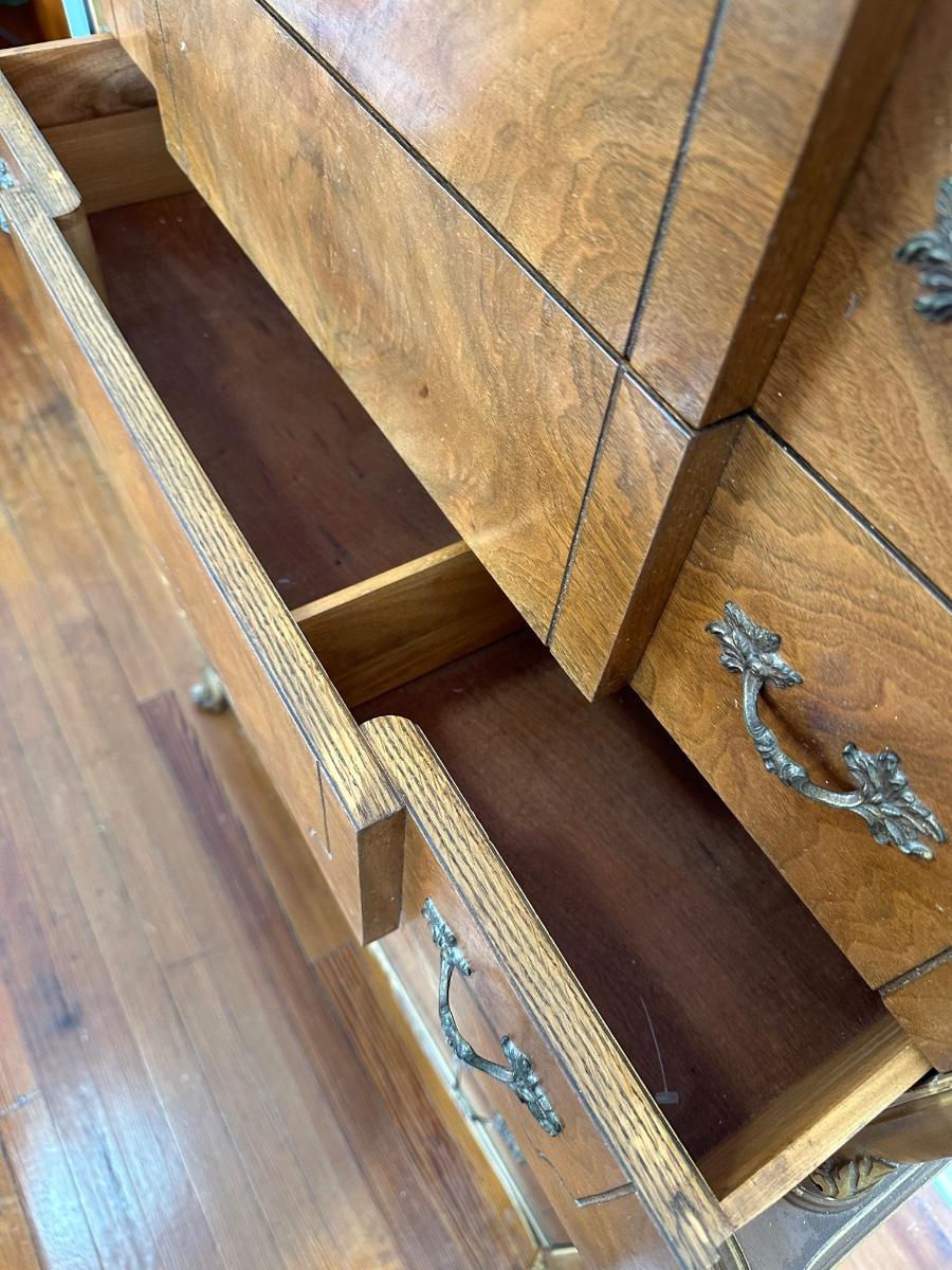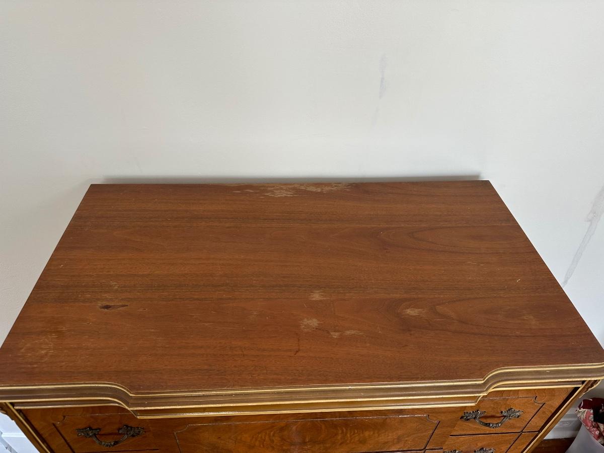 Dresser has some wear on the top and the bottom two drawers are slightly discolored.