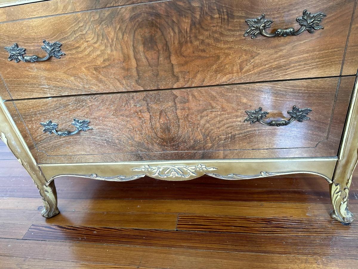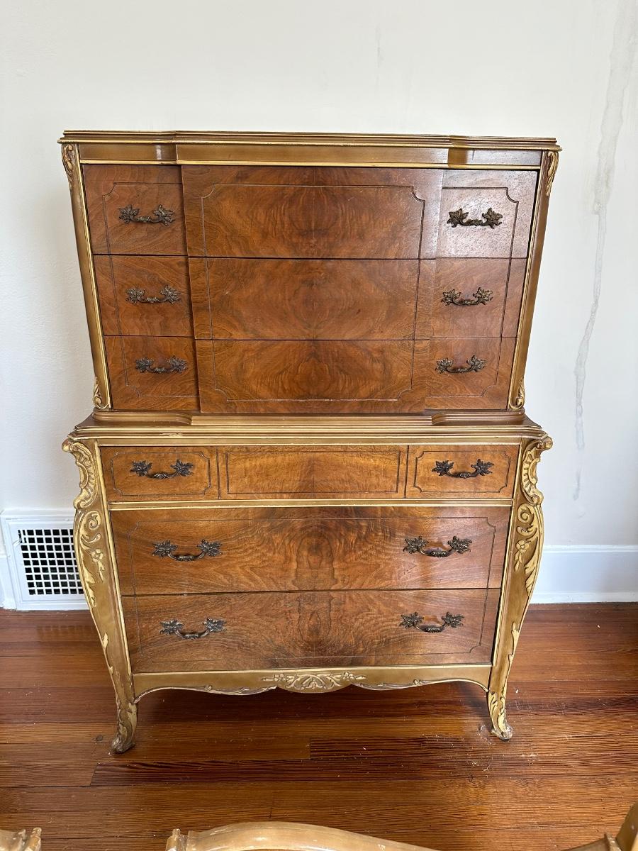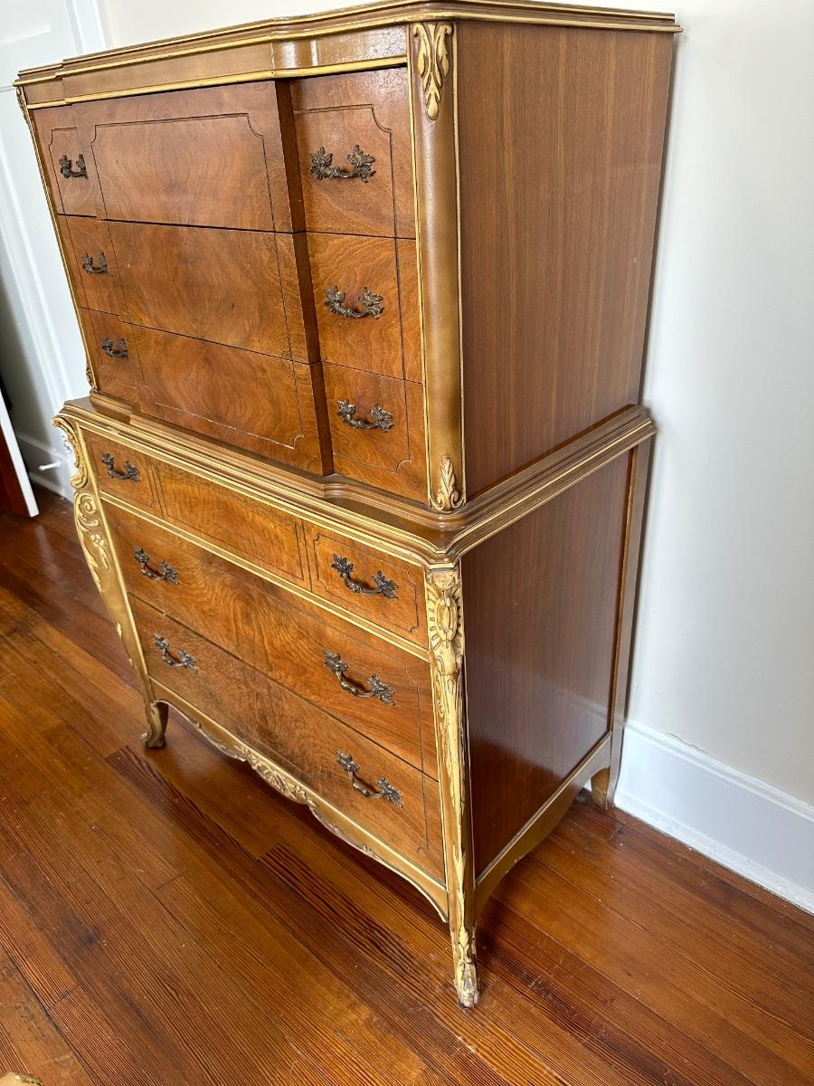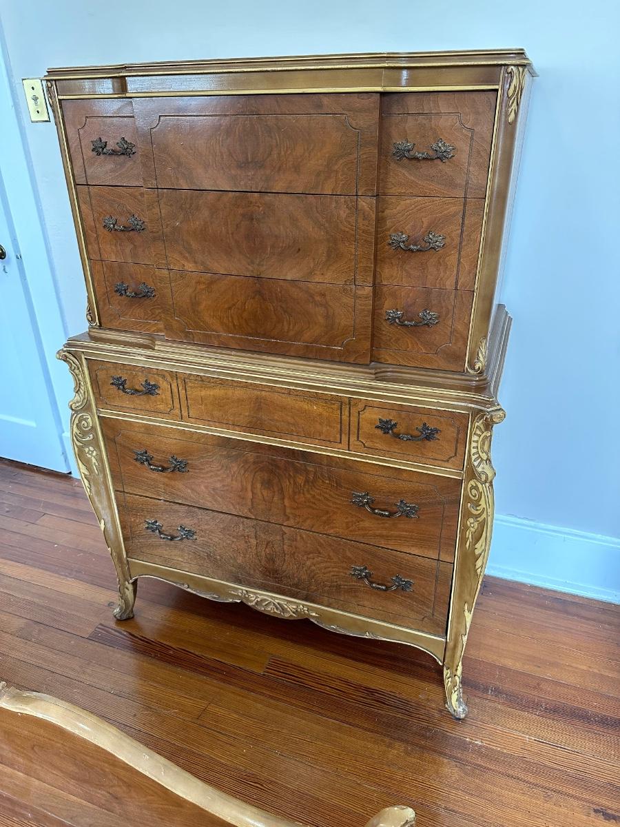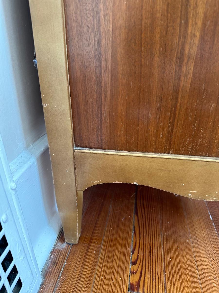 Dresser has some wear on the top and the bottom two drawers are slightly discolored.