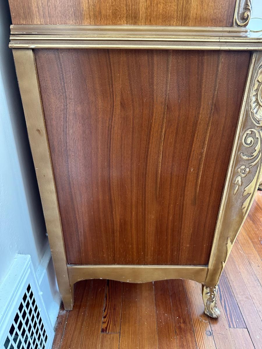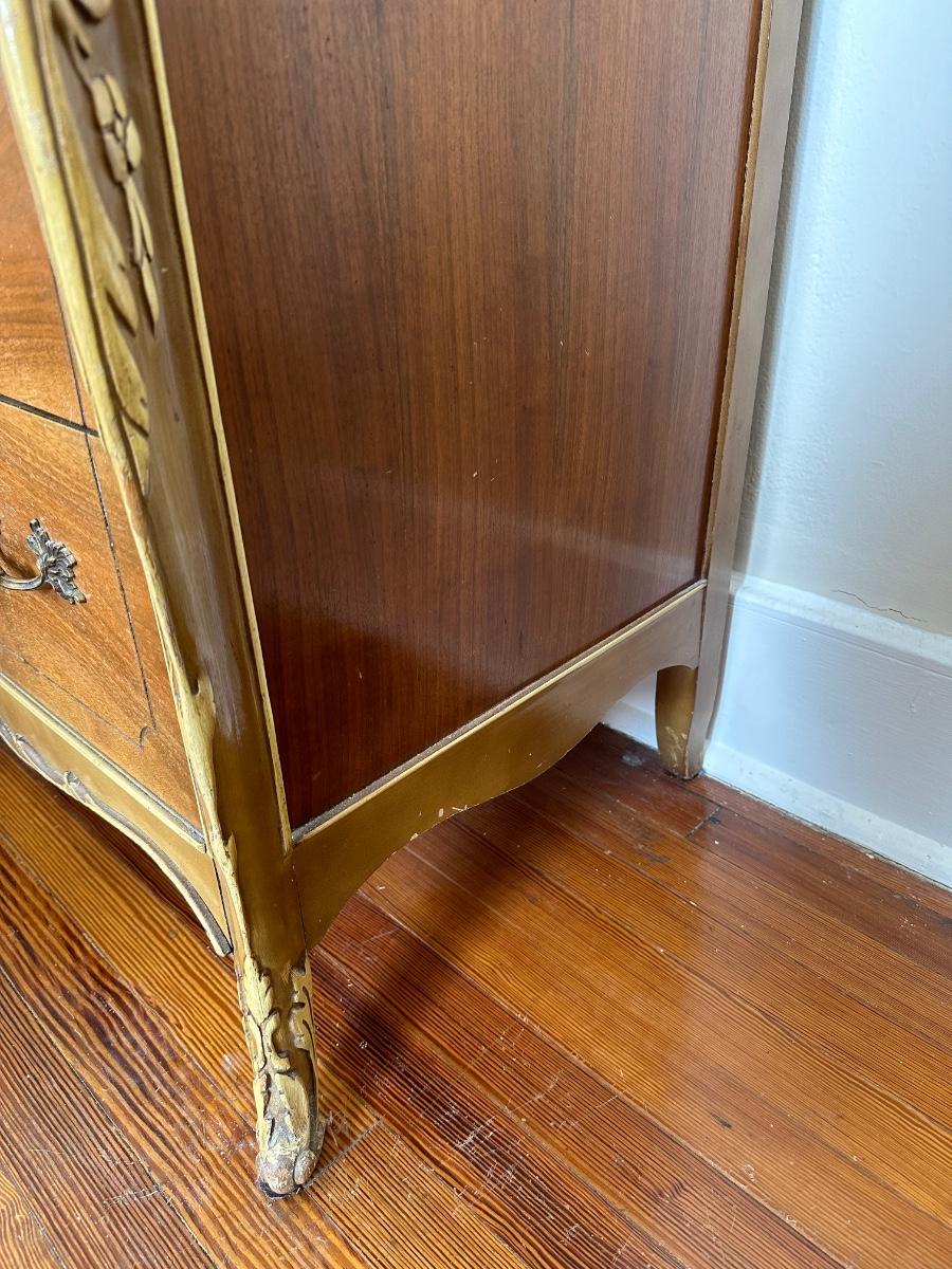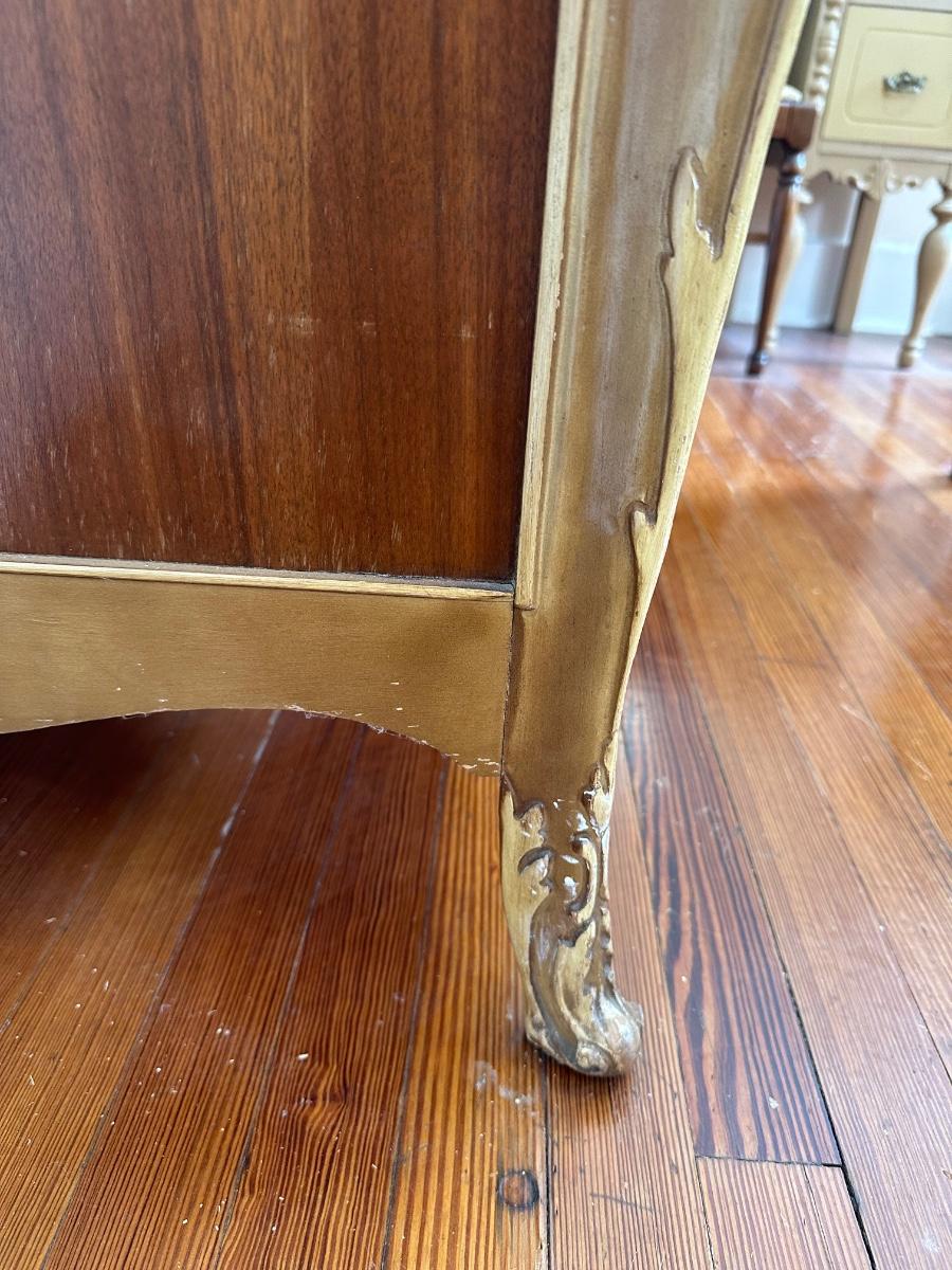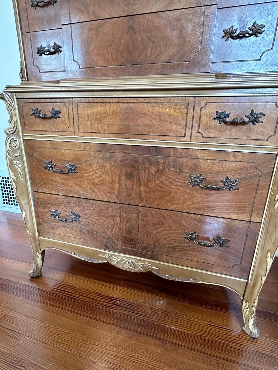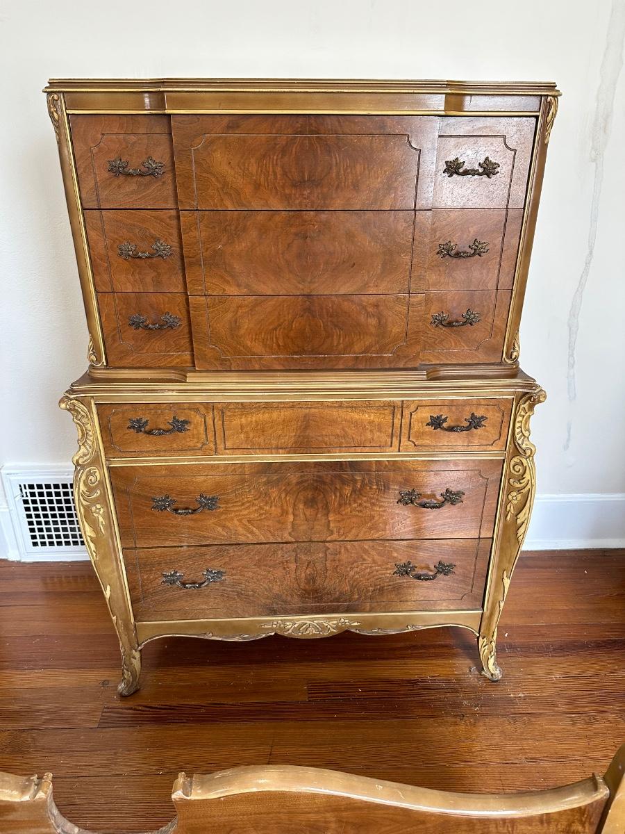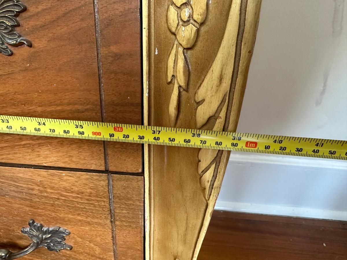 Dresser has some wear on the top and the bottom two drawers are slightly discolored.