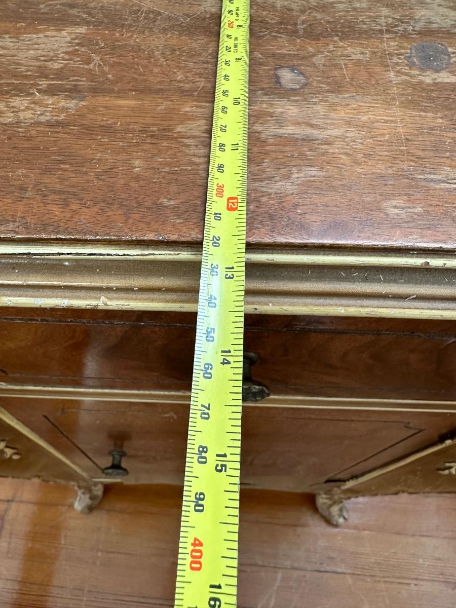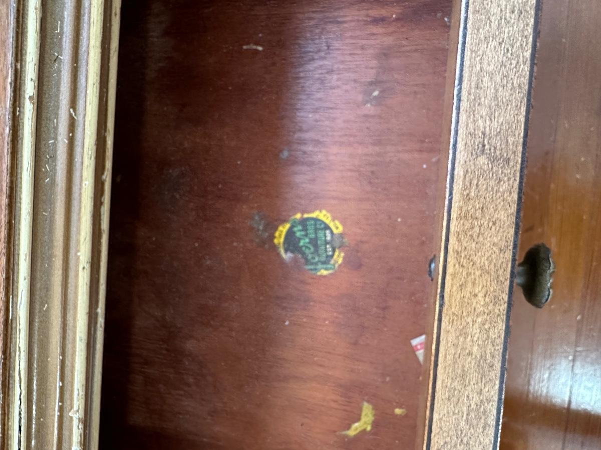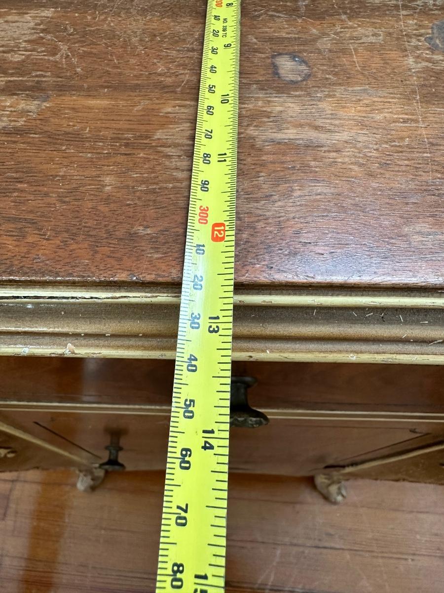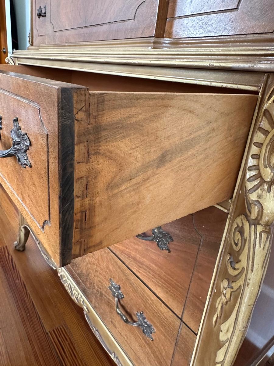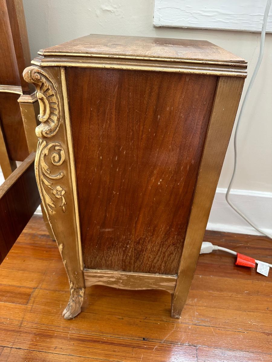 Dresser has some wear on the top and the bottom two drawers are slightly discolored.