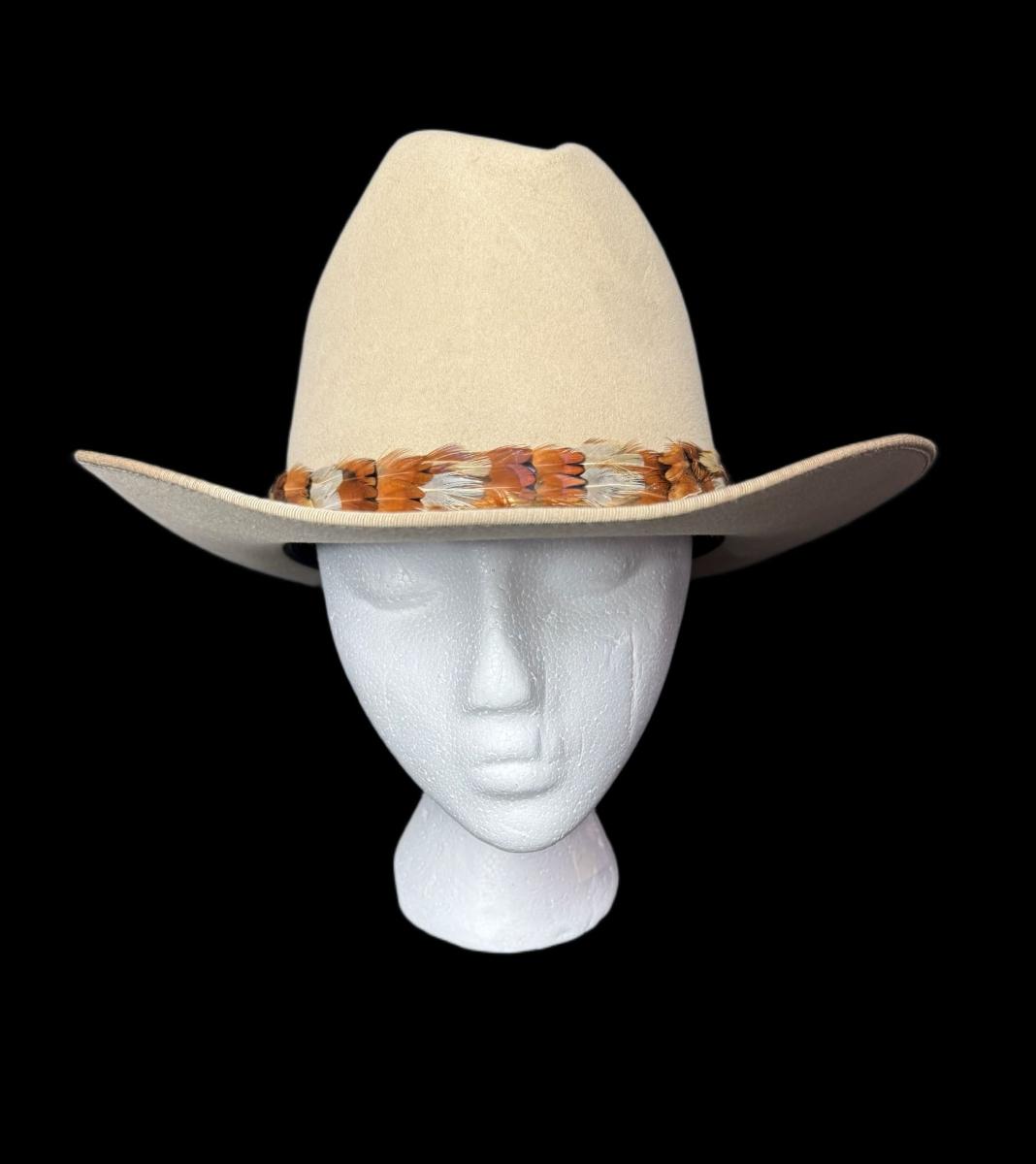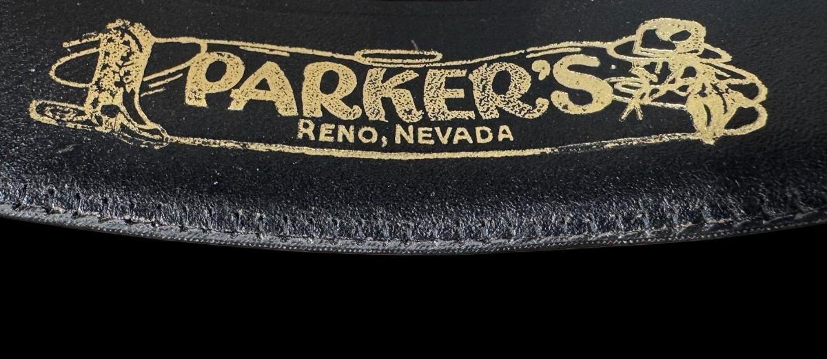 Retailed by Parker’s of Reno, Nevada. This hat has a multi-colored feather hat band. Age related wear. Size 7.5. [CS]