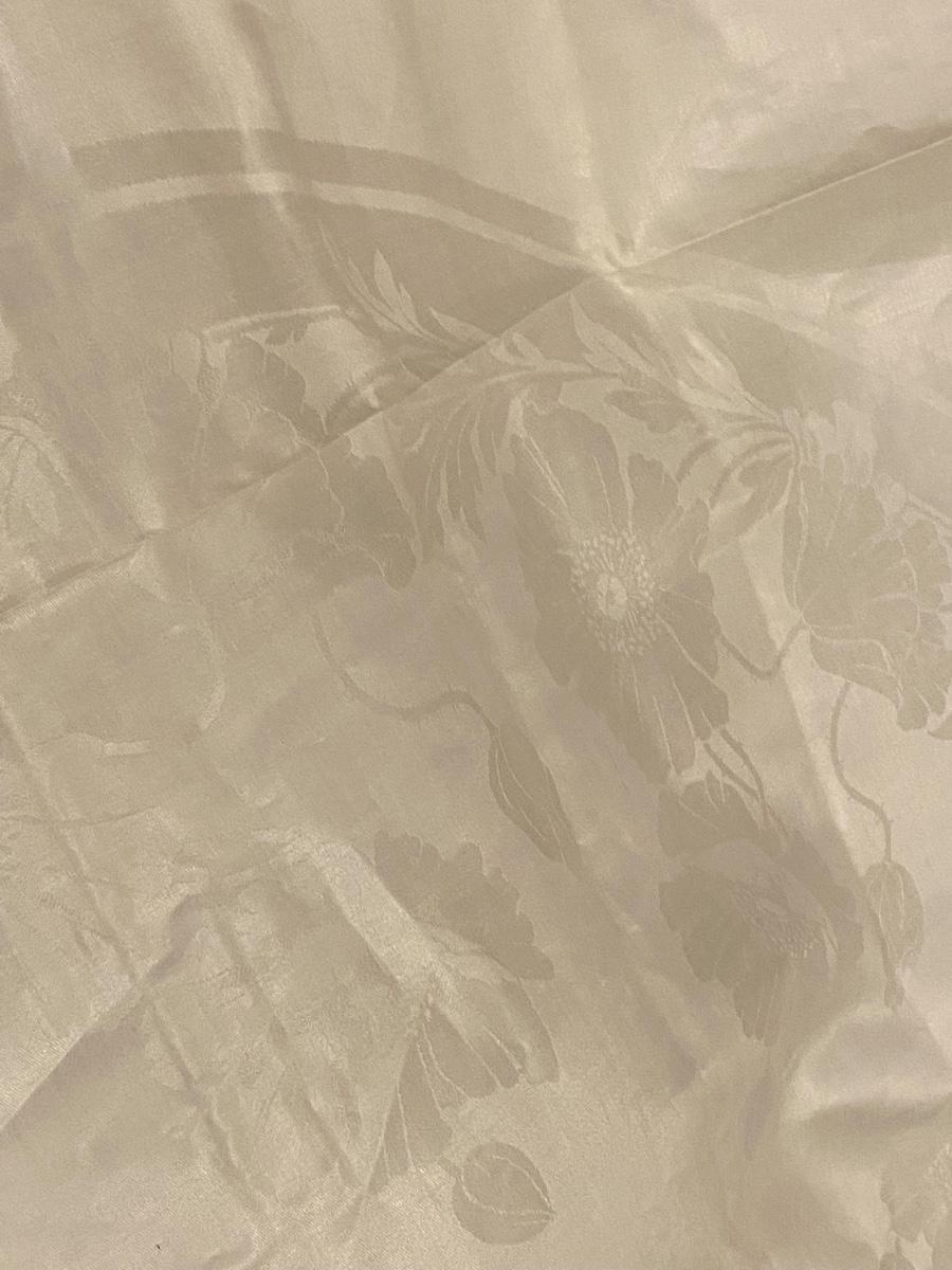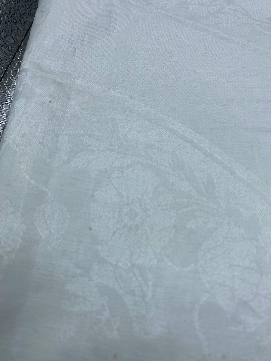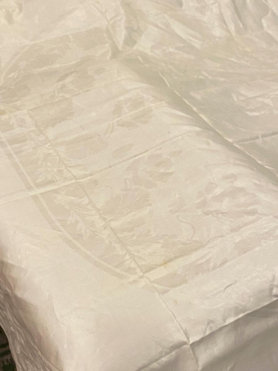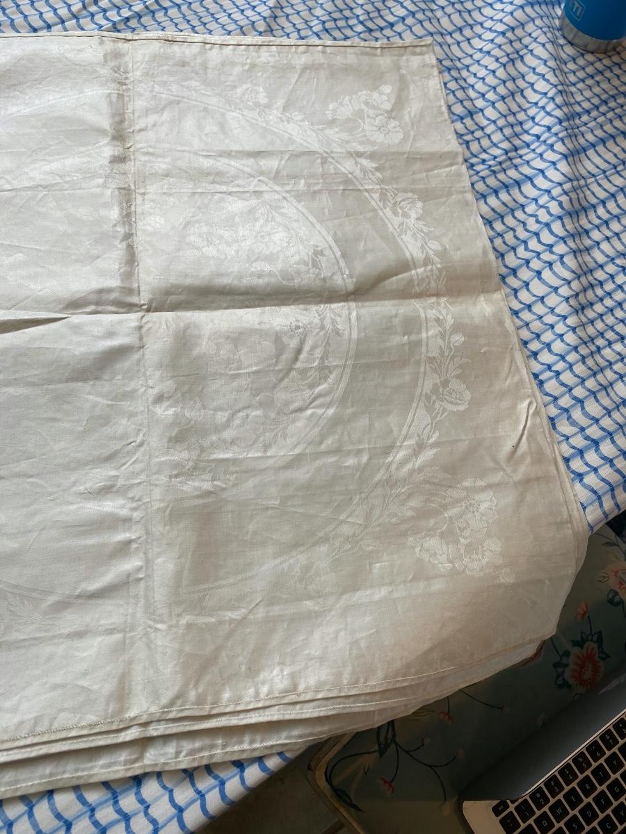 Stunning damask Table cloth and napkins from Northern Ireland. Please note the all the markings of excellence that makes this set a true treasure. Picturesque pattern of poppies or coreopsis blooming flower motif. the table cloth has oval center with boarder of buddin flowers. Perfect for holiday gatherings. Appears never used, some yellowing which is due to being folded for decades.t Table cloth 72" X 90", 12- Napkins 22 1/2 X 22 1/2