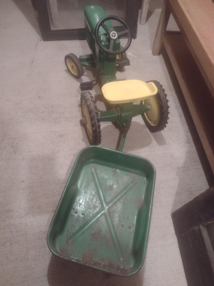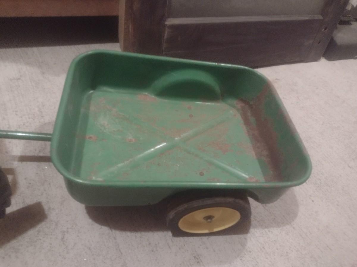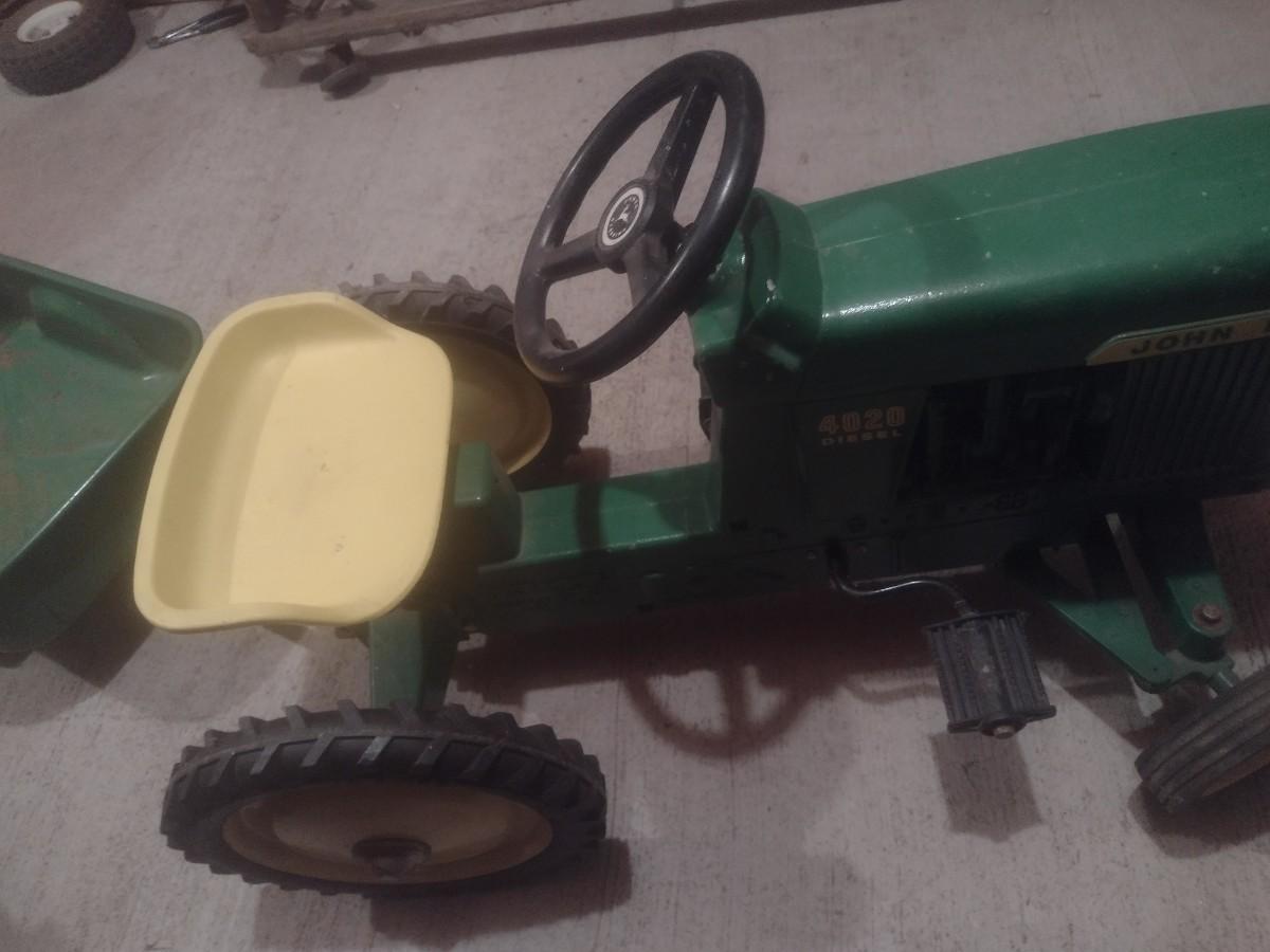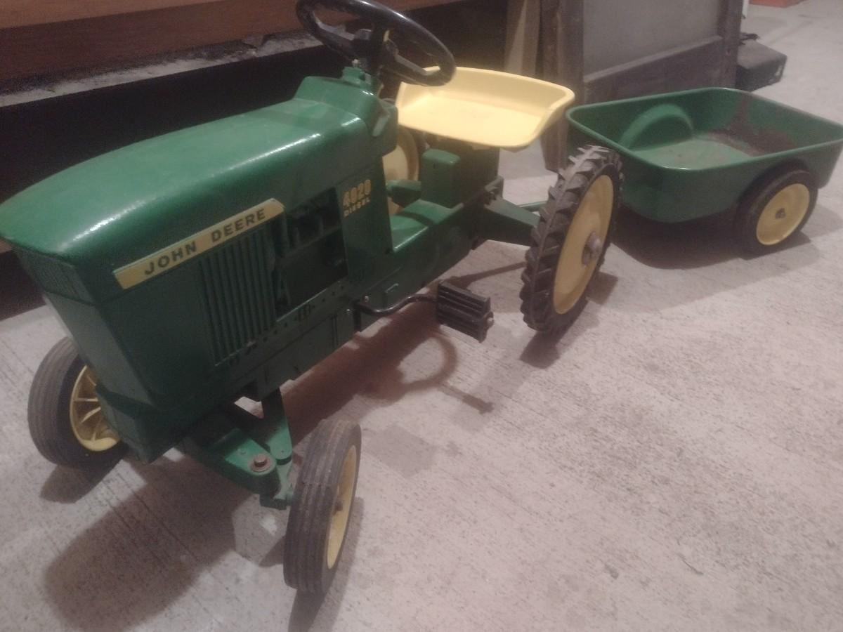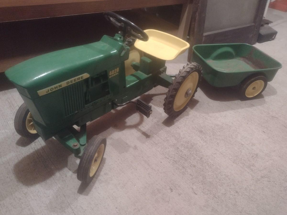 Vintage John Deere Cast Body 4020 Peddle Tractor with Metal Pan Single Axle Pull Wagon