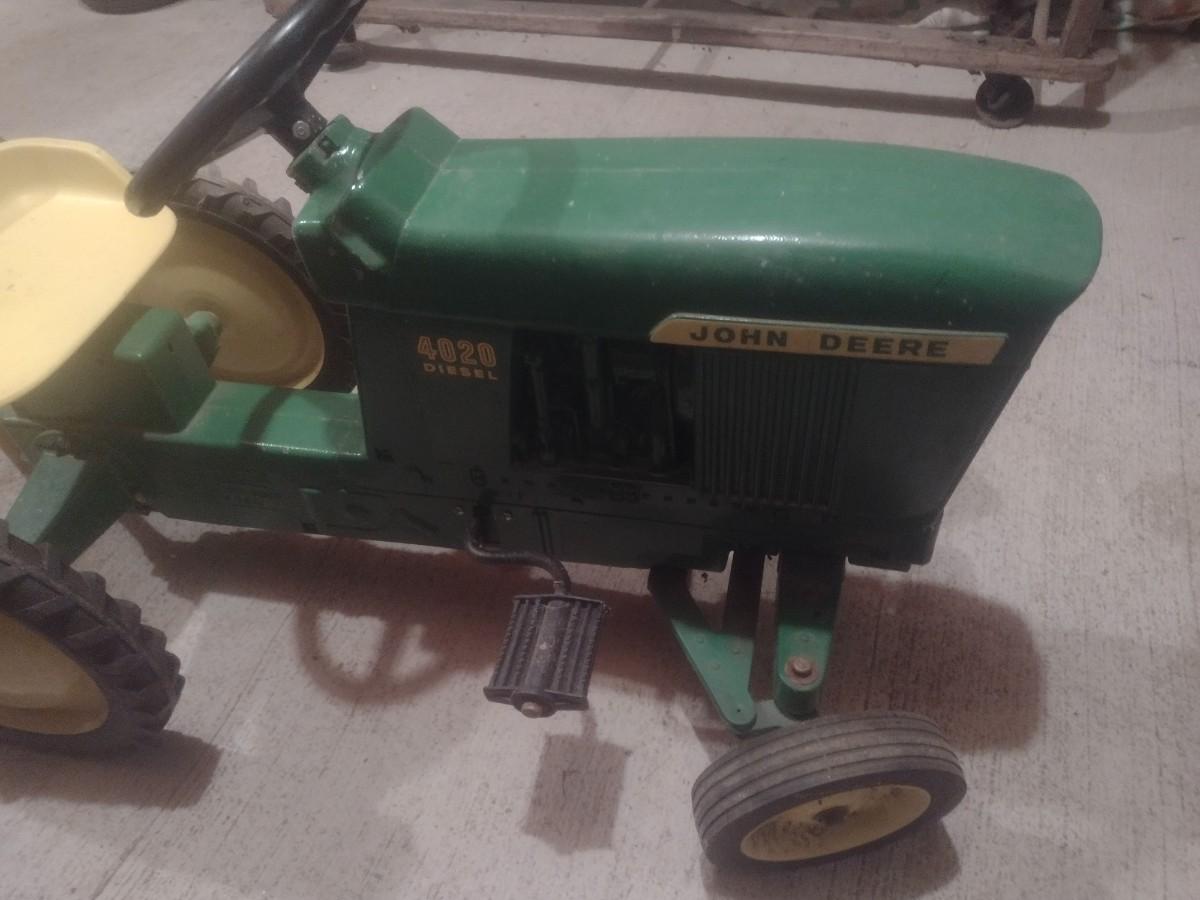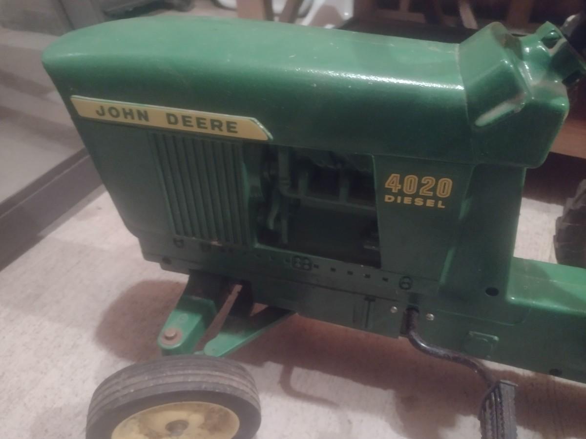 Vintage John Deere Cast Body 4020 Peddle Tractor with Metal Pan Single Axle Pull Wagon. Tractor is in very good condition and wagon has some internal oxidation
