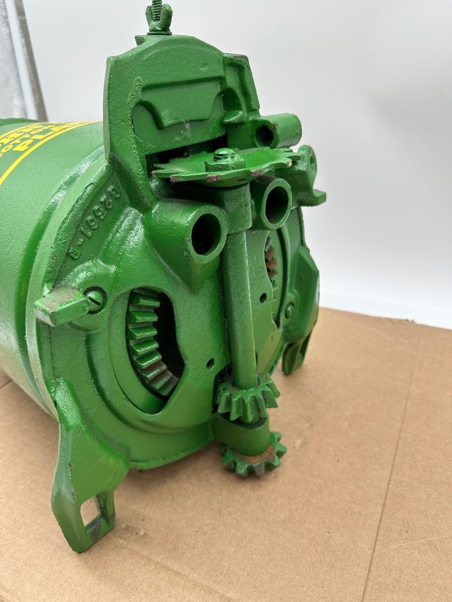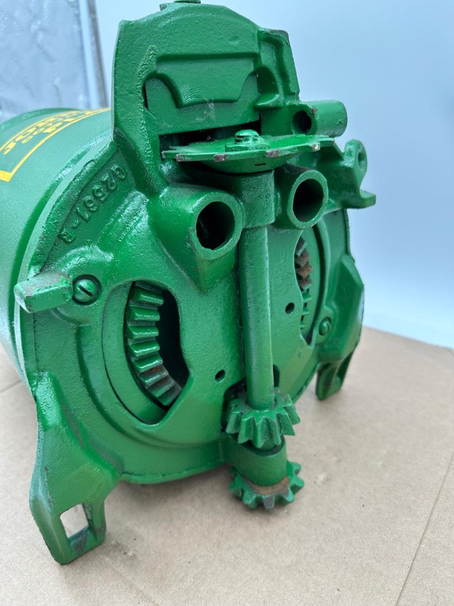 Original John Deere cotton and corn planter seed hopper, heavy cast iron construction with original green paint and yellow lettering. Marked “John Deere – Moline, Ill.” Includes the original cast lid and intact internal gearing. A great piece of early farm equipment—perfect for tractor collectors, restorations, or industrial décor.