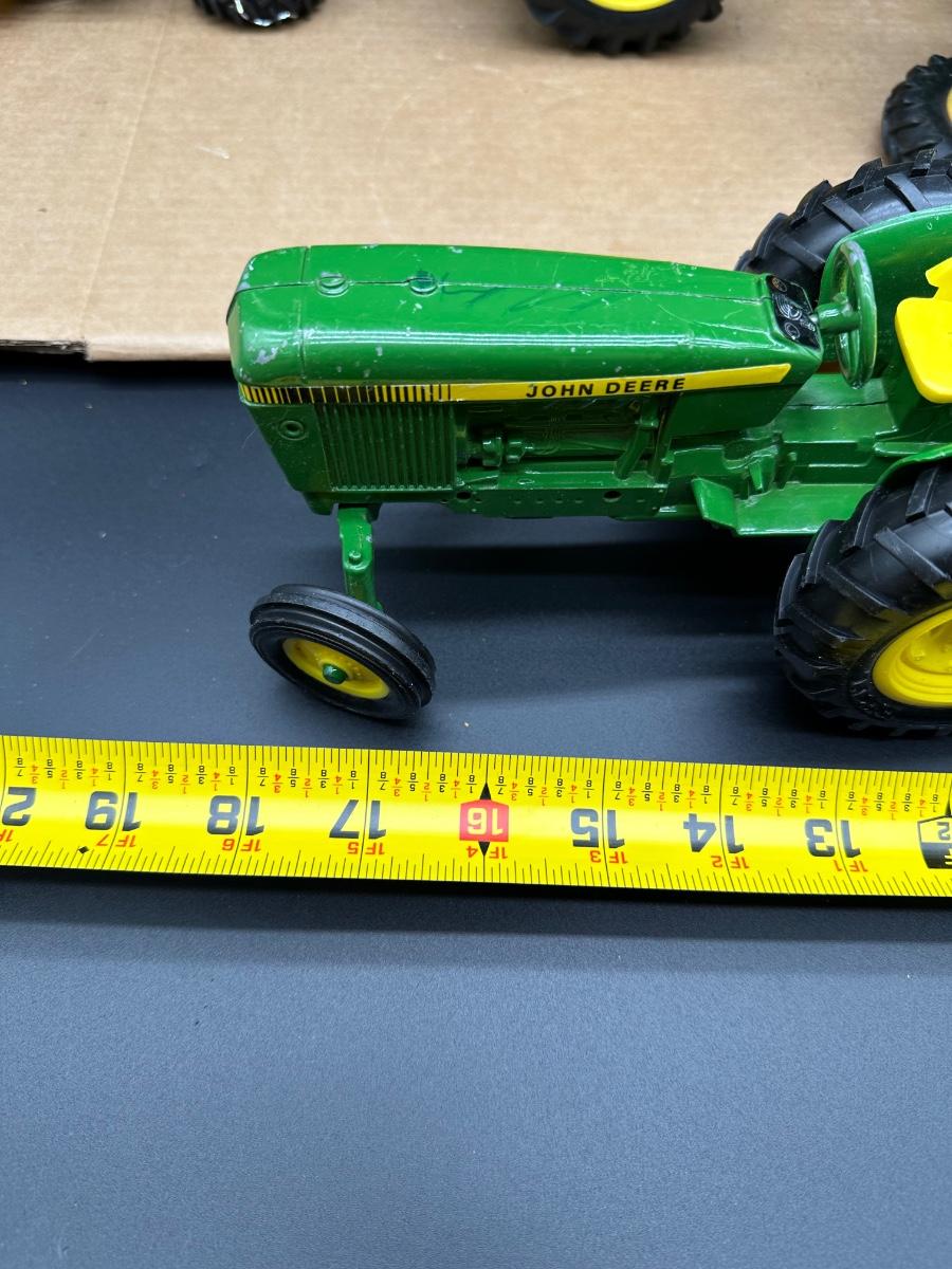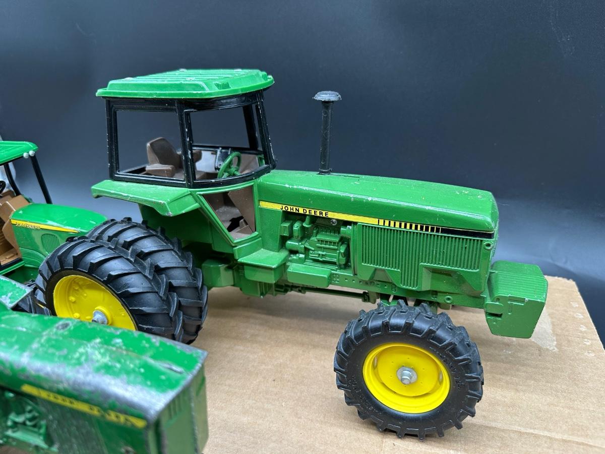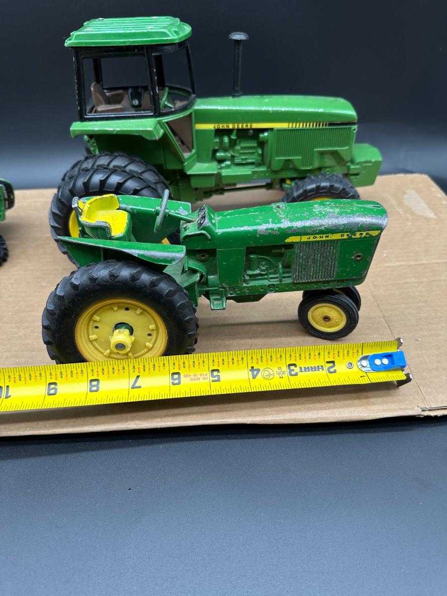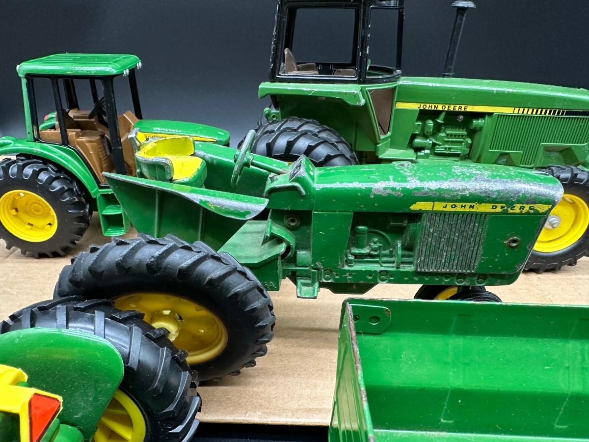 Condition ranges from good to play-worn with paint loss, scuffs, and wear consistent with age and use. Tires are present and roll; no boxes included. Great display pieces or additions to a farm toy or John Deere collection.