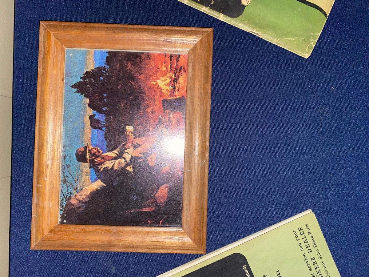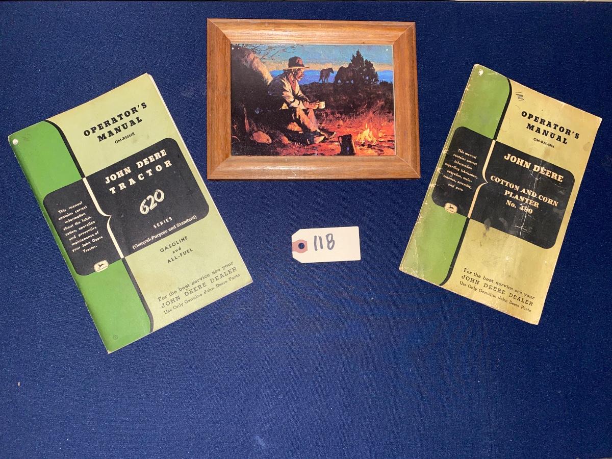 Vintage John Deere Instruction Manuals and Framed Cowboy Post Card As Pictured