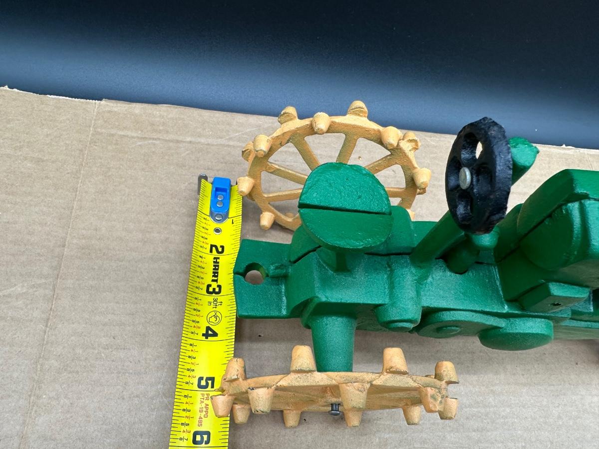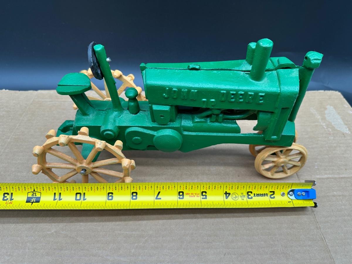 Measures approximately 13 inches long (see tape-measure photos). Heavy cast construction makes this a great farm display piece, shelf model, or décor item for collectors and John Deere enthusiasts.