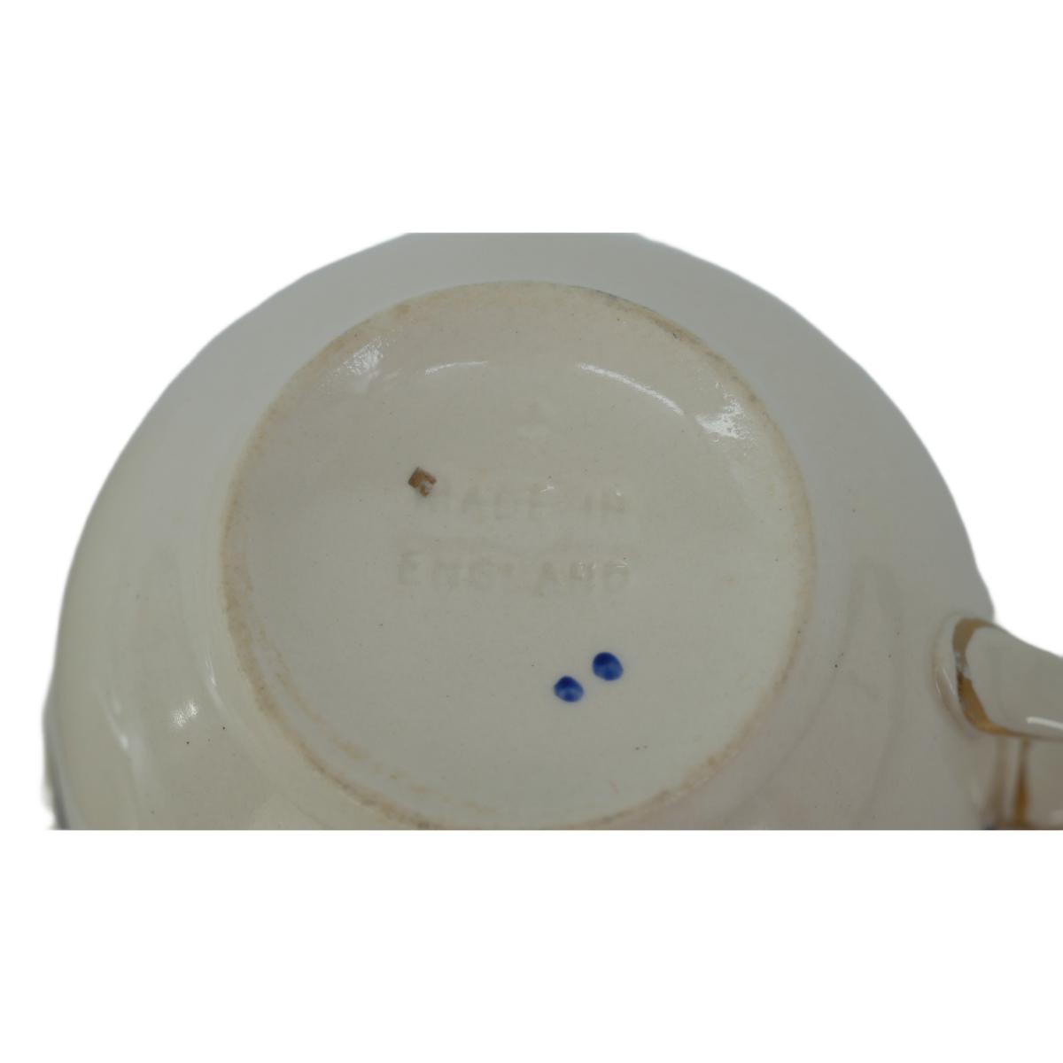 Vintage c. 1930s teacup and saucer marked "Old English, Johnson Bros, Made in England". Beautiful dark blue and gold pattern. Excellent condition, no issues found. Teacup measures 4" in diameter, 2.5" in height. Saucer measures 5.5" in diameter. Lot weighs 11 oz. (G18)
