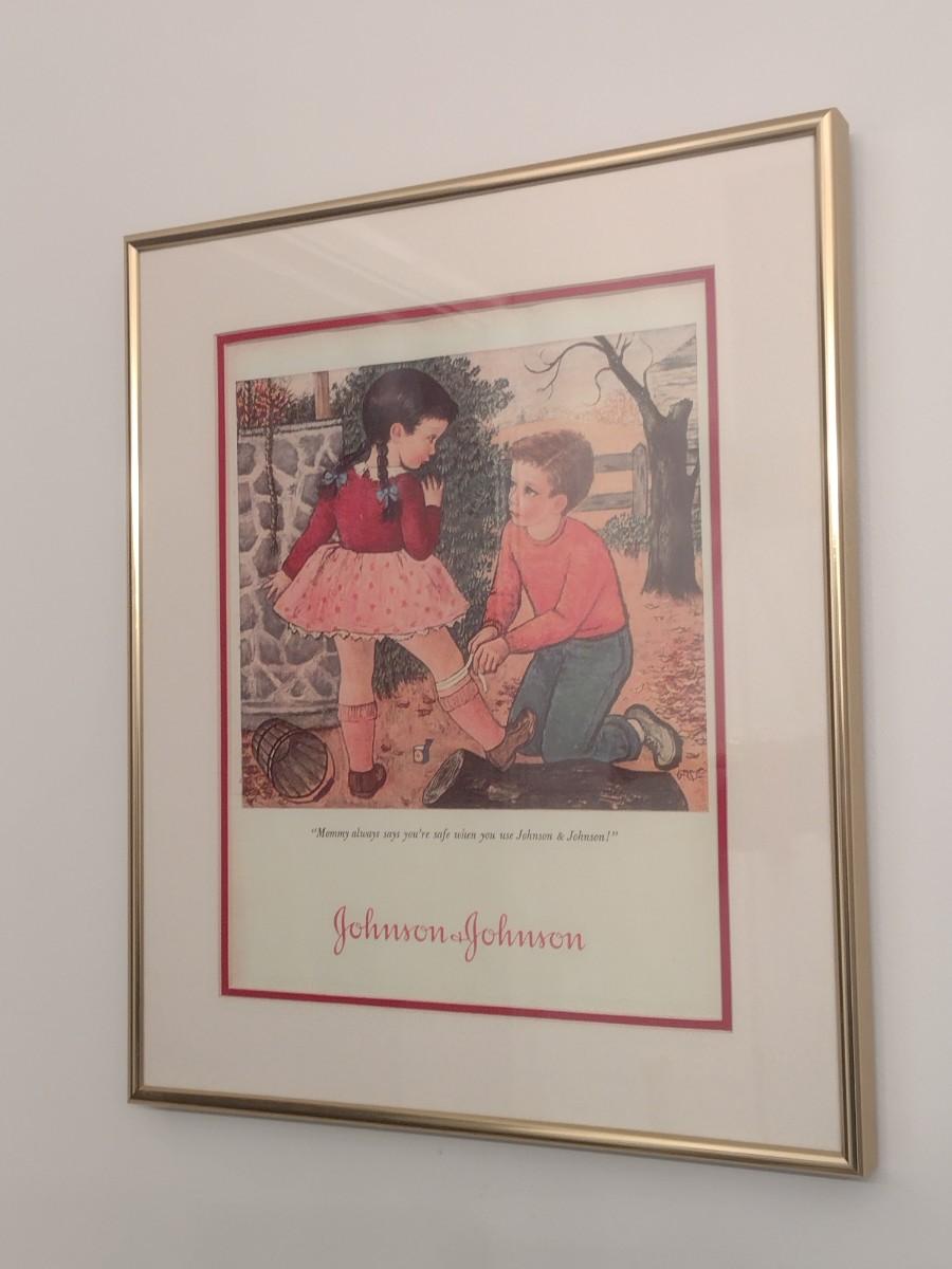 Vintage Johnson & Johnson Advertising Print Framed Behind Glass. Approx 14 1/4" x 16 1/2".