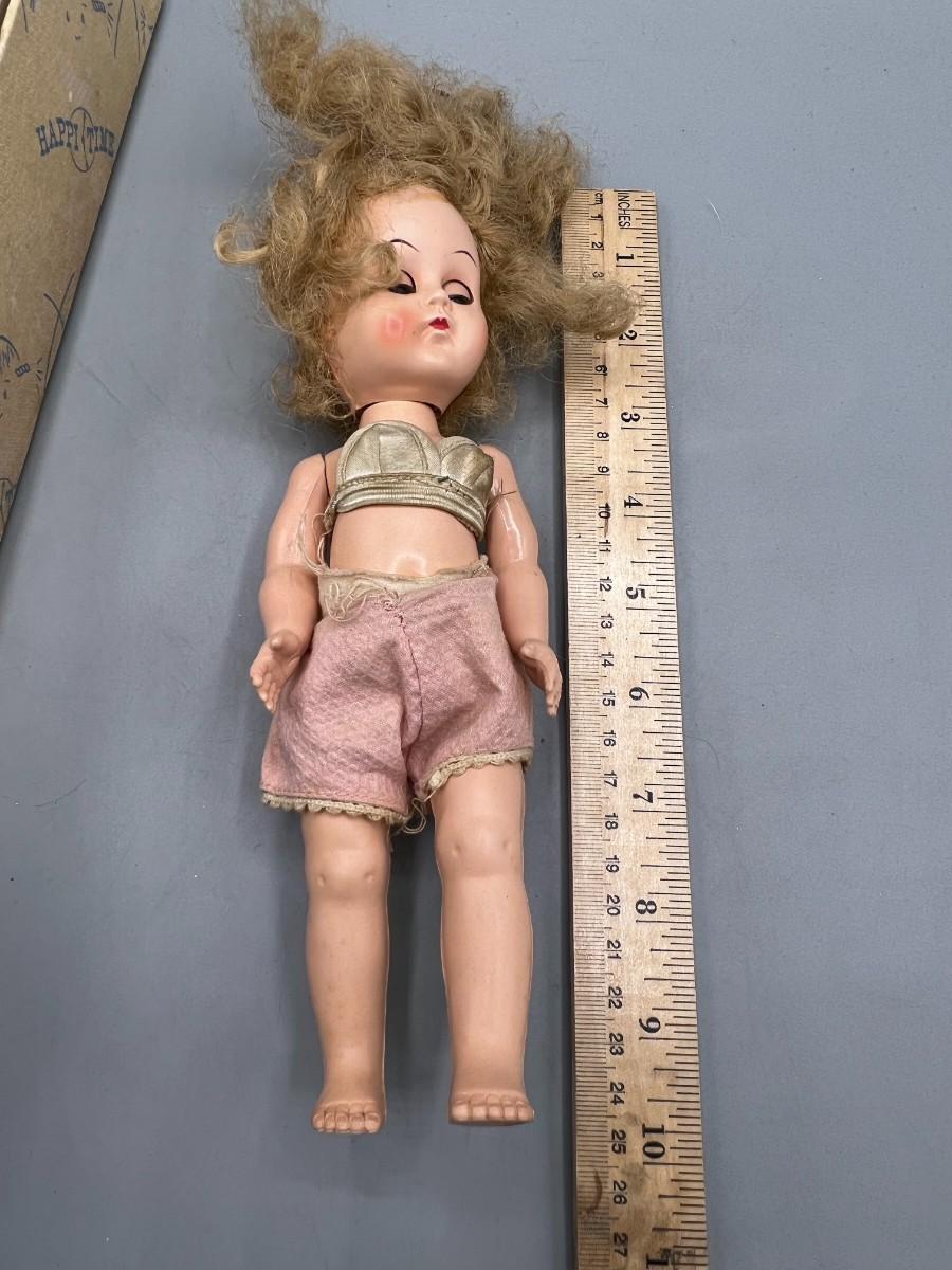 Vintage Jointed Plastic FAB Happi Time Toys Doll. Small, jointed doll in fair vintage condition. No body markings found. Under 10" size.