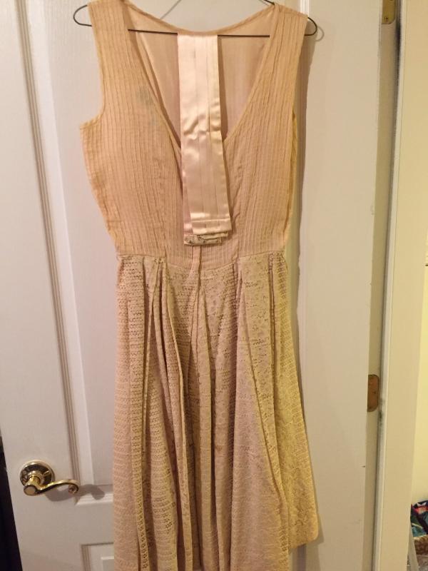 In cream lace with pintucked bodice. Rouched sash included. No size