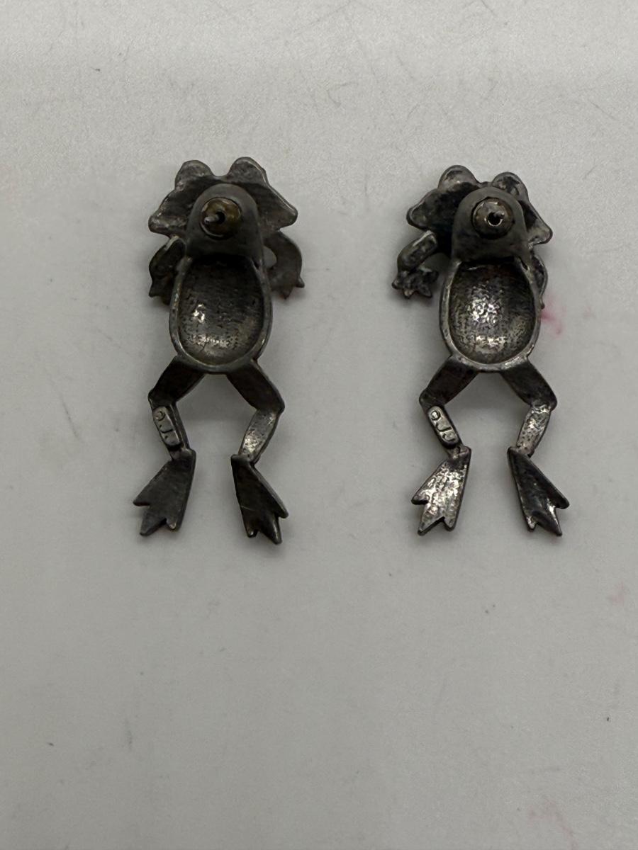 For pierced ears. In good condition. Designed as a two-piece set where the frog's face is the front stud and the body is the earring back