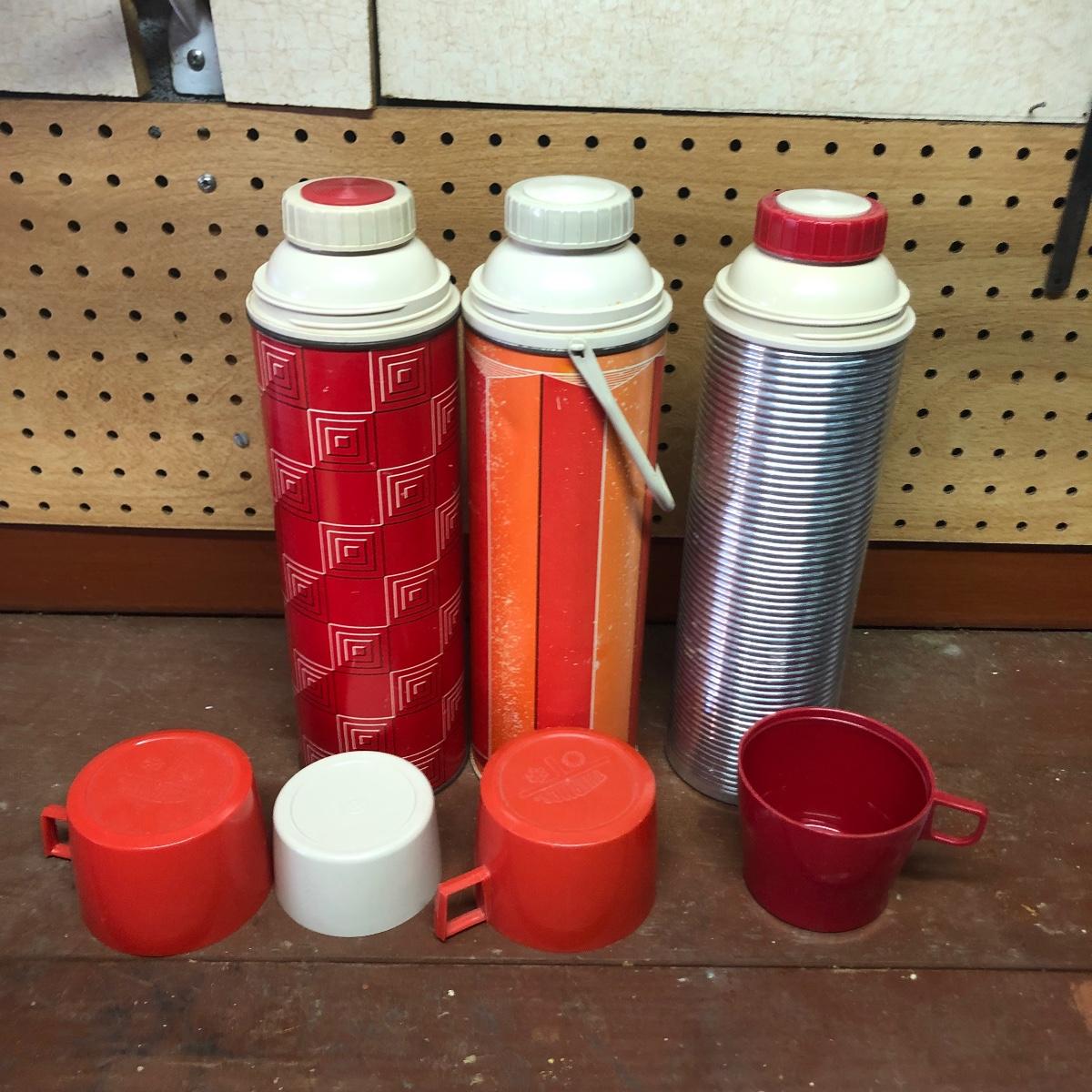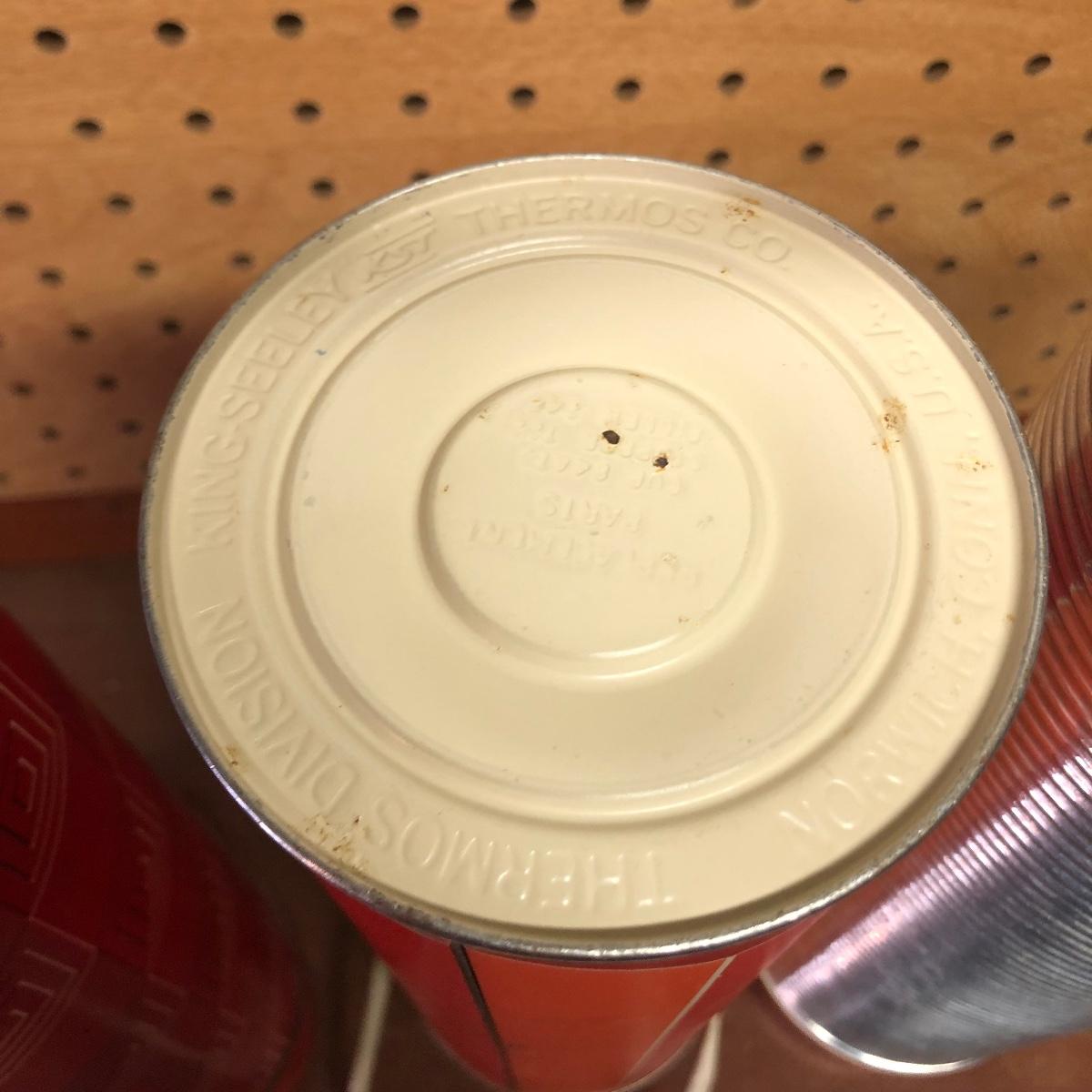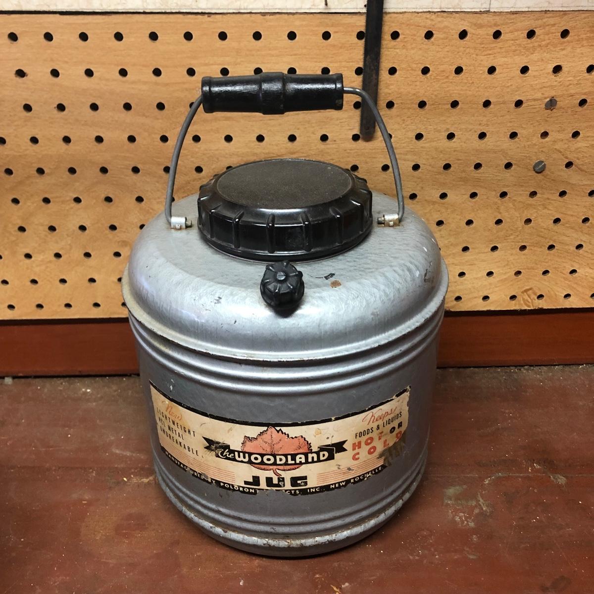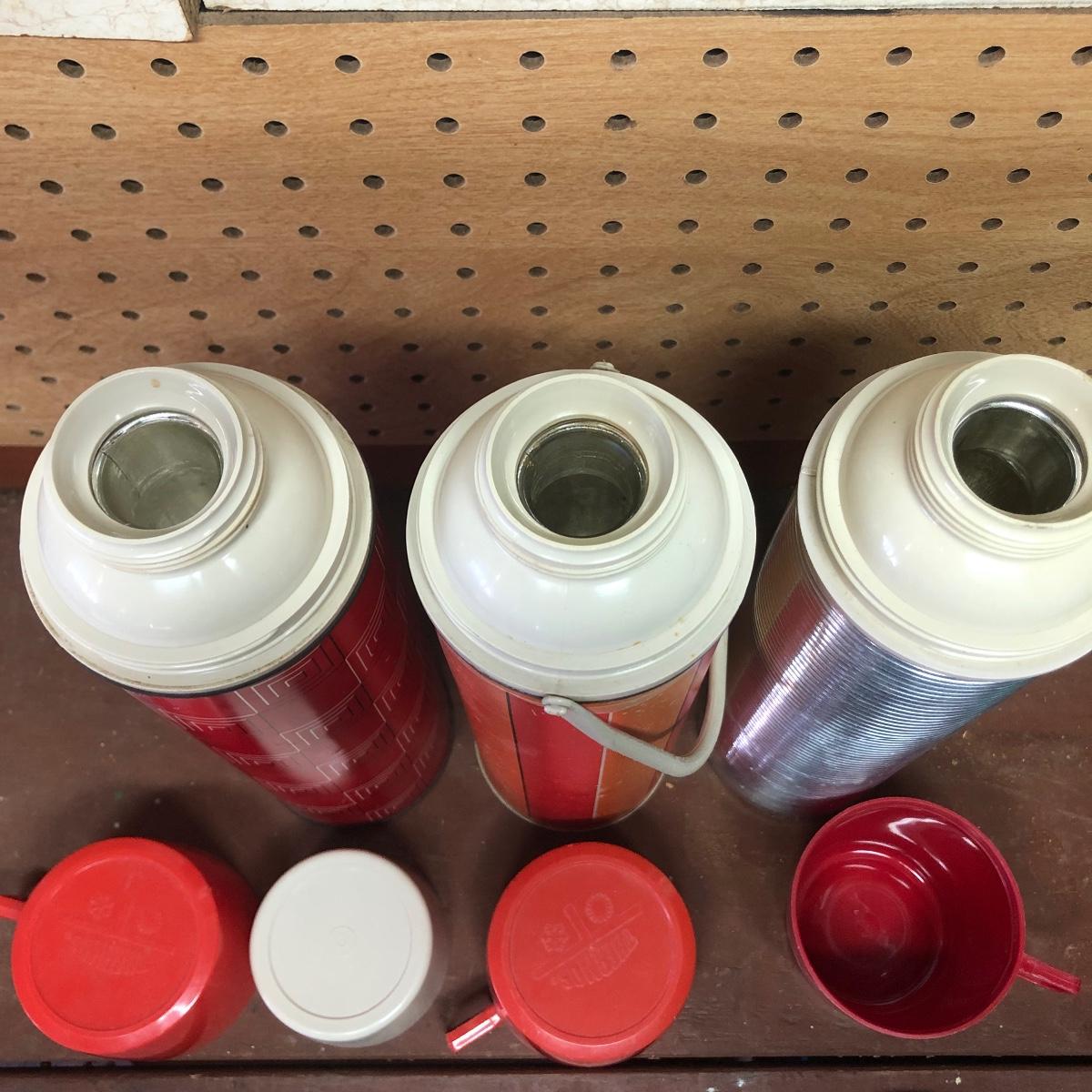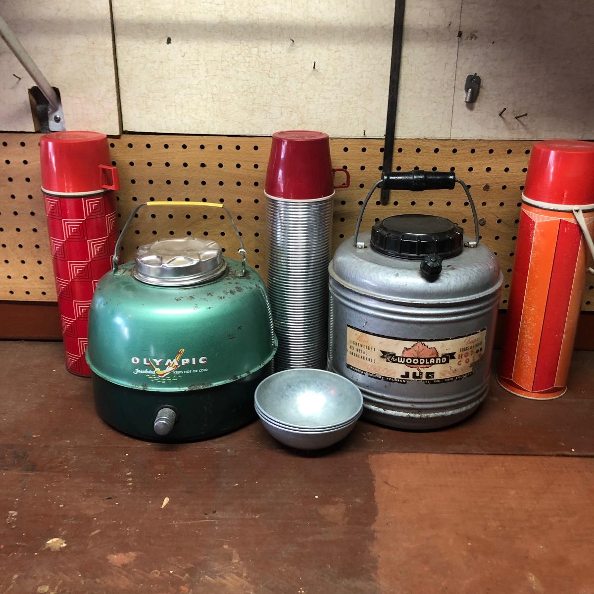 Lot includes three vintage Thermoses all with glass liners, Olympic Insulated metal jug and a Woodland metal jug. The Woodland jug has some rust on bottom, see pictures.