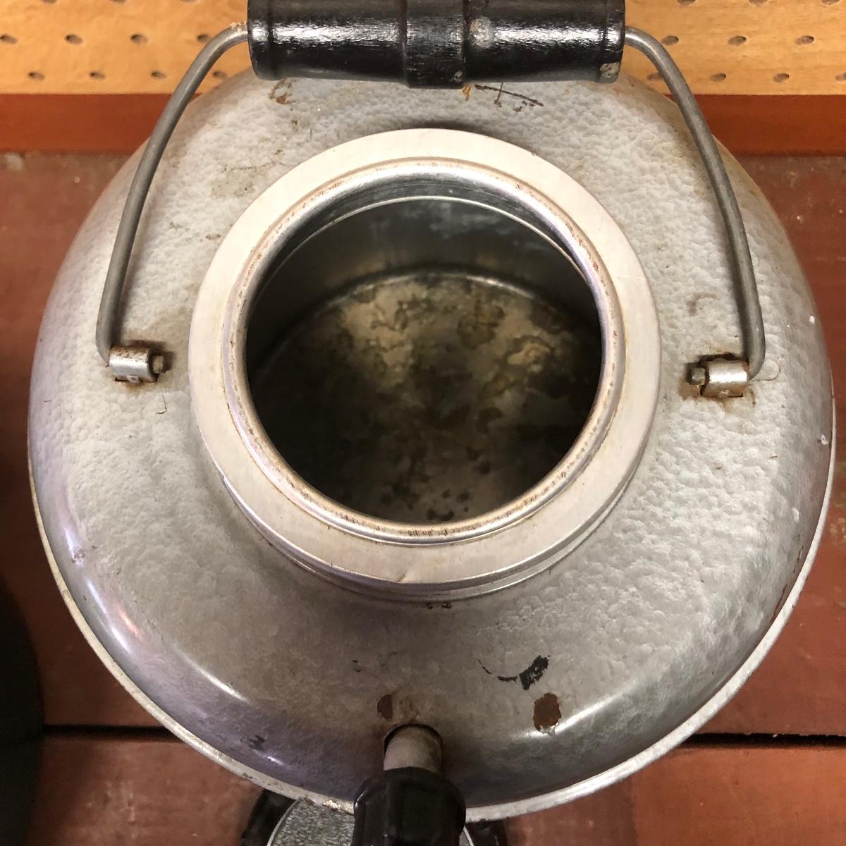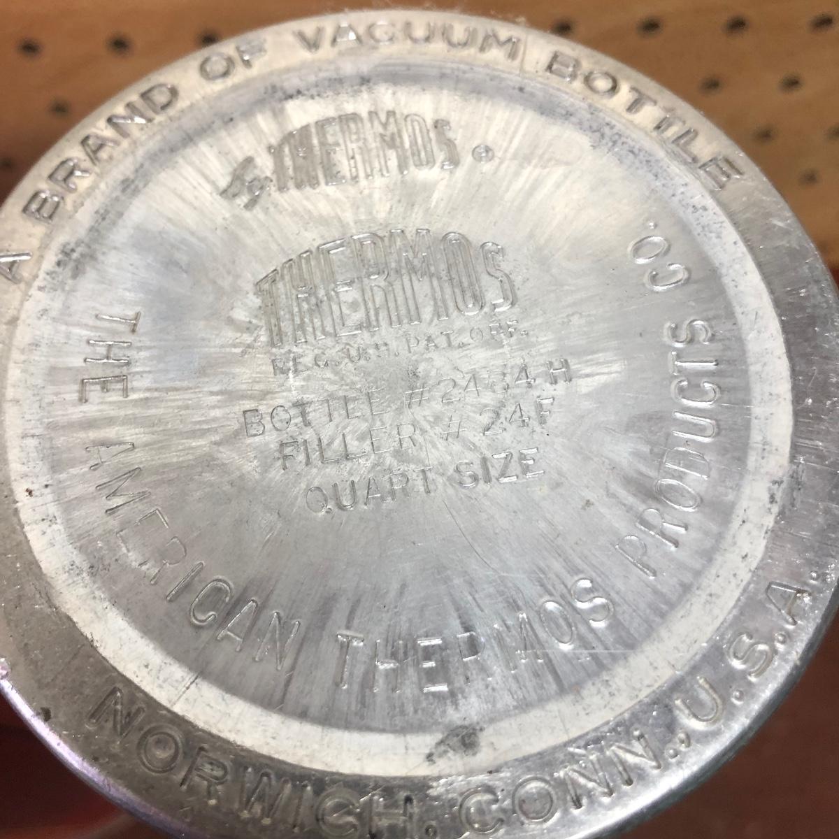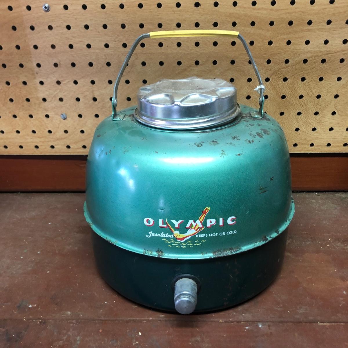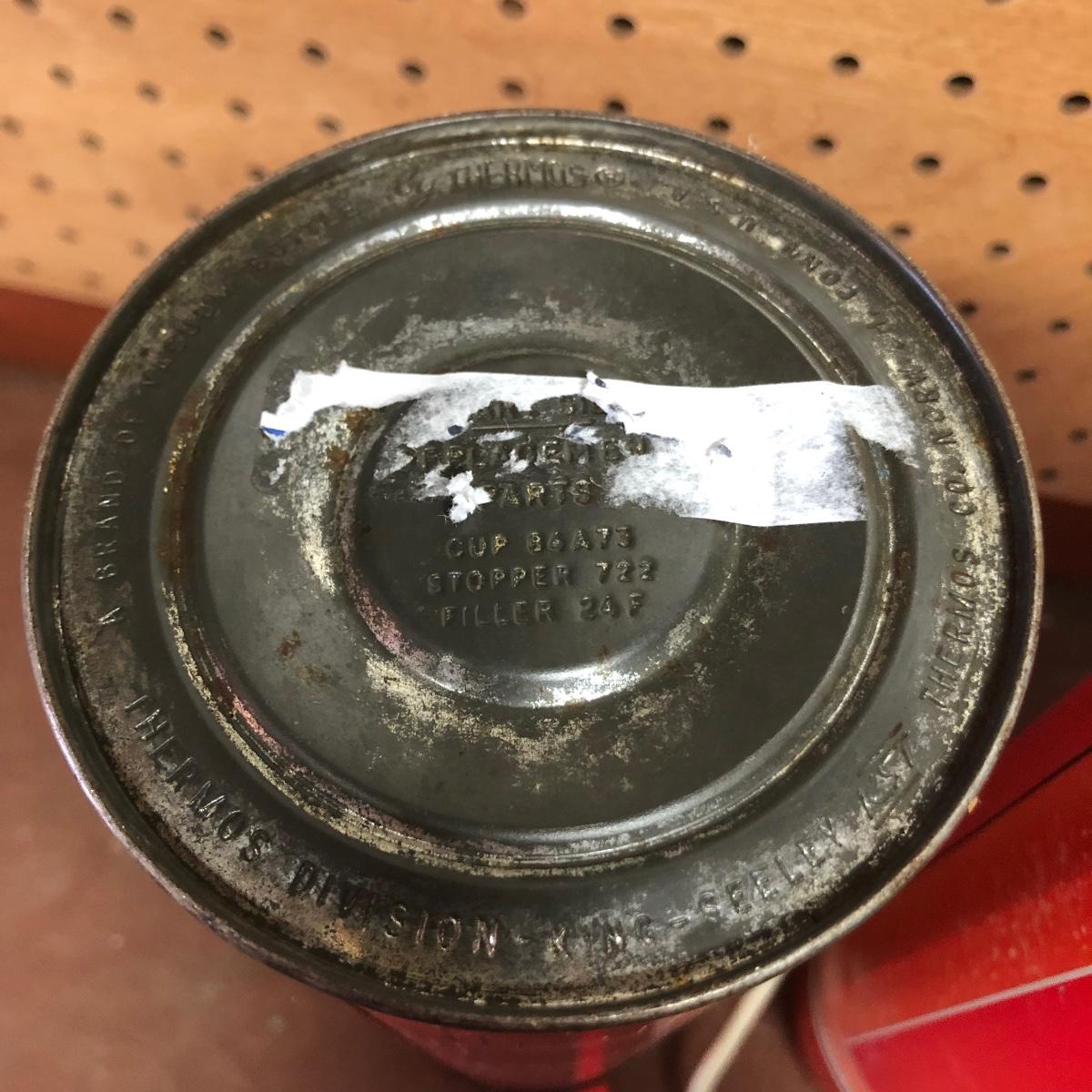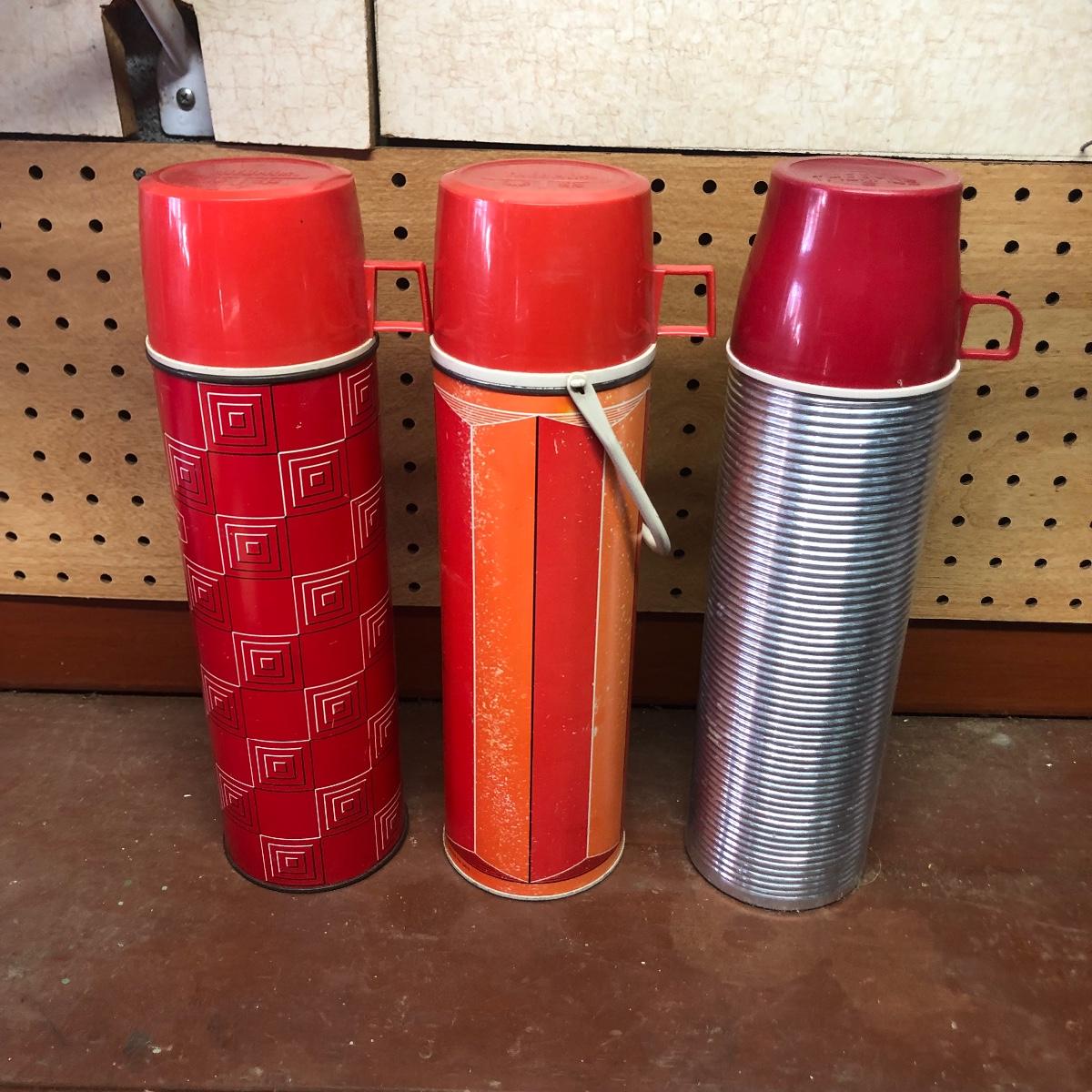 Lot includes three vintage Thermoses all with glass liners, Olympic Insulated metal jug and a Woodland metal jug. The Woodland jug has some rust on bottom, see pictures.