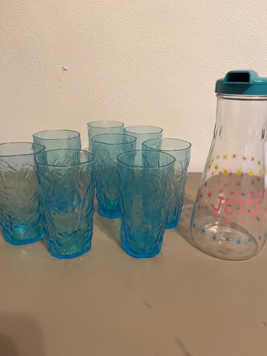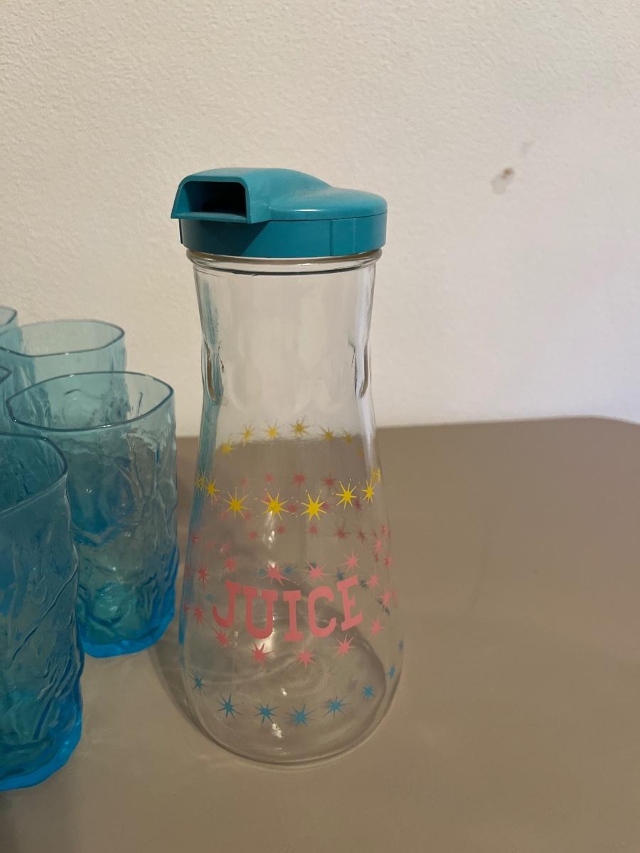Vintage juice, dispenser, and glasses
