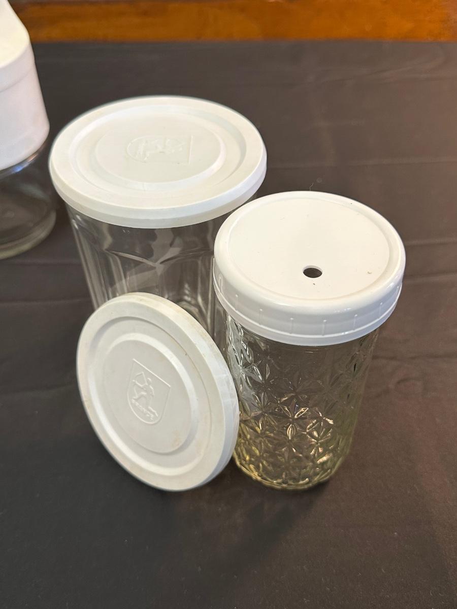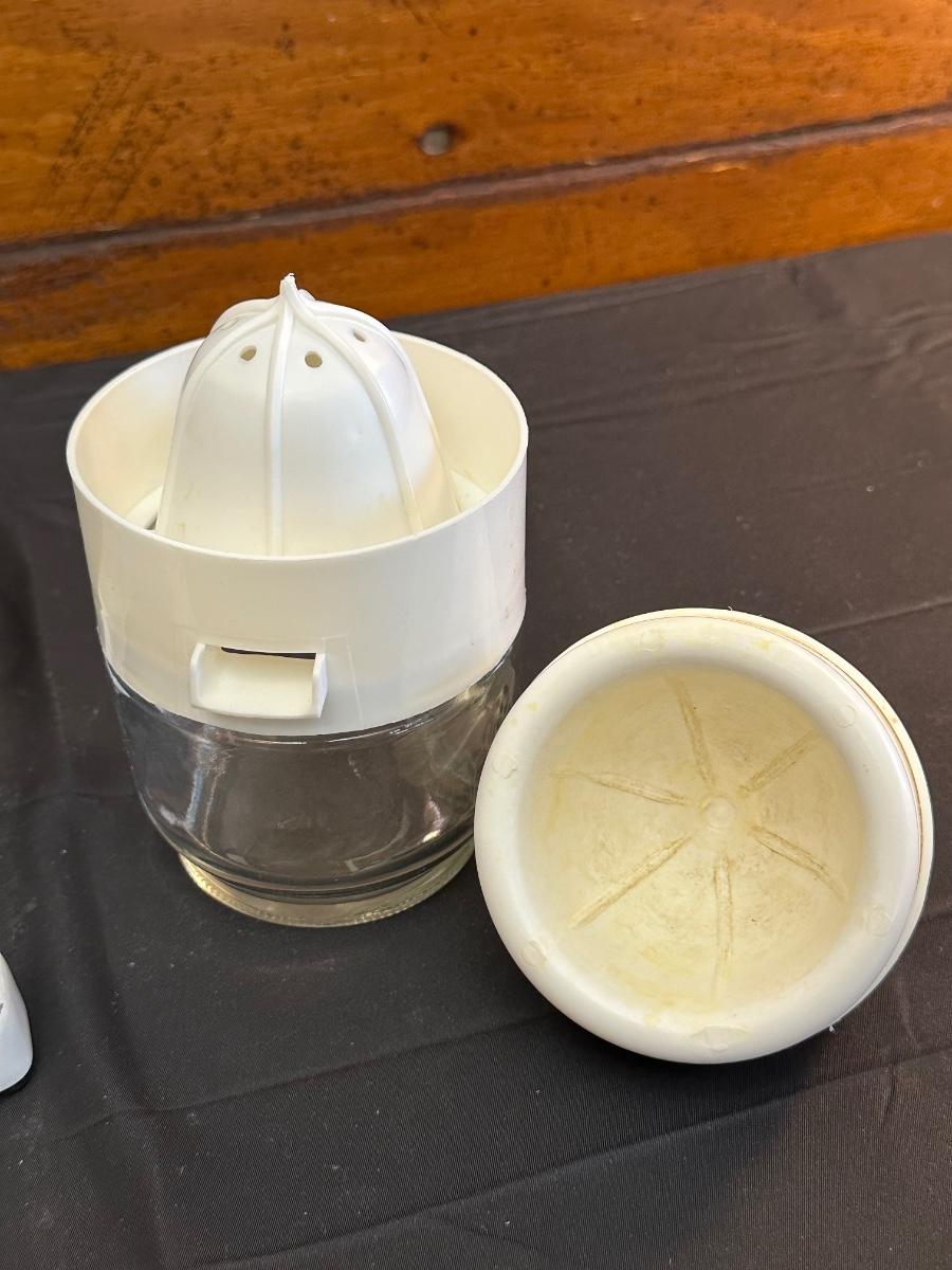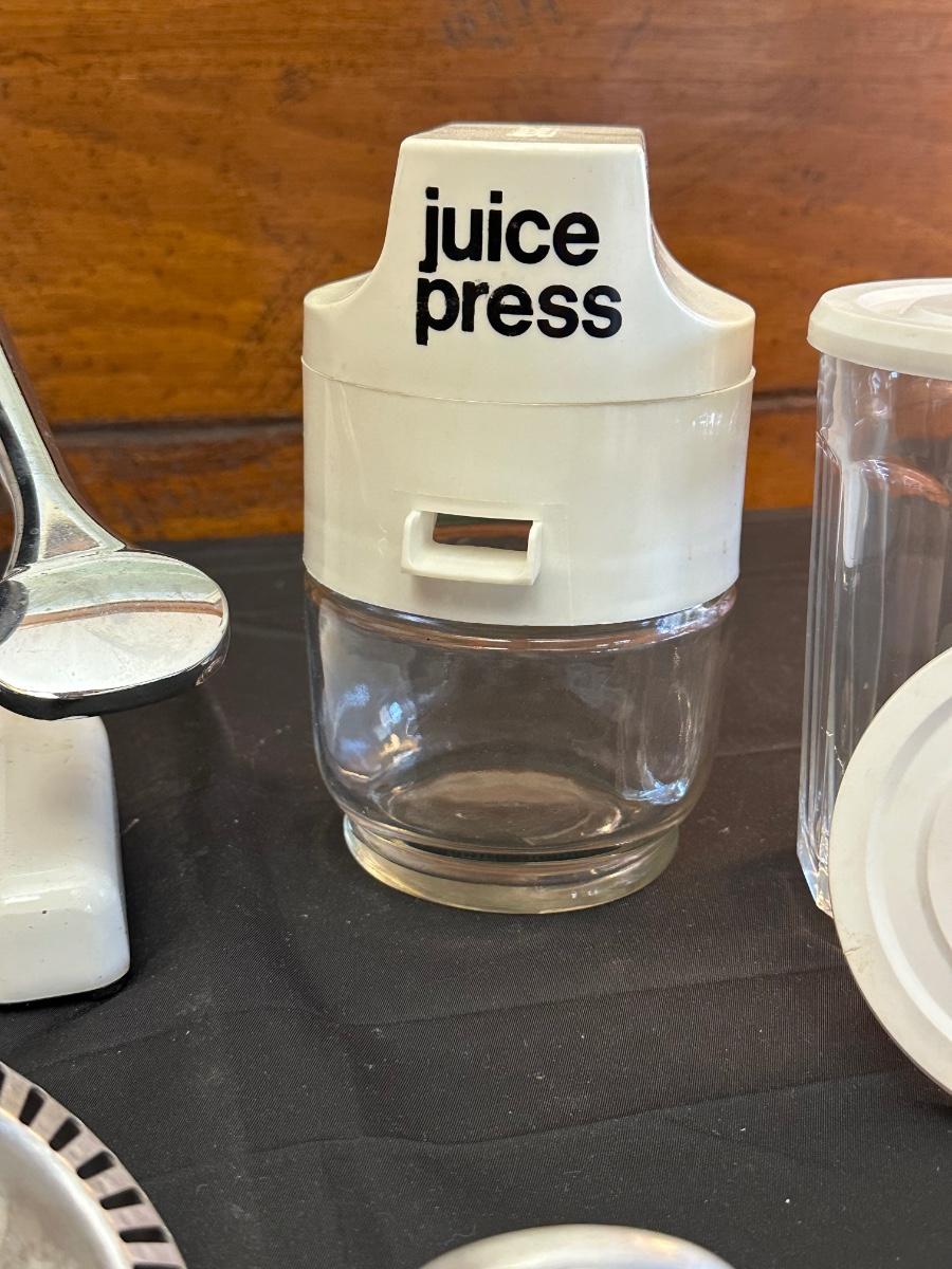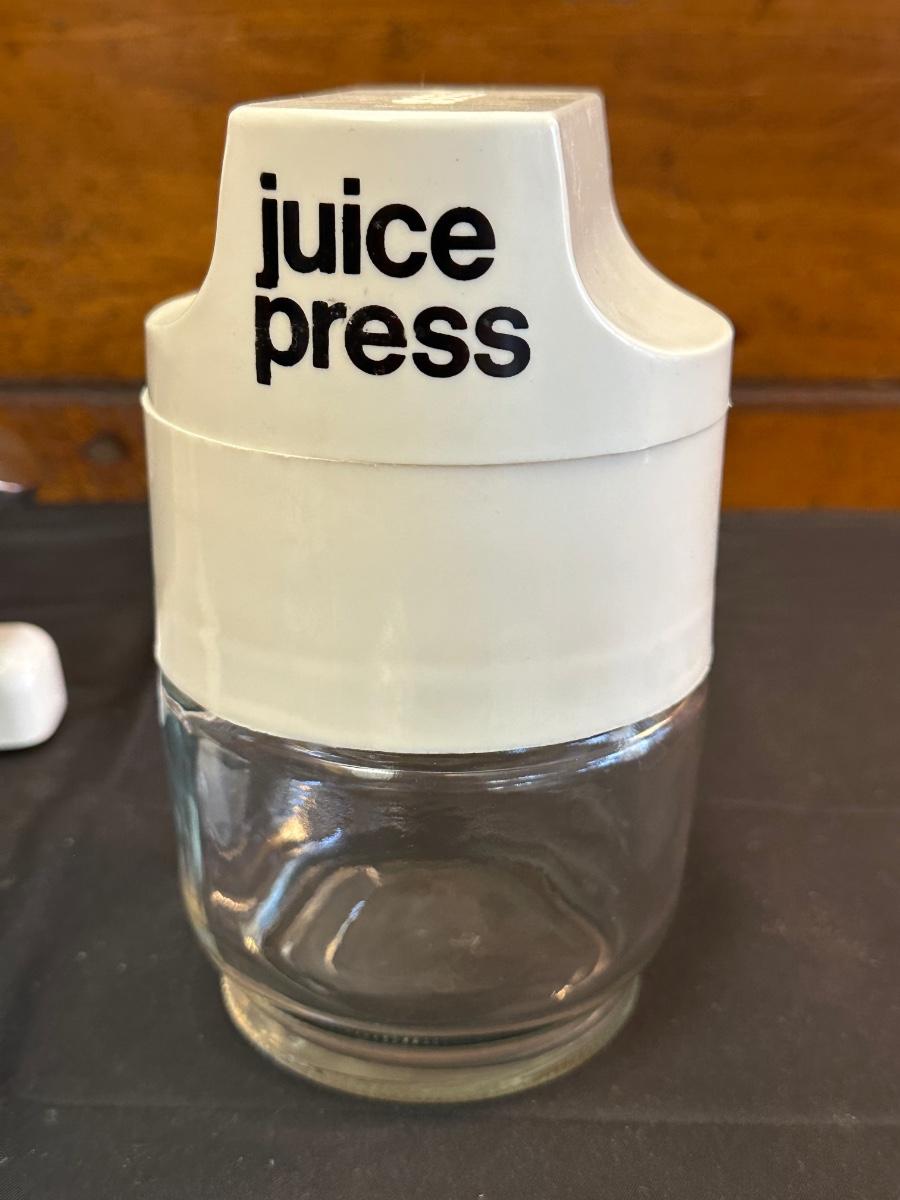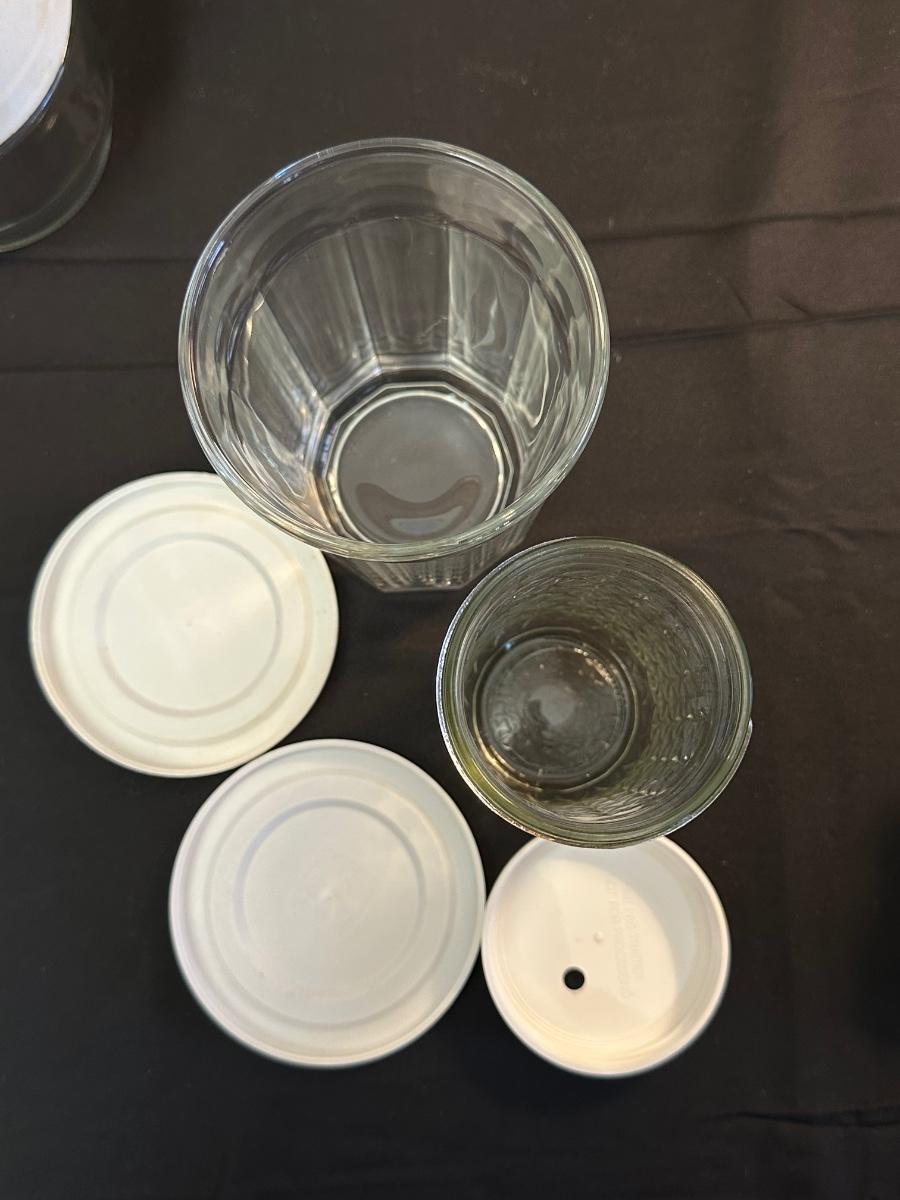 Includes storage glasses for juice — all items are in used condition. Also comes with Luminarc glass and two lids!