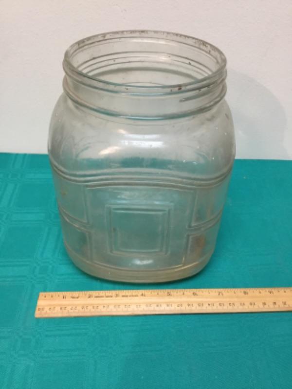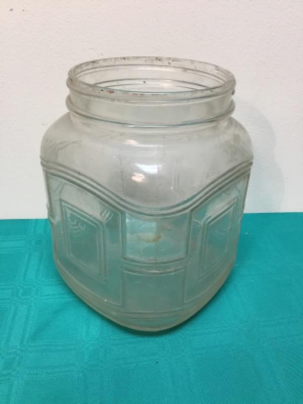 Large unbranded vintage glass food storage jar. Diameter of opening measures 5“ across. Body of container measures 6.5” across.