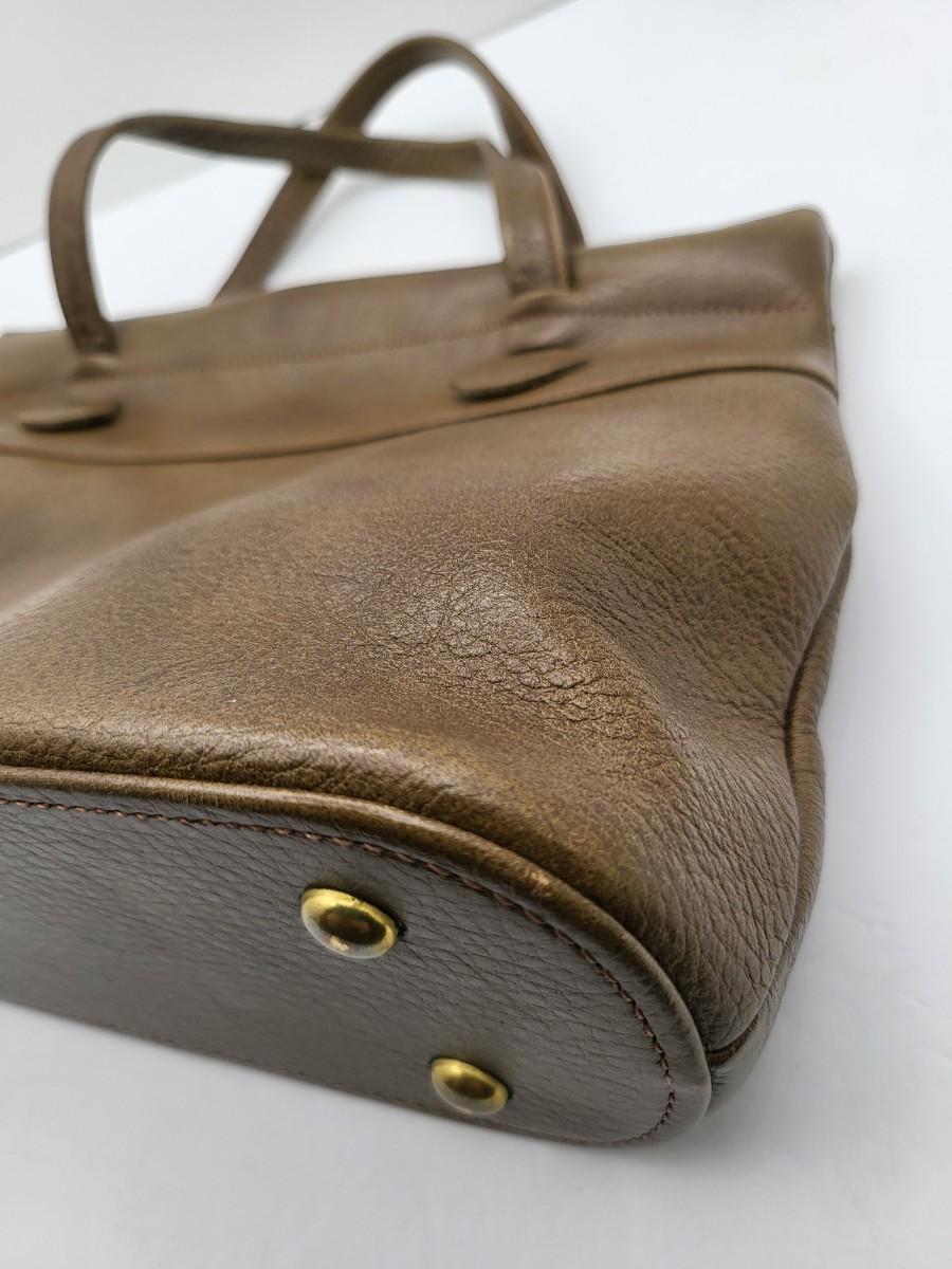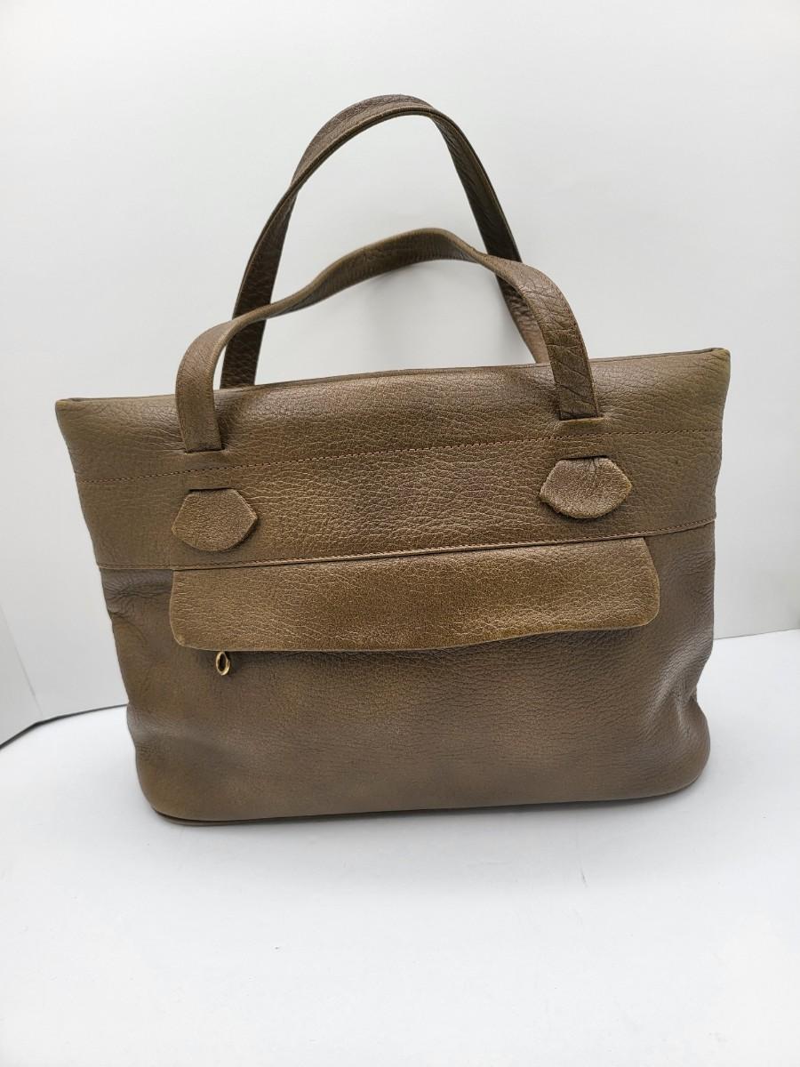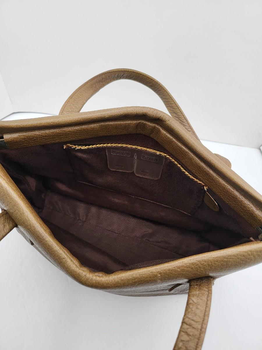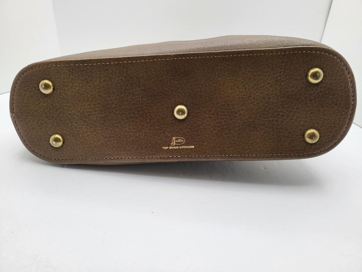 Vintage MCM Justin, medium brown, top grain cowhide leather handbag. Double hand straps, zipper front pocket, five brass bottom feet. Clean well made lining. Very good condition.