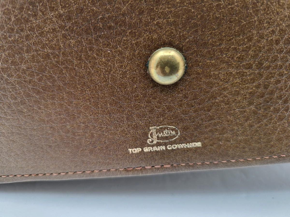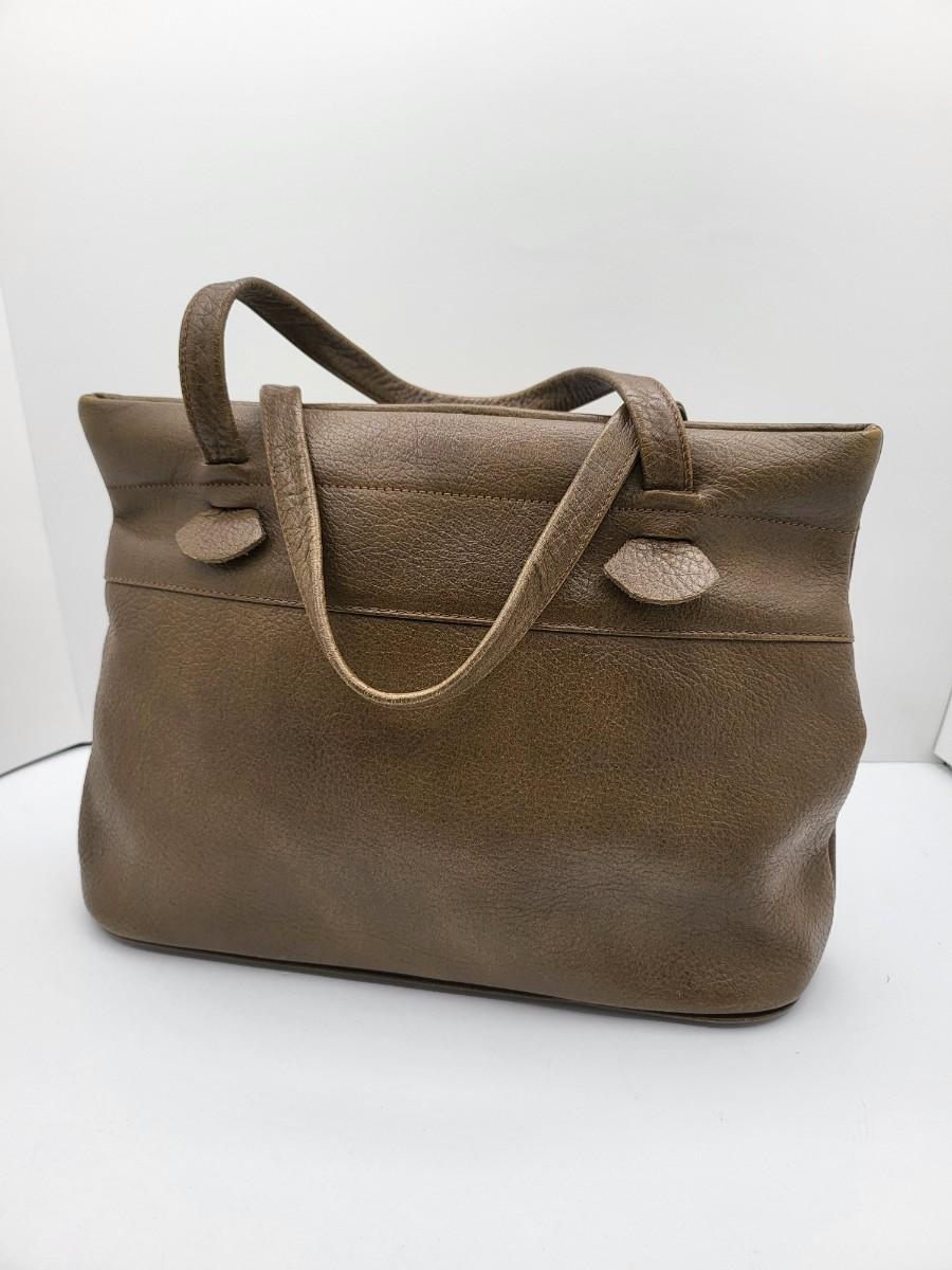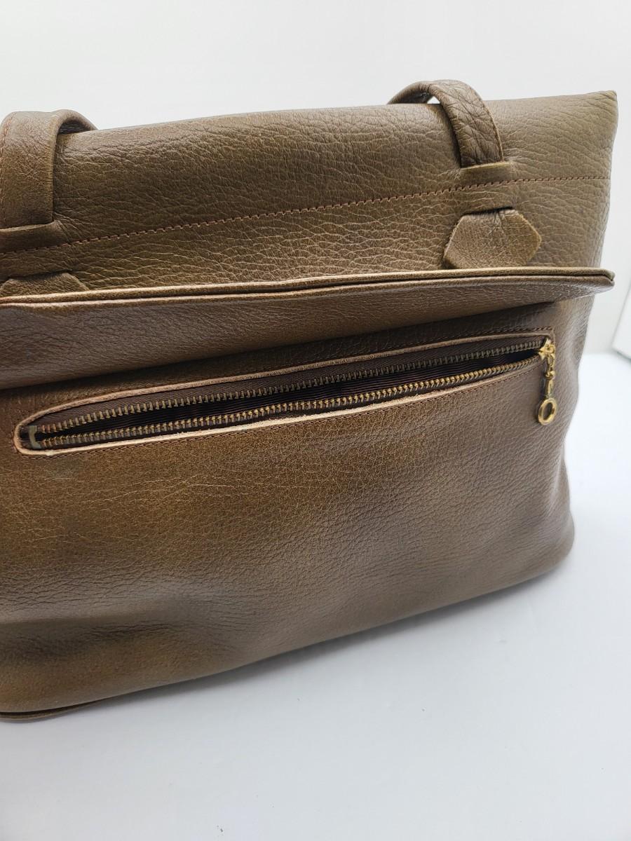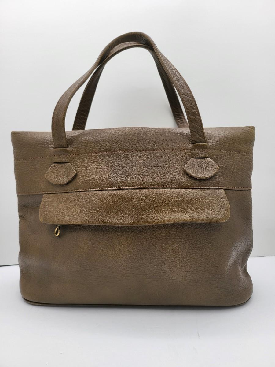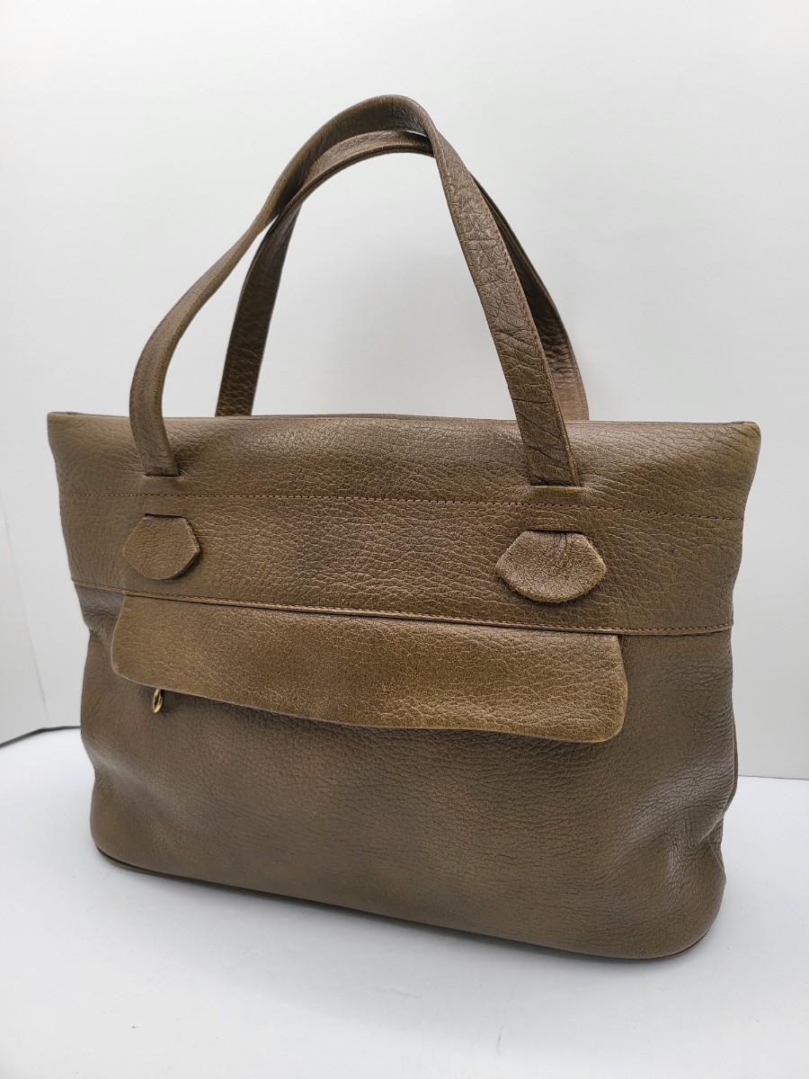 Vintage MCM Justin, medium brown, top grain cowhide leather handbag. Double hand straps, zipper front pocket, five brass bottom feet. Clean well made lining. Very good condition.
