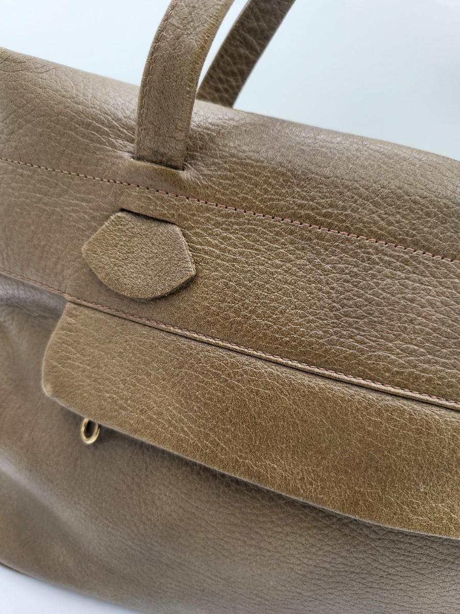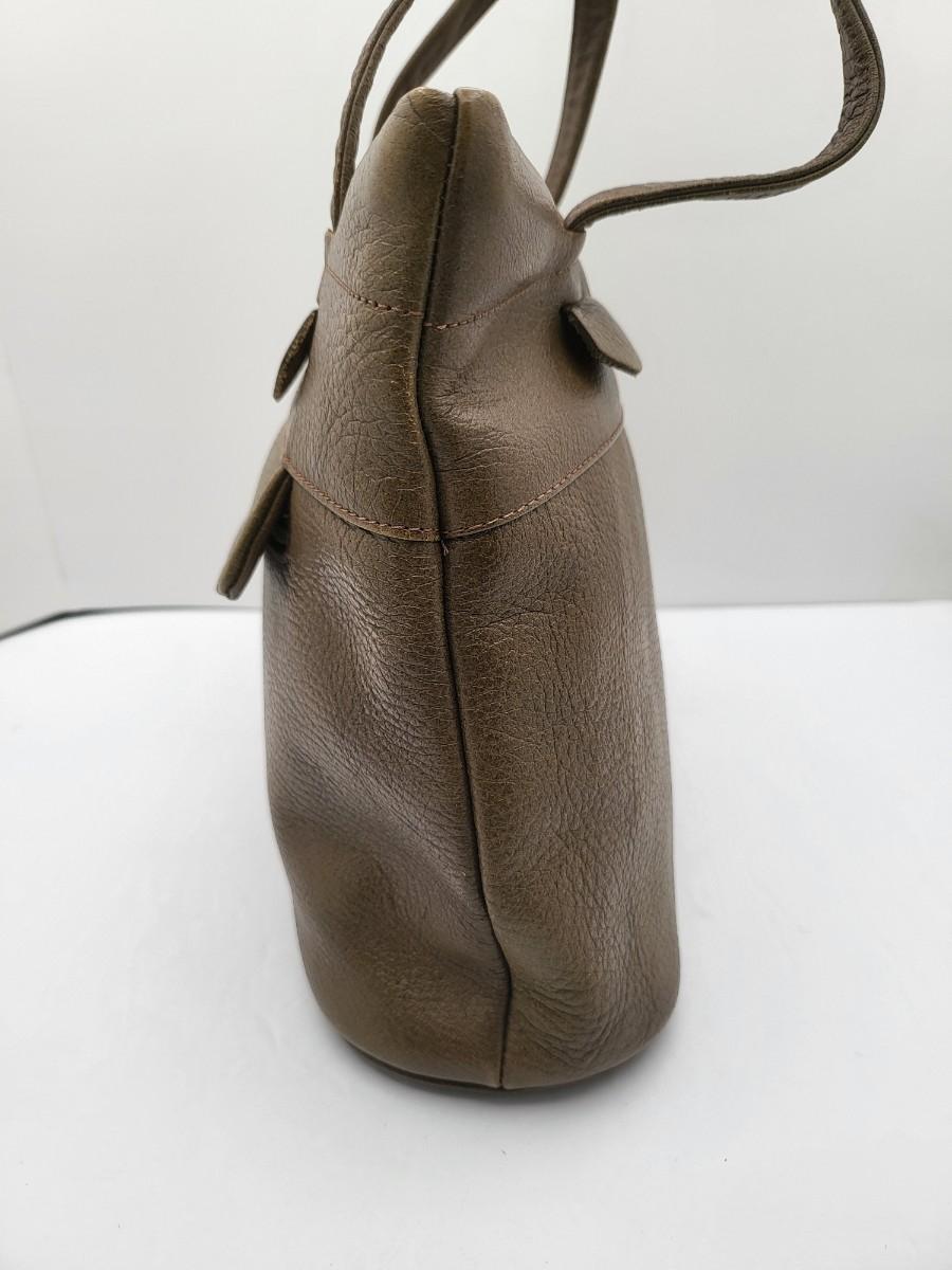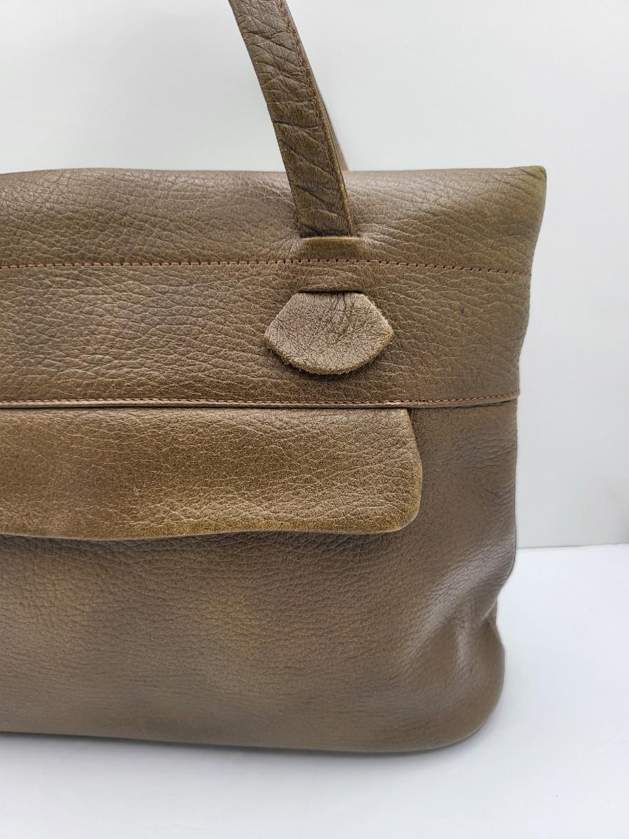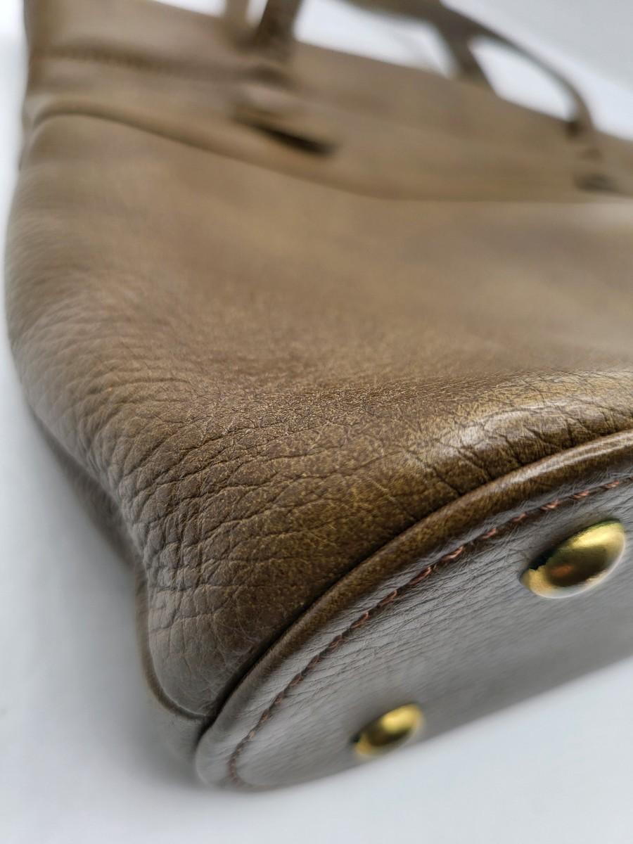 Vintage MCM Justin, medium brown, top grain cowhide leather handbag. Double hand straps, zipper front pocket, five brass bottom feet. Clean well made lining. Very good condition.