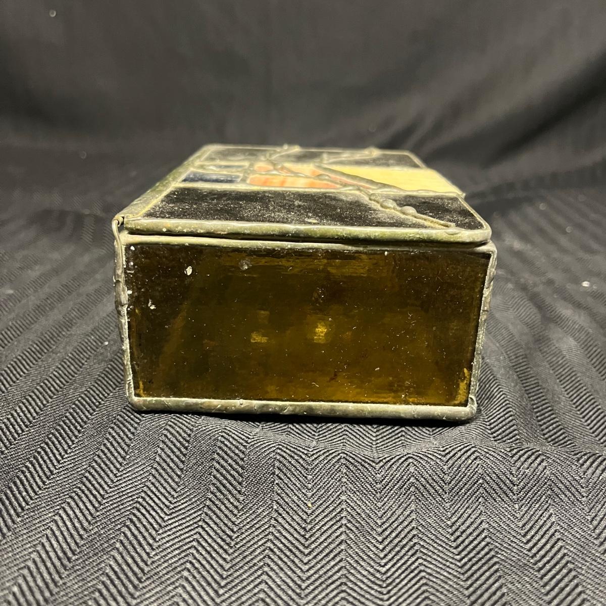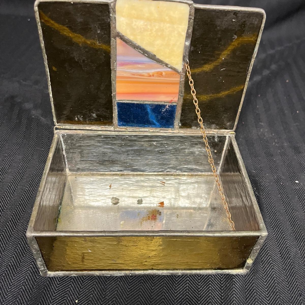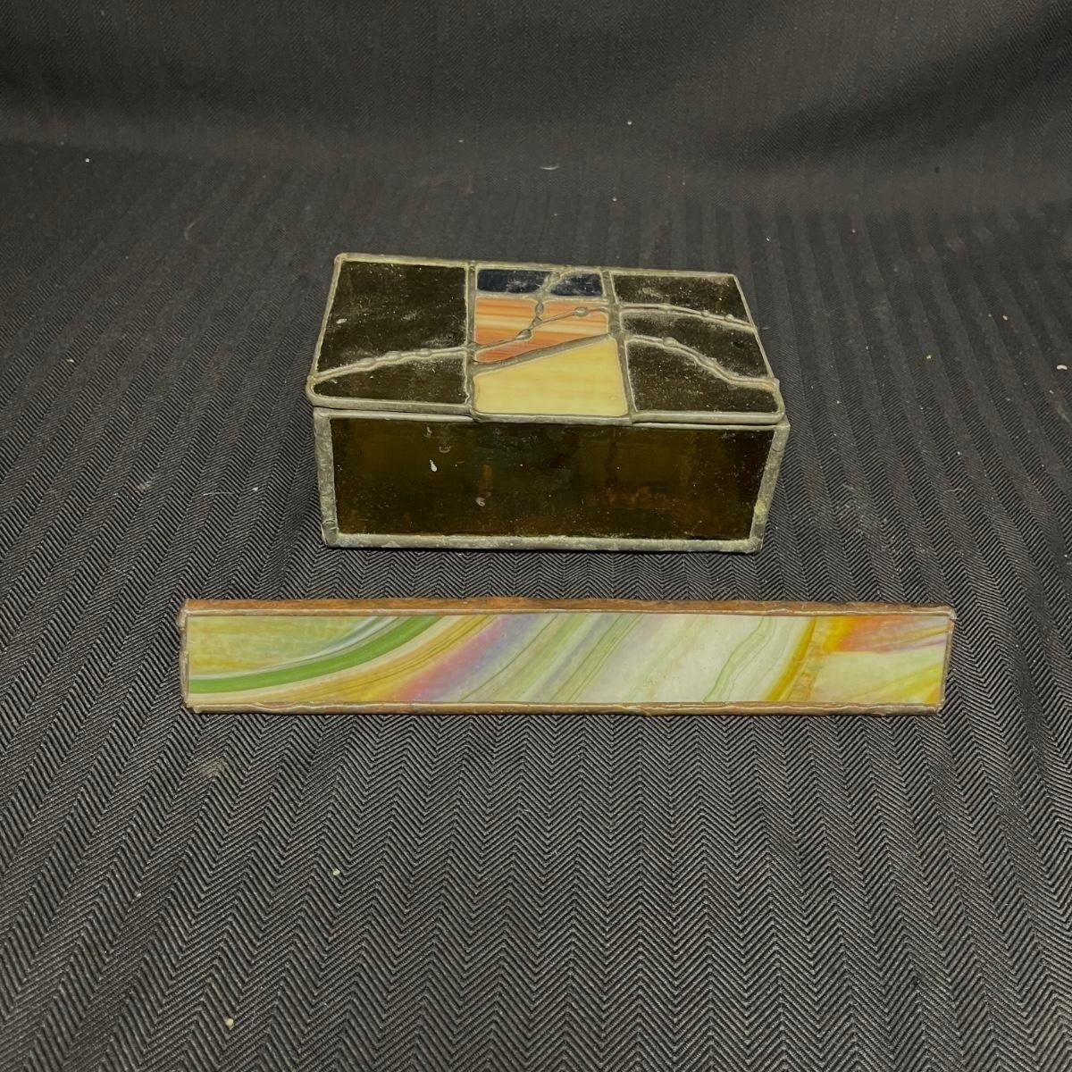 Lot includes a leaded glass box and a signed vintage kaleidoscope. Box measures 6” x 4” x 2.5”H.