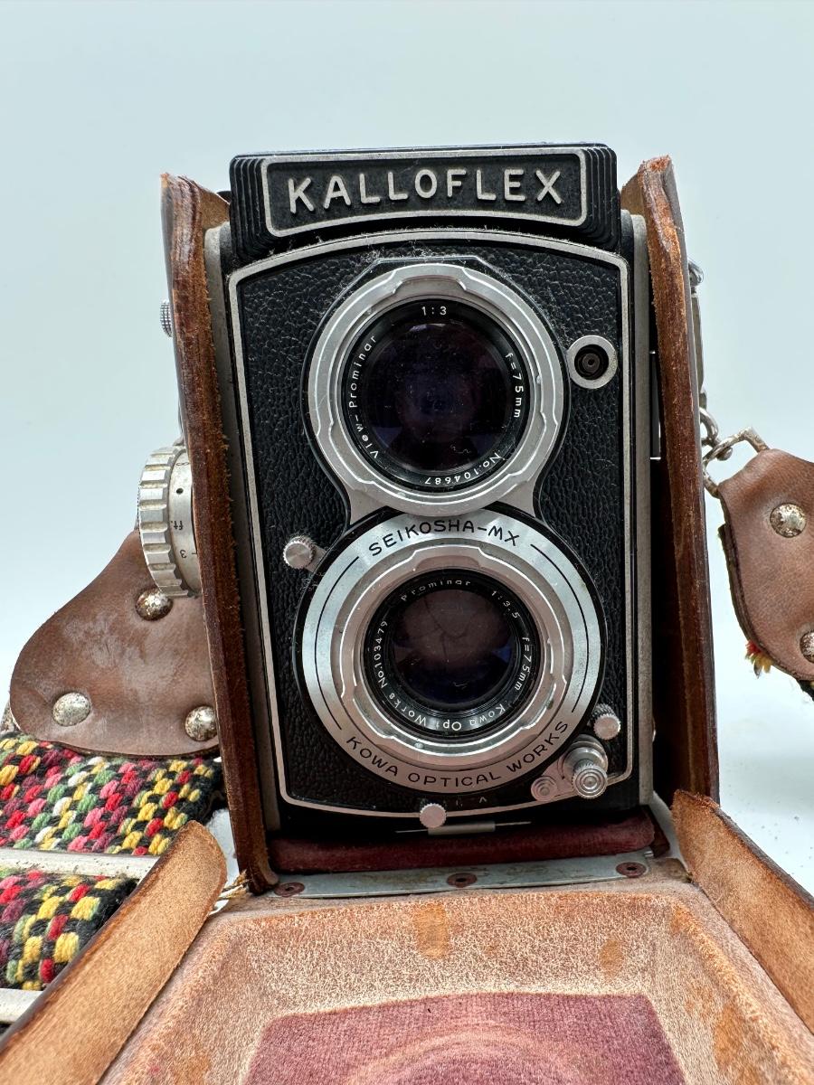 Vintage Kalloflex twin-lens reflex (TLR) camera made by Kowa Optical Works, Japan. Features a Prominar 75mm f/3.5 taking lens paired with a matching viewing lens, both housed in a Seikosha-MX shutter. Lenses have some dust and light haze; untested. The leather case has a tear on the side.