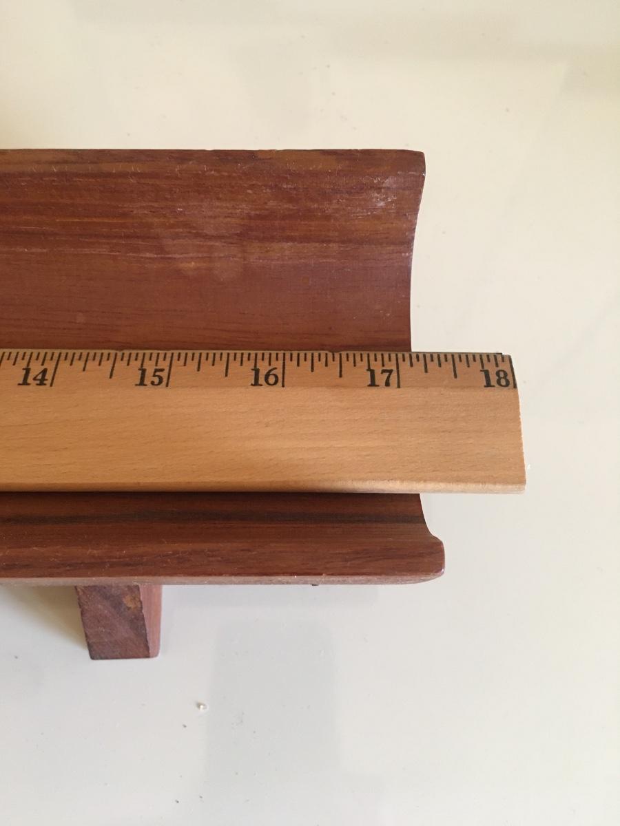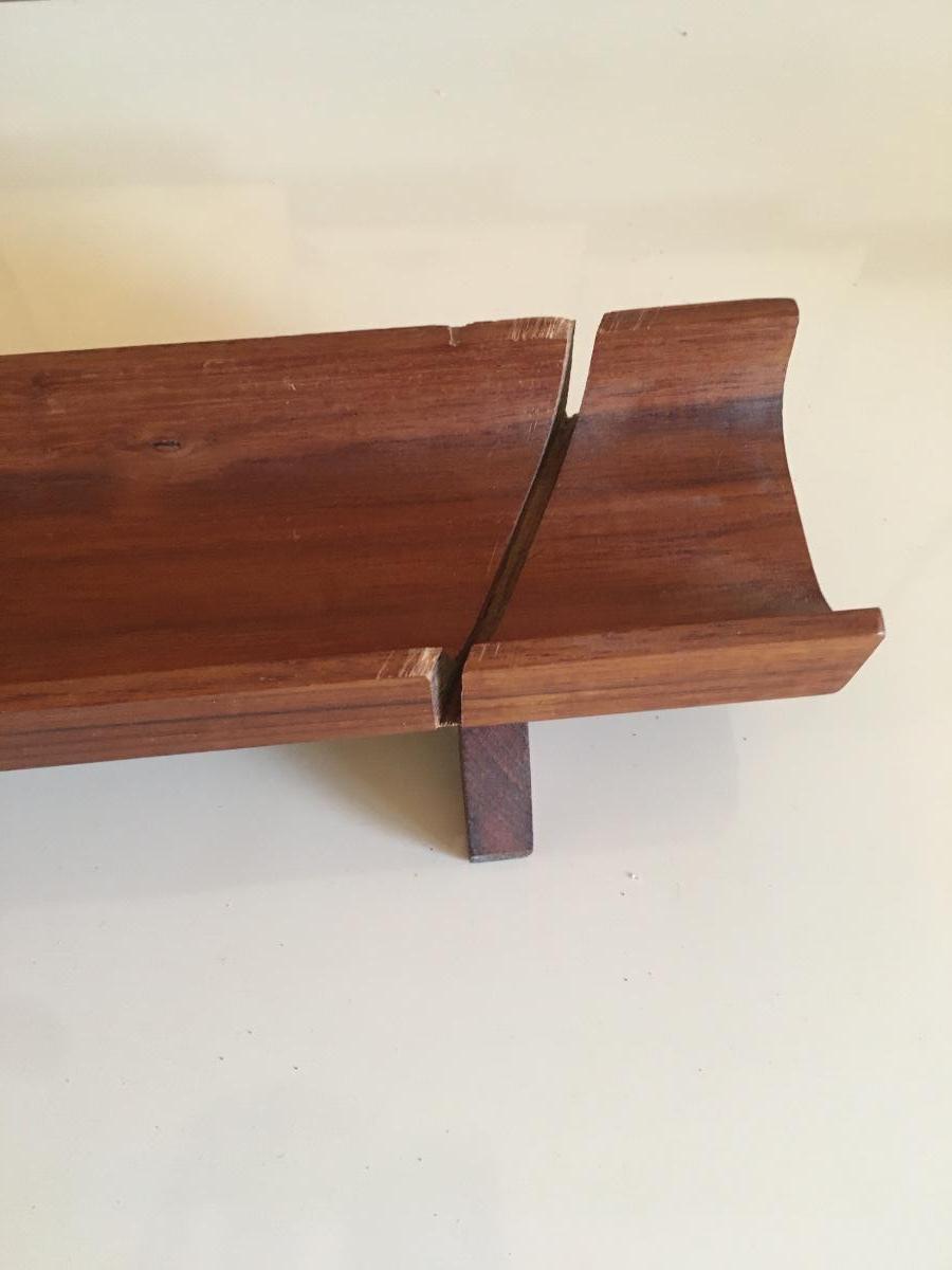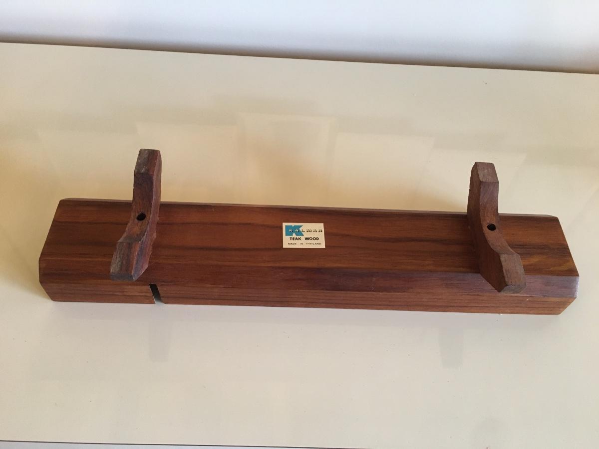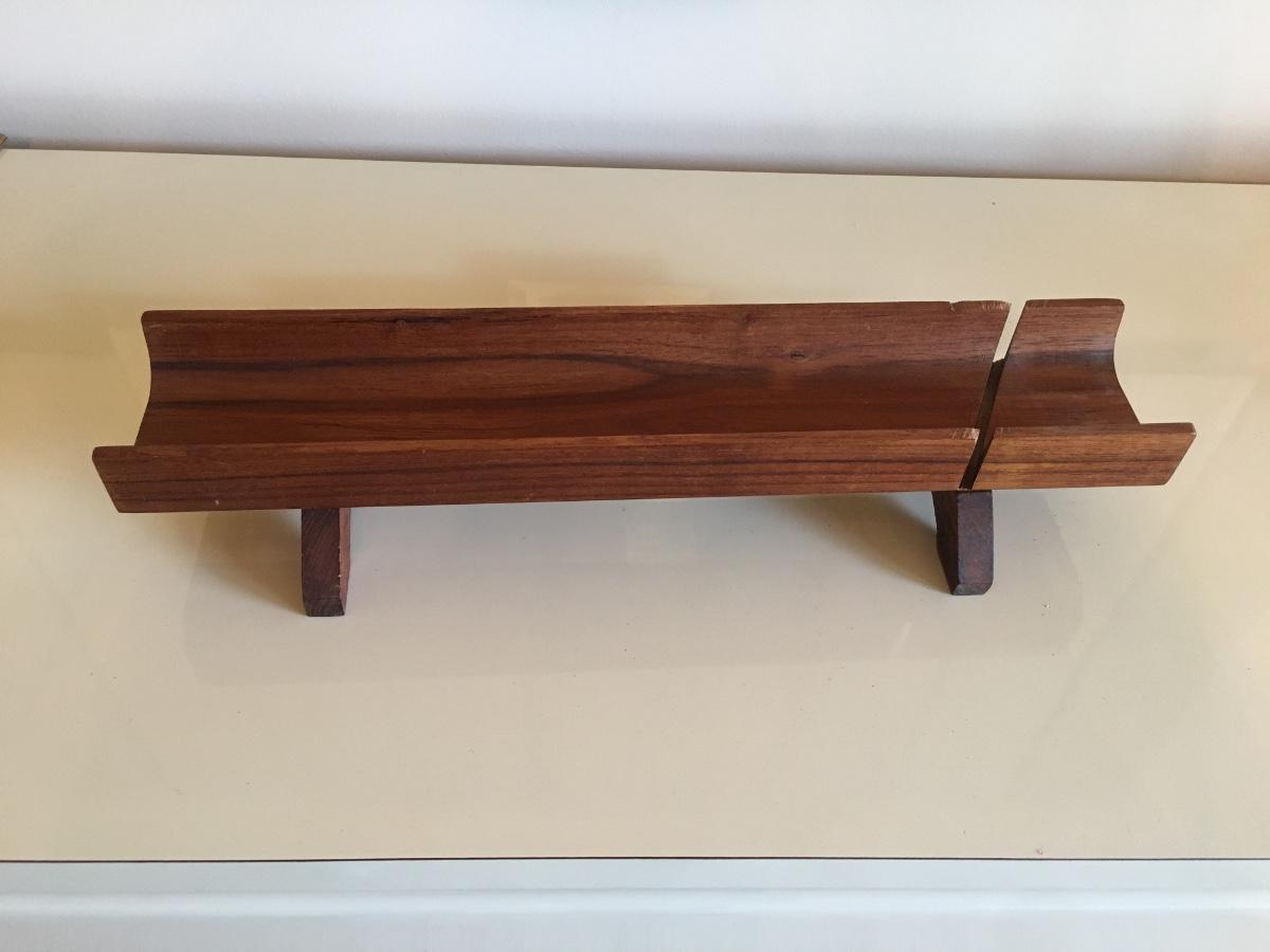 Teak baguette holder so you can slice your bread not your fingers. Some wear as shown in photo