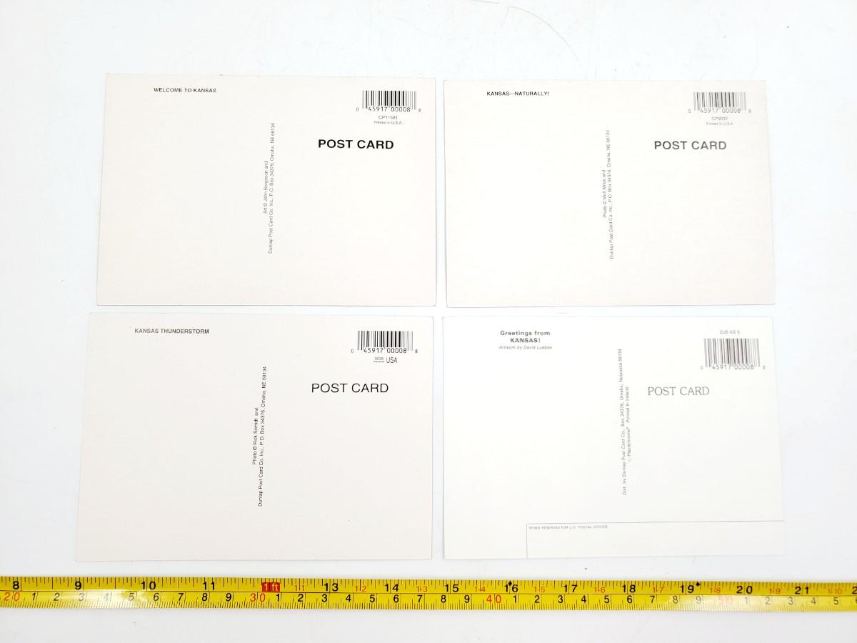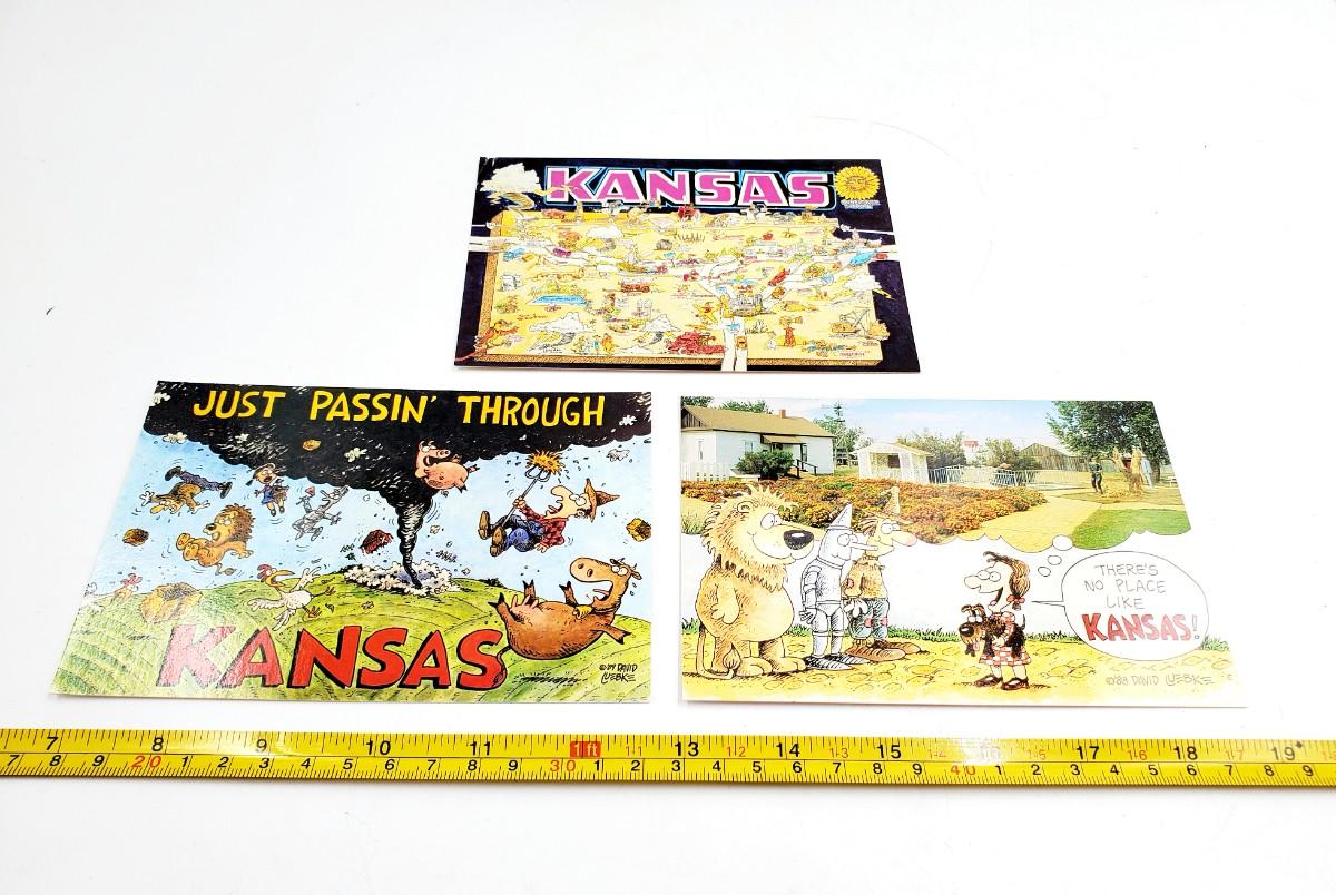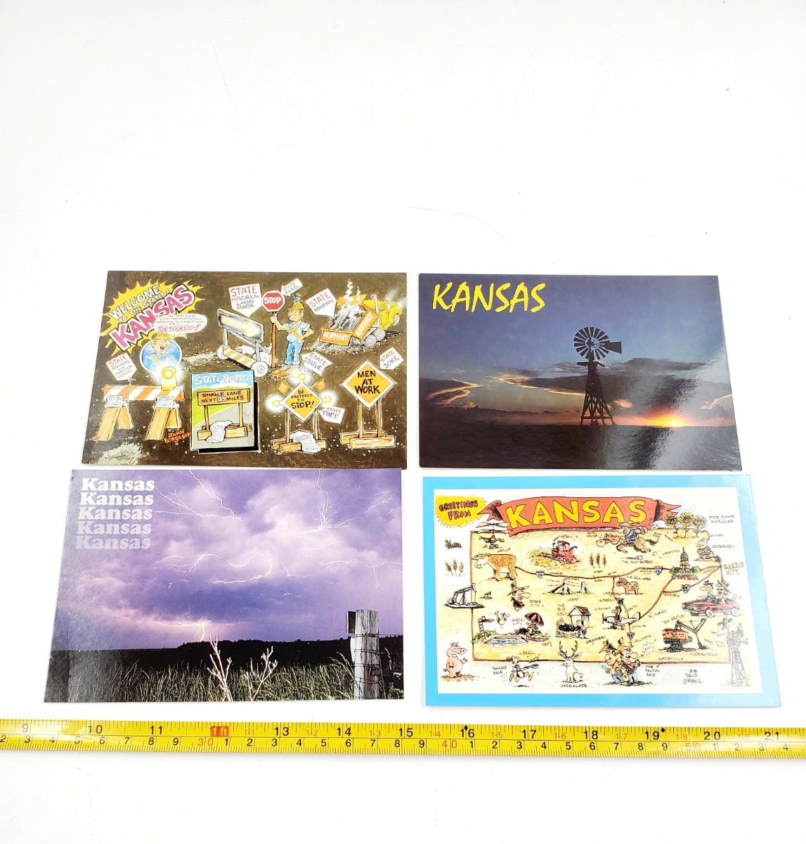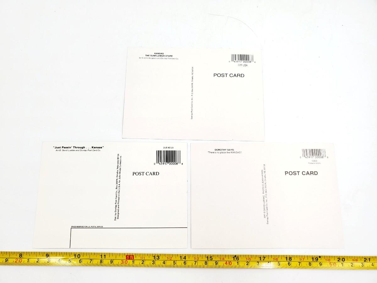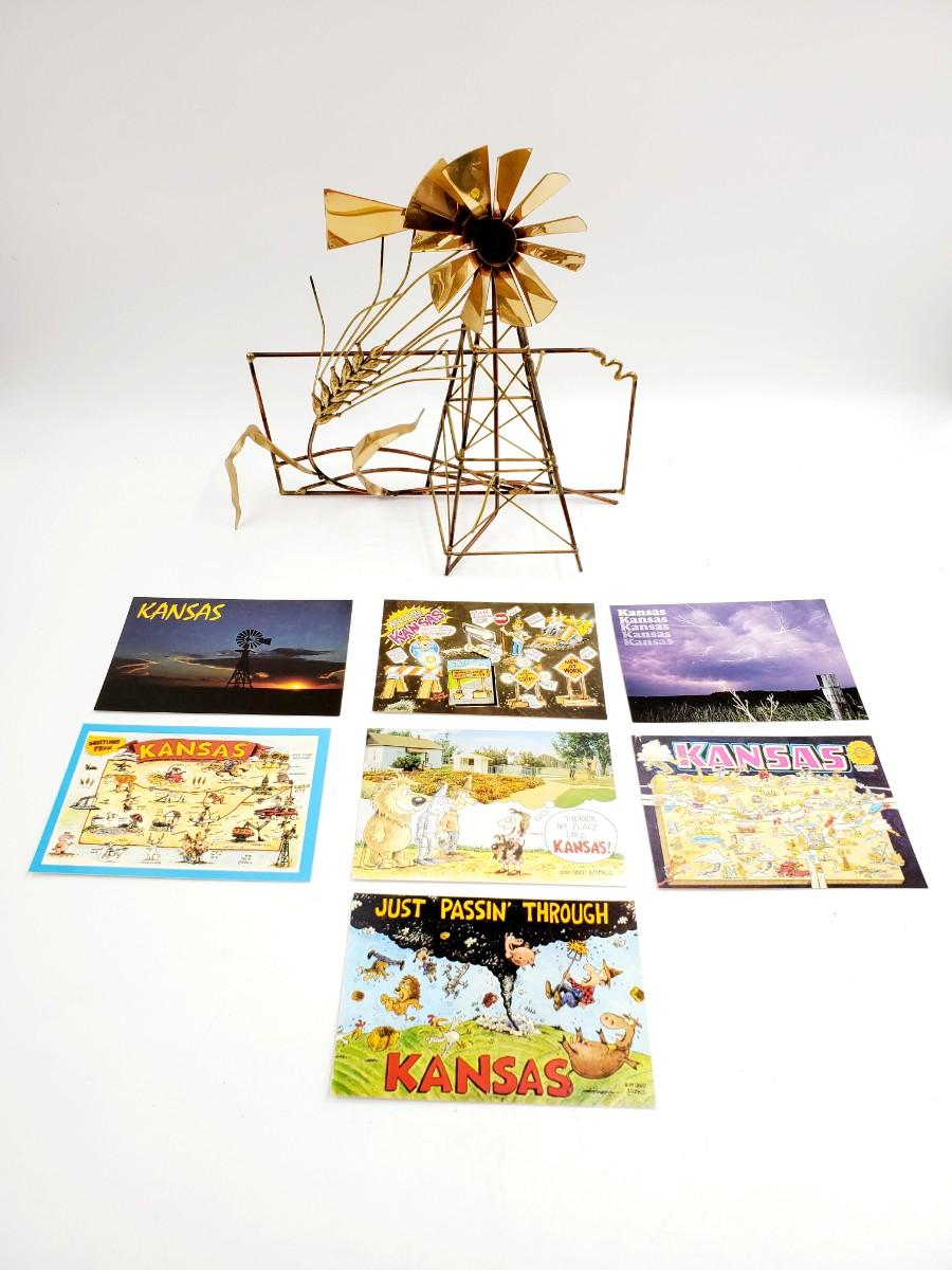 VINTAGE KANSAS POSTCARD BUNDLE AND KANSAS WHEAT AND WINDMILL METAL SCULPTURE