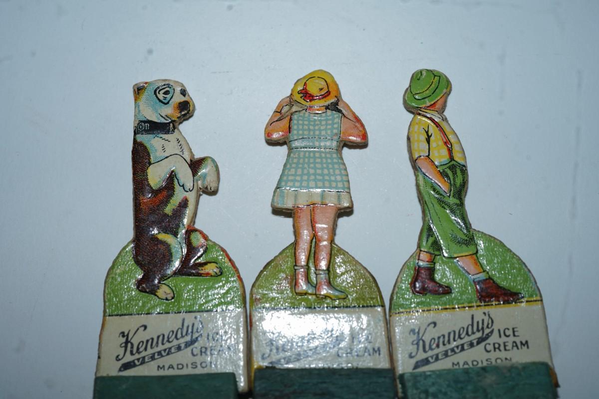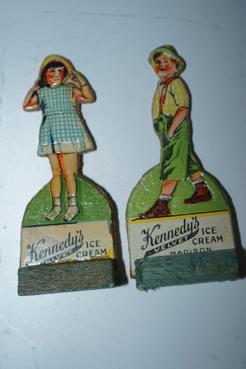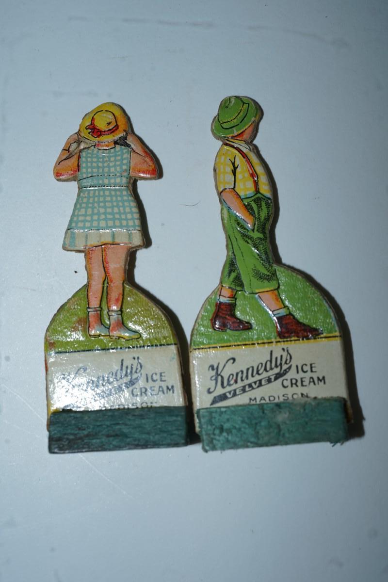 VINTAGE KENNEDY DAIRY OF MADISON CUT OUT ADVERTISING FIGURES ON WOODEN STANDS