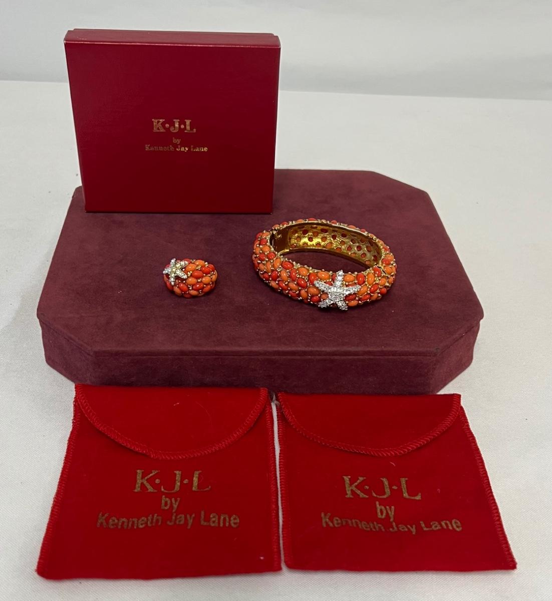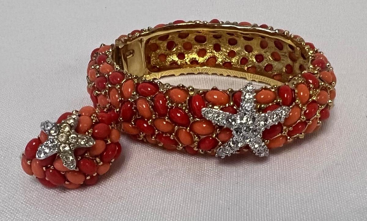 Includes a starfish coral cabochon bangle and ring. Total of 2 pieces. Ring size is 7. Includes original box. Measurement of box: 4" x 4.5" x 2". [LA]