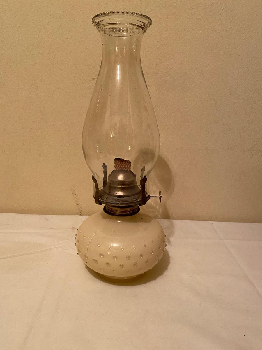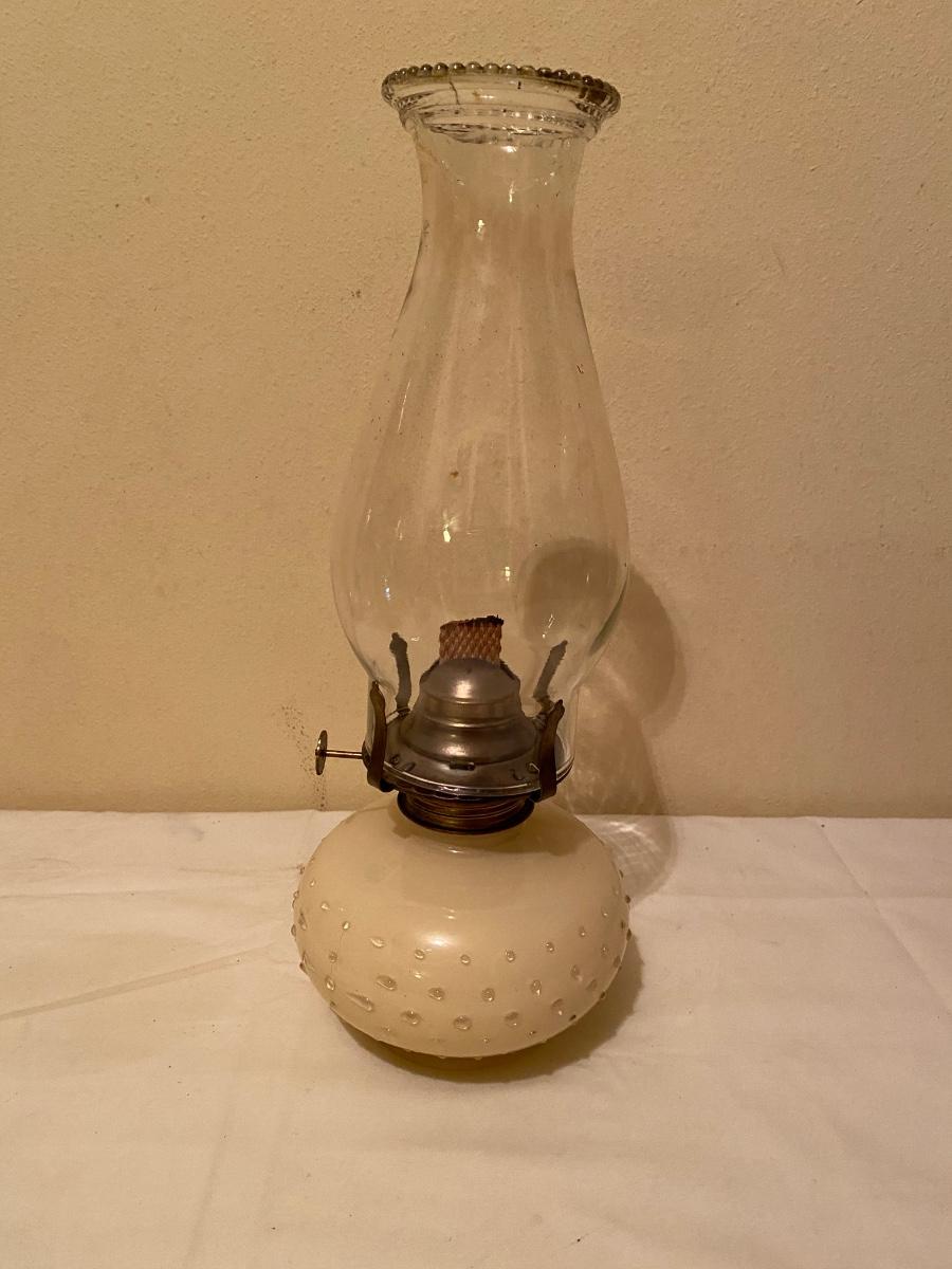 Vintage kerosene lantern with hobnail base Base is a cream color. The top is a little loose. Approx 13”h