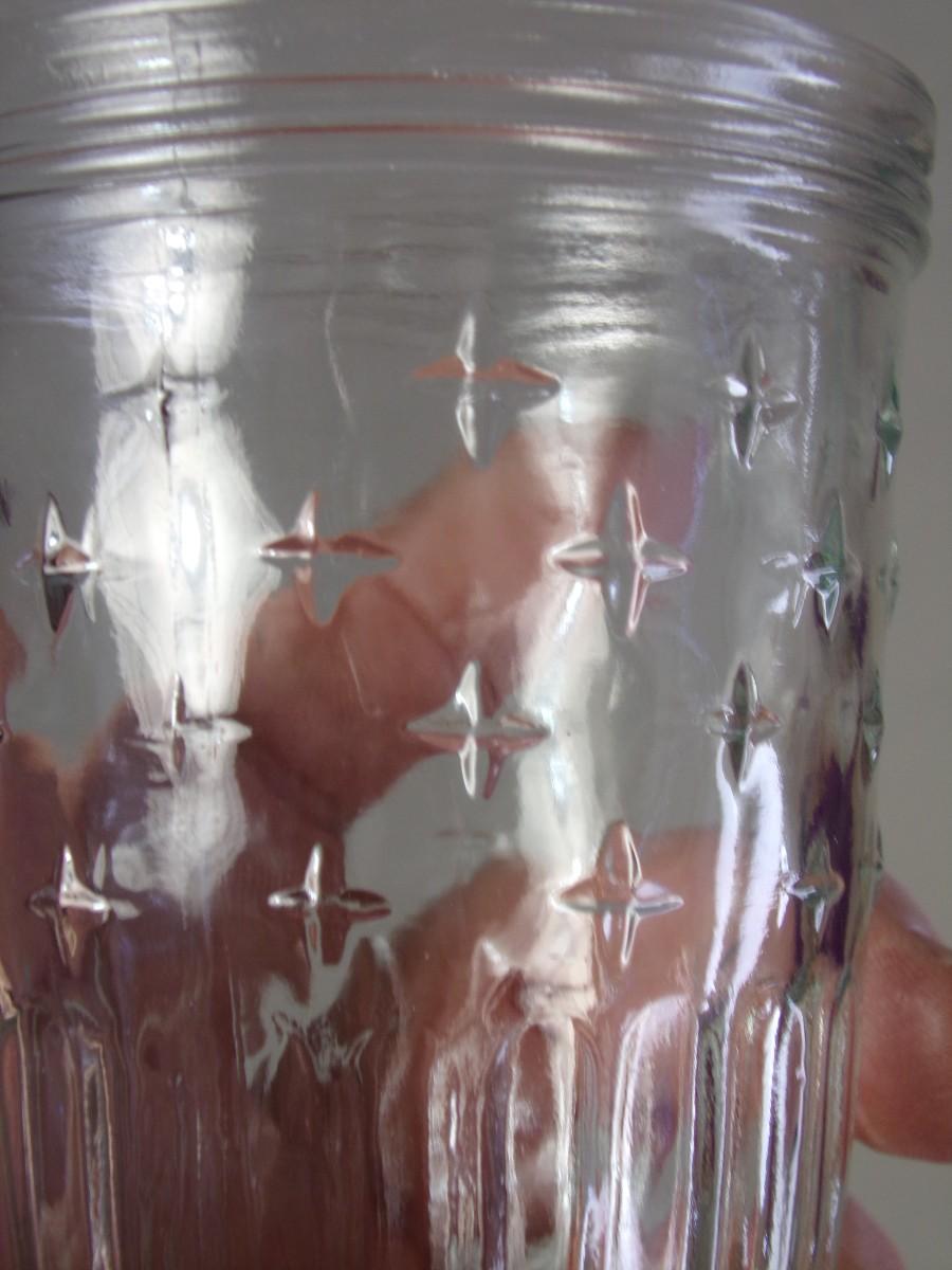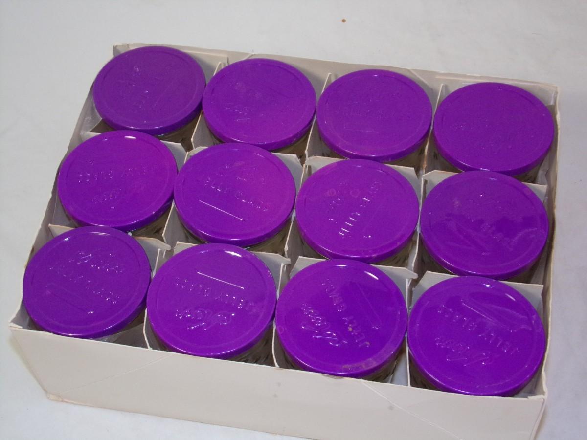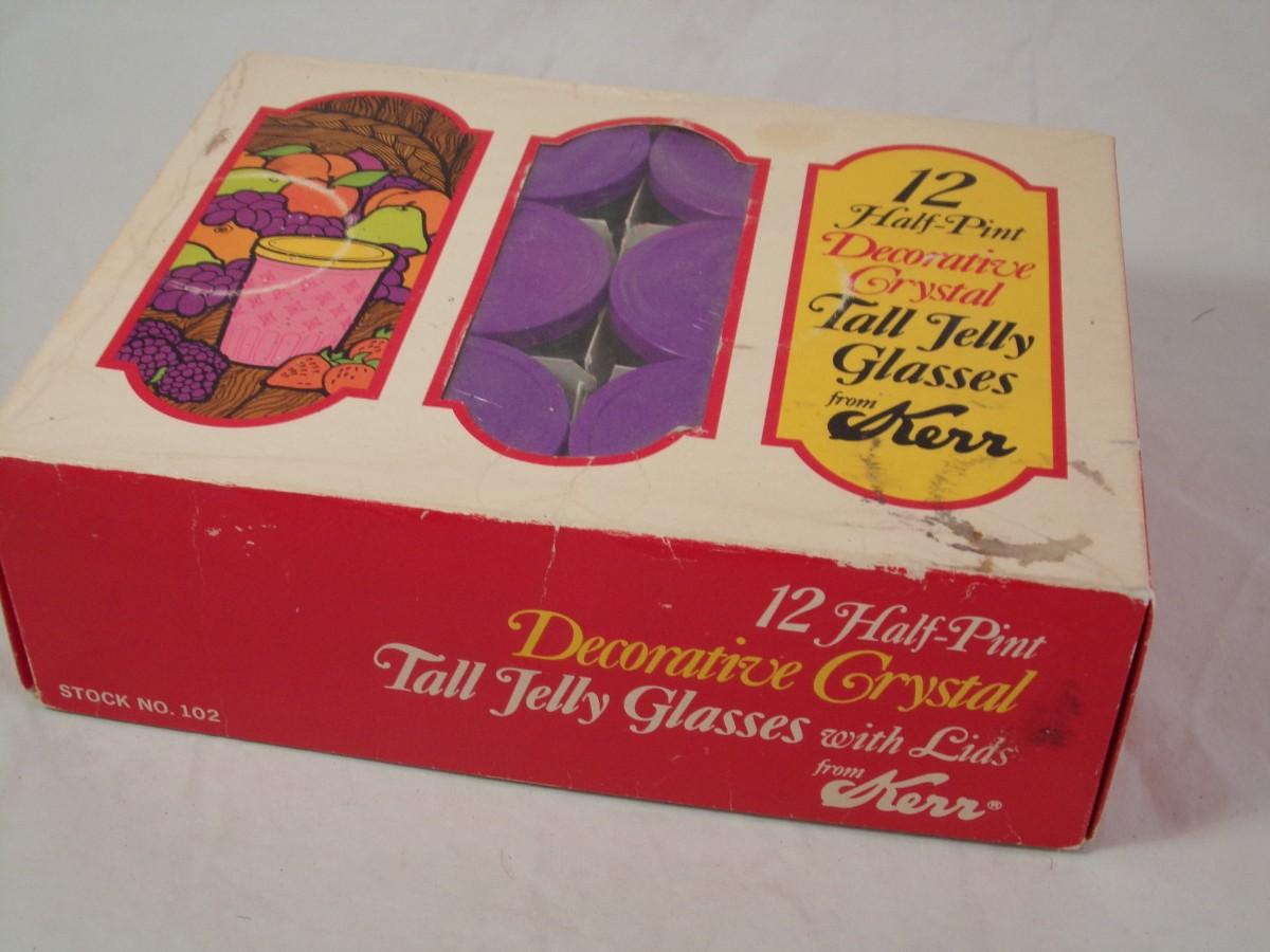 Vintage! Kerr jelly glasses with lids, from the late 60s or early 70s. They have never been used. A dozen in the original box. Pristine and clean. 4-point star pattern on glass. A unique Christmas gift for the collector in the family.