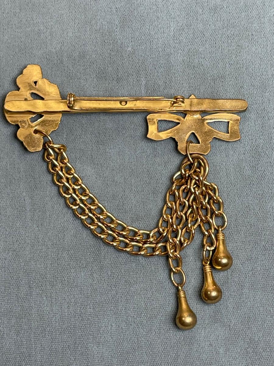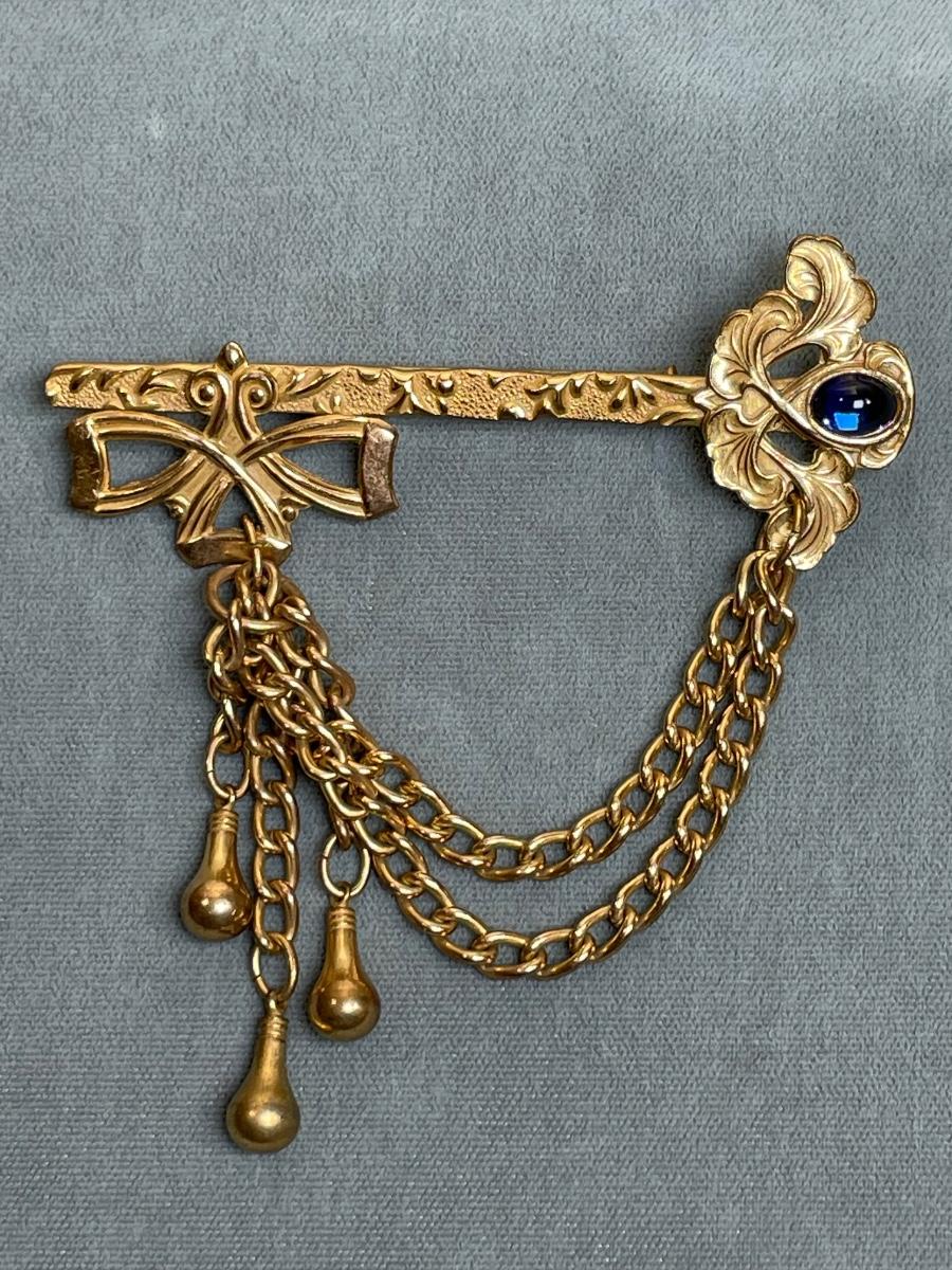 With blue glass stone and chain detail. 3 inches wide and 3 inches long. Excellent condition