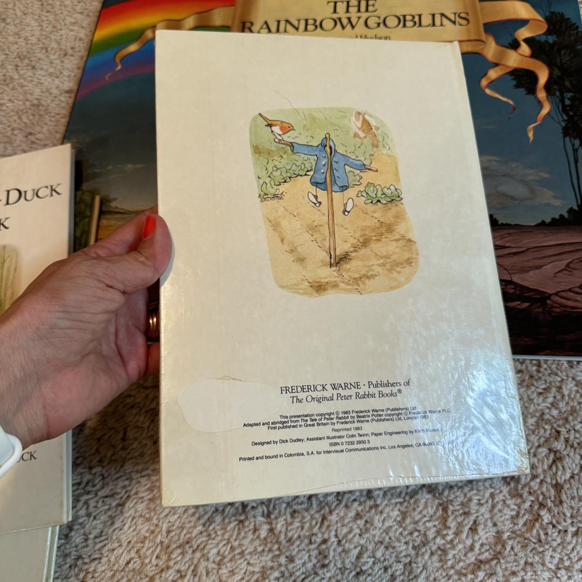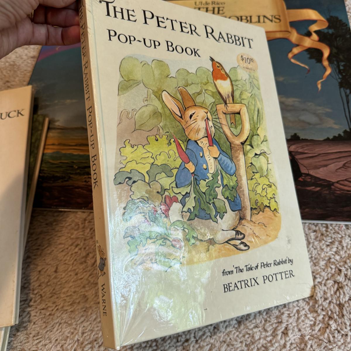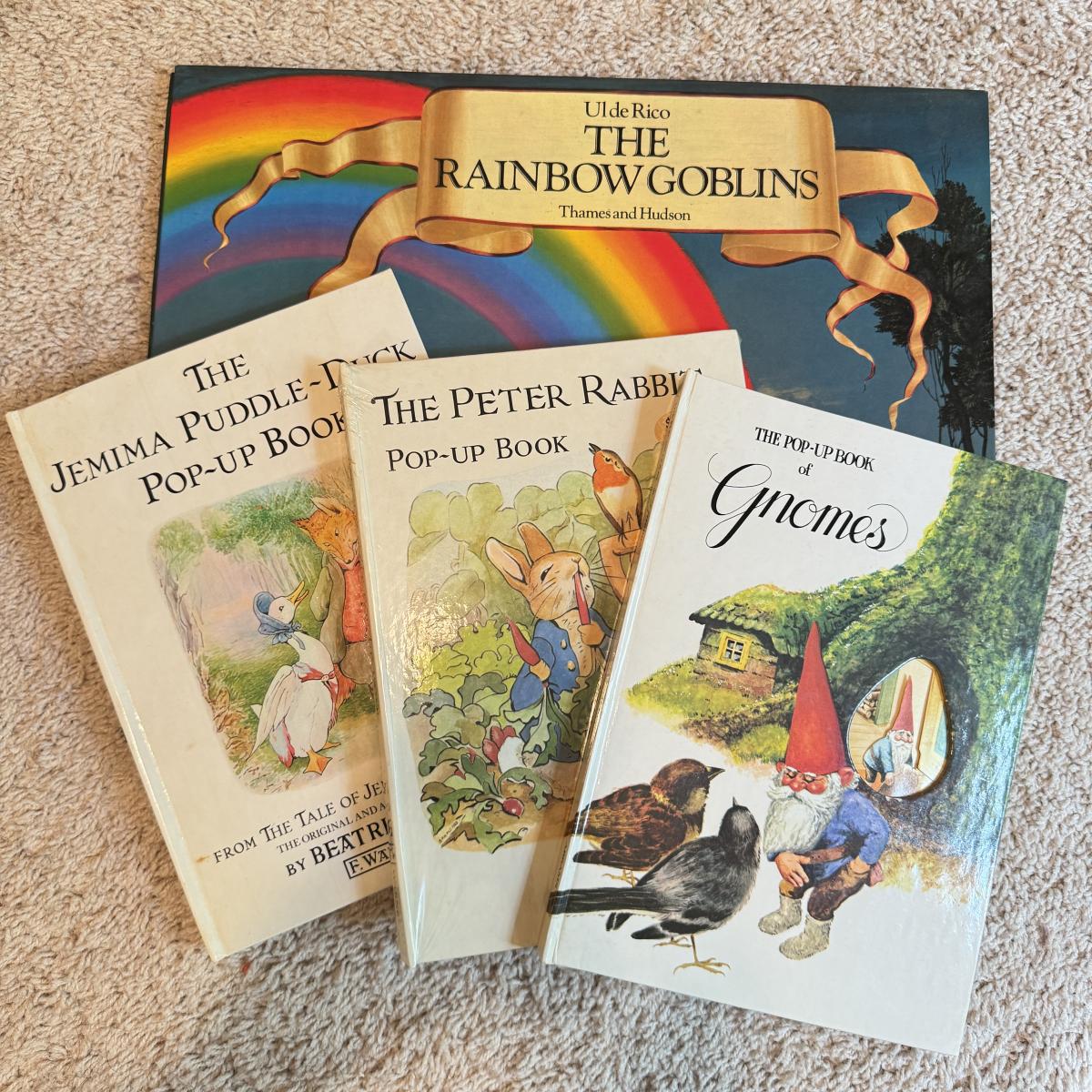 Great collection of vintage kids' books. Includes four pop up books (one still in original plastic), a set of Beatrix Potter books, a large 16.5” by 13.5” The Rainbow Goblins and many other titles. The bindings appear to be in good condition with the exception of the Yogi Bear pop-up book which has a torn spine and also pencil writing in it. Shipping available